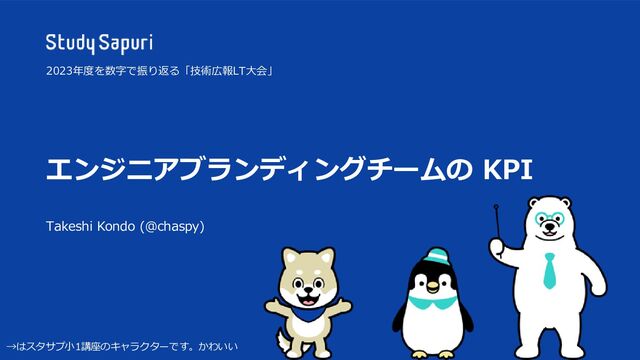 #技術広報の振り返り 2023年度を数字で振り返る「技術広報LT大会」 エンジニアブランディングチームの KPI Takeshi Kondo (@chaspy) 2023年度を数字で振り返る「技術広報LT大会」 →はスタサプ小1講座のキャラクターです。かわいい