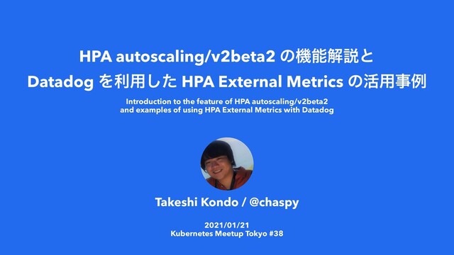to the feature of HPA autoscaling/v2beta2 and examples of using HPA External Metrics with Datadog Takeshi Kondo / @chaspy 2021/01/21 Kubernetes Meetup Tokyo #38