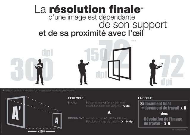 nale d’une image est dépendante * et de sa proximité avec l’œil de son support x N x 200% alors x N = document de travail de travail = Si document final Résolution de l’image Poster format A1 (841 x 594 mm) Résolution nale des images = 72 dpi sur PC: format A3 (420 x 297 mm) Résolution image de travail = > 144 dpi FINAL: LA RÈGLE: L’EXEMPLE: DOCUMENT: Résolution nale = résolution de l’image au format du support imprimé et inversement... * Pierre Chassany