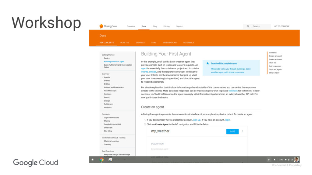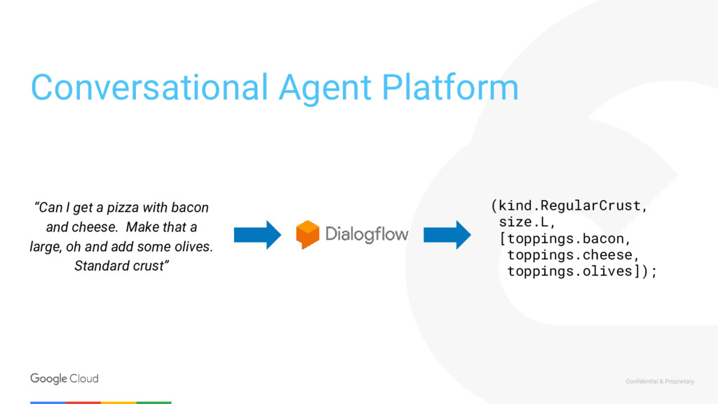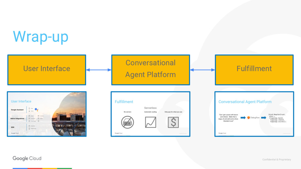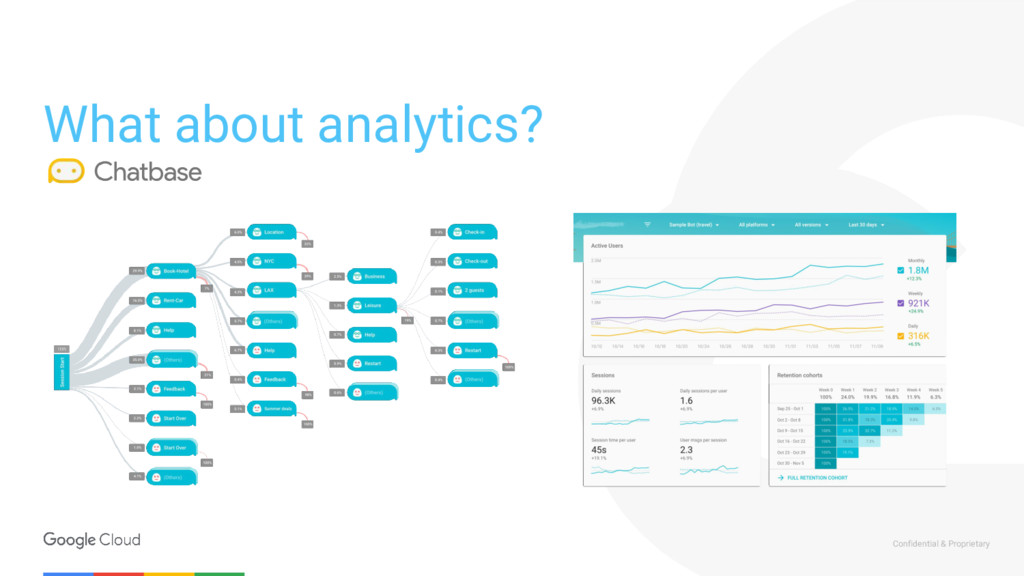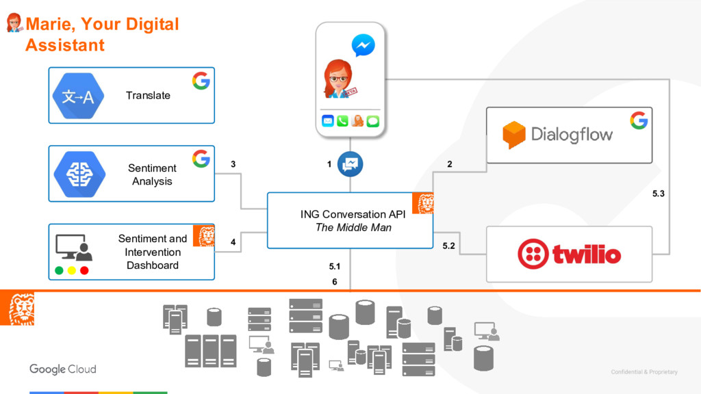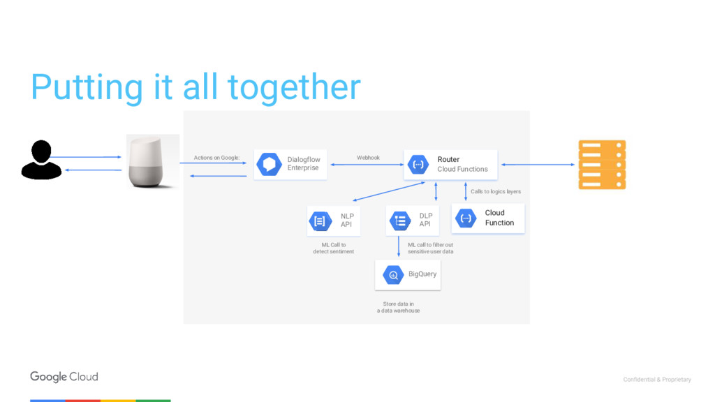 call to filter out sensitive user data Router Cloud Functions Webhook Store data in a data warehouse Calls to logics layers Dialogflow Enterprise Cloud Function NLP API ML Call to detect sentiment Putting it all together