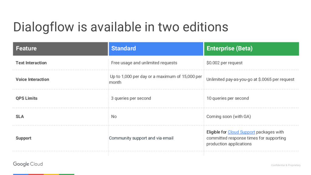 Standard Enterprise (Beta) Text Interaction Free usage and unlimited requests $0.002 per request Voice Interaction Up to 1,000 per day or a maximum of 15,000 per month Unlimited pay-as-you-go at $.0065 per request QPS Limits 3 queries per second 10 queries per second SLA No Coming soon (with GA) Support Community support and via email Eligible for Cloud Support packages with committed response times for supporting production applications