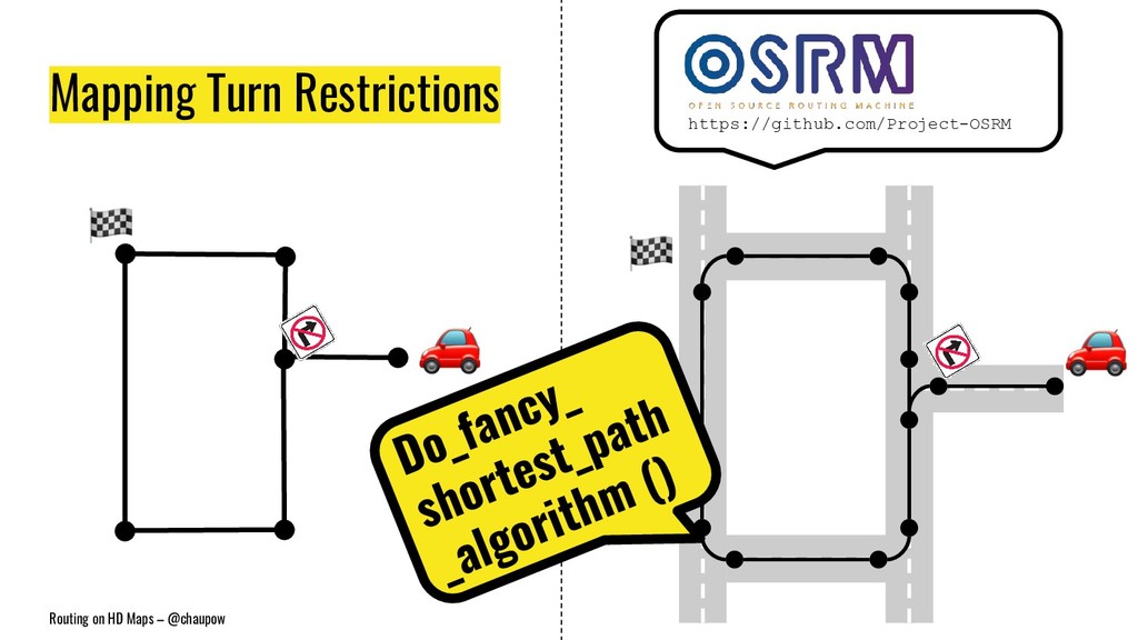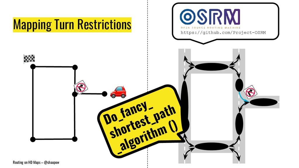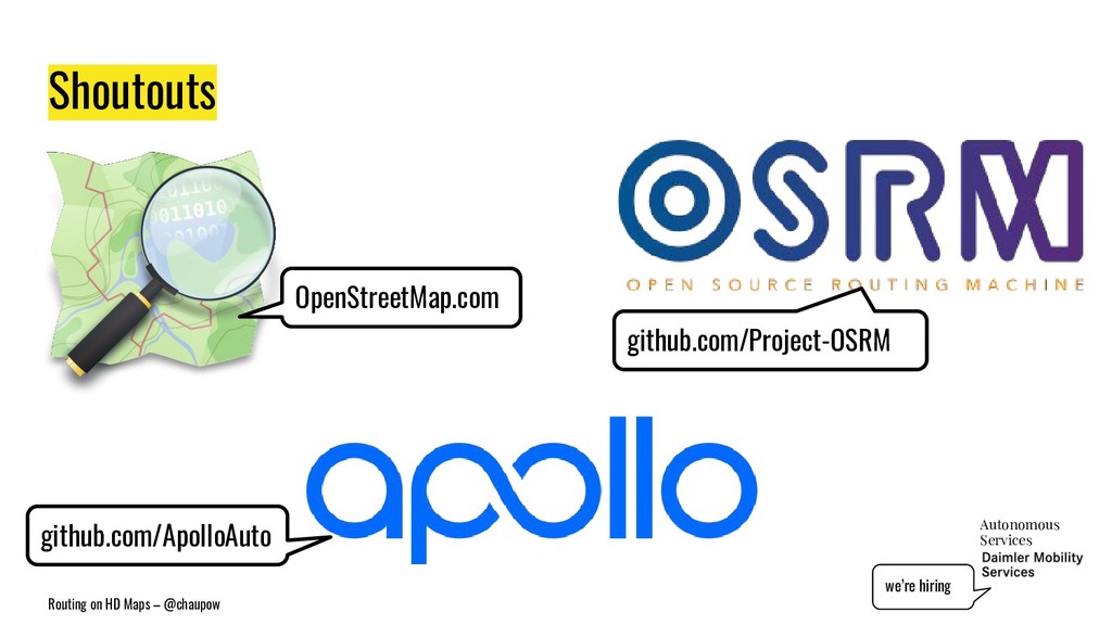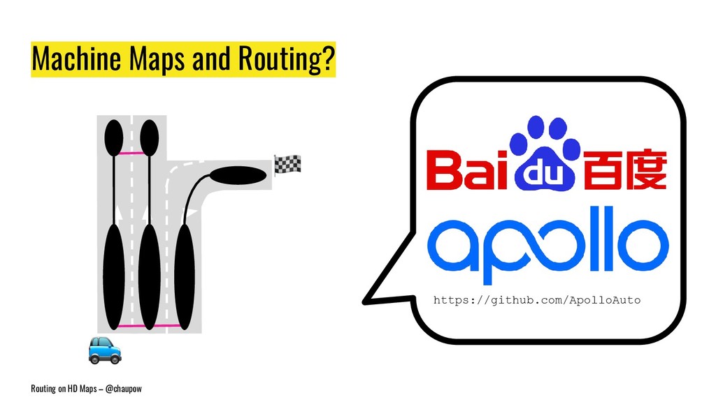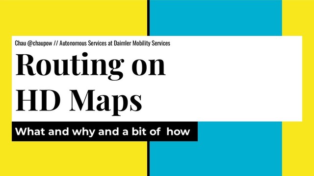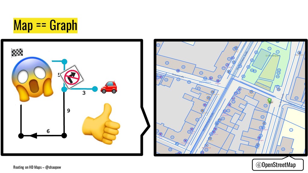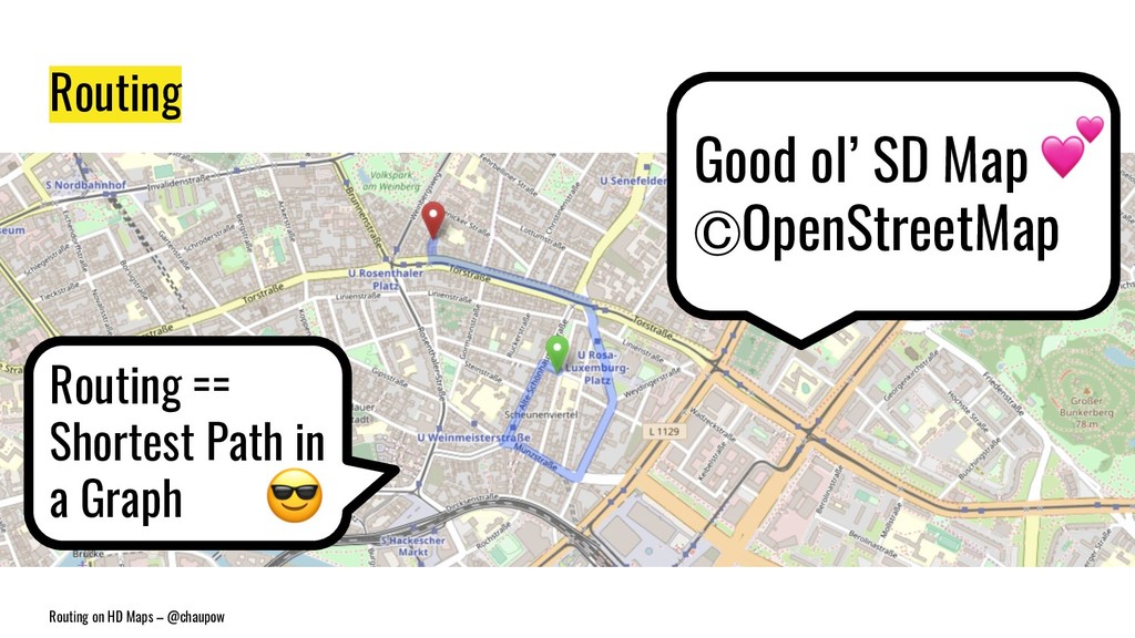 Routing is basically a problem of finding the shortest path in a graph. But how do we get such a graph? I talked about how we build a graph on a conventional map such as OSM based on the example of OSRM. The second example is how Apollo creates a graph based on HD map data to route on.