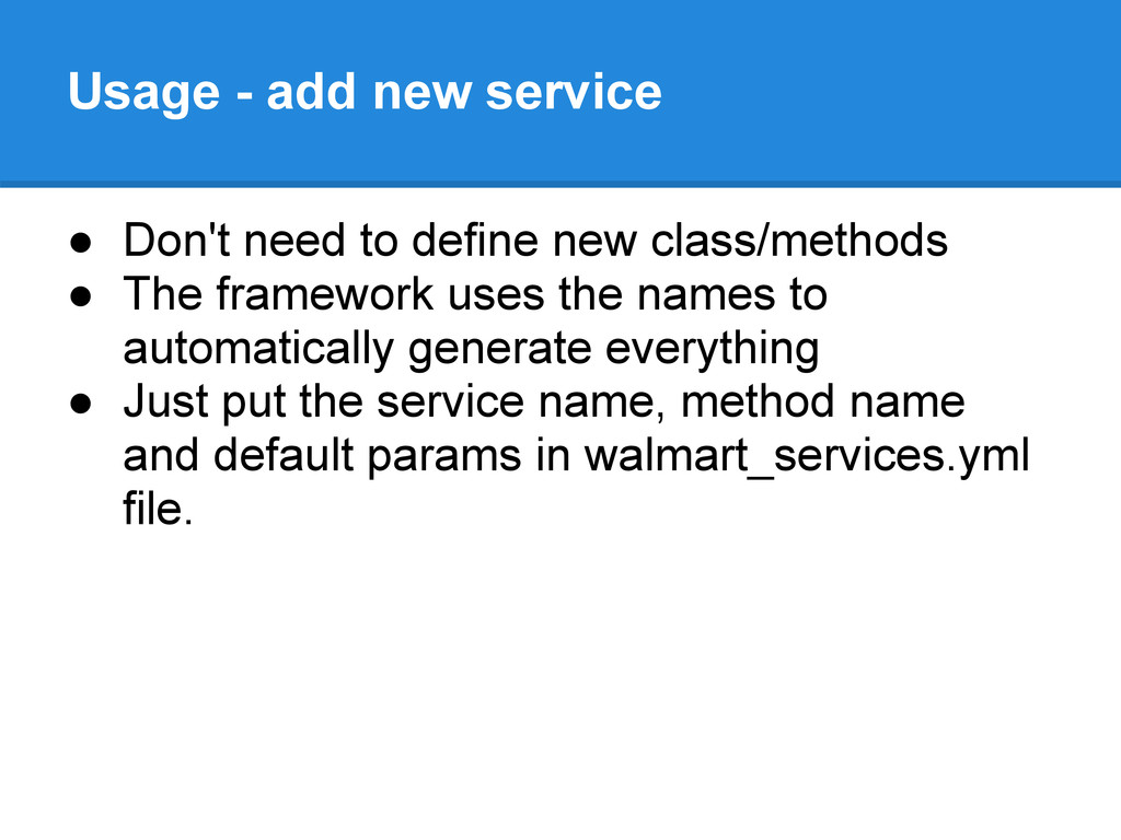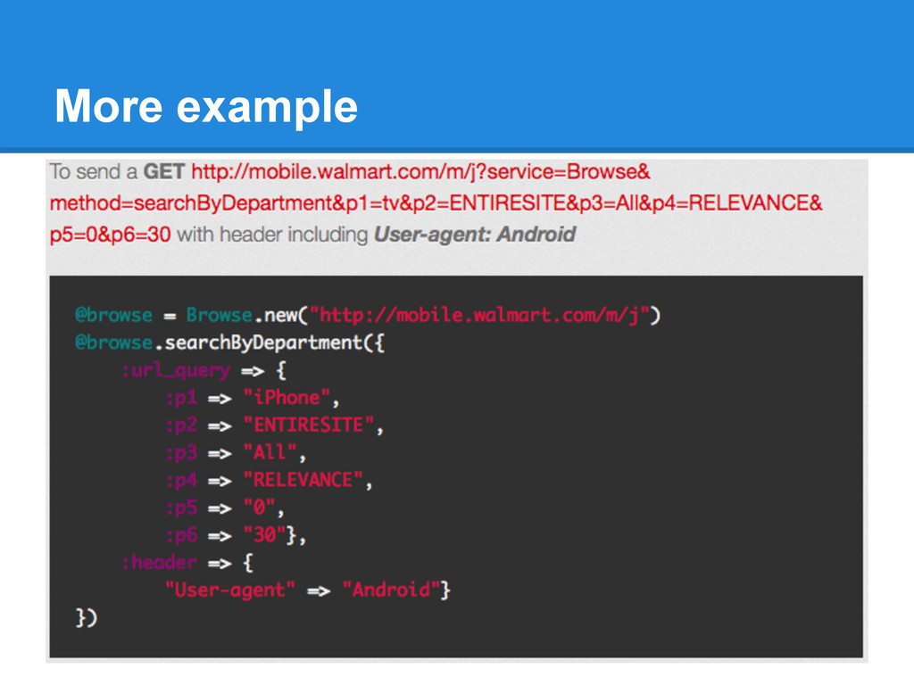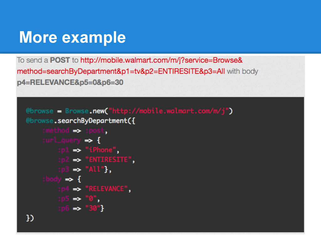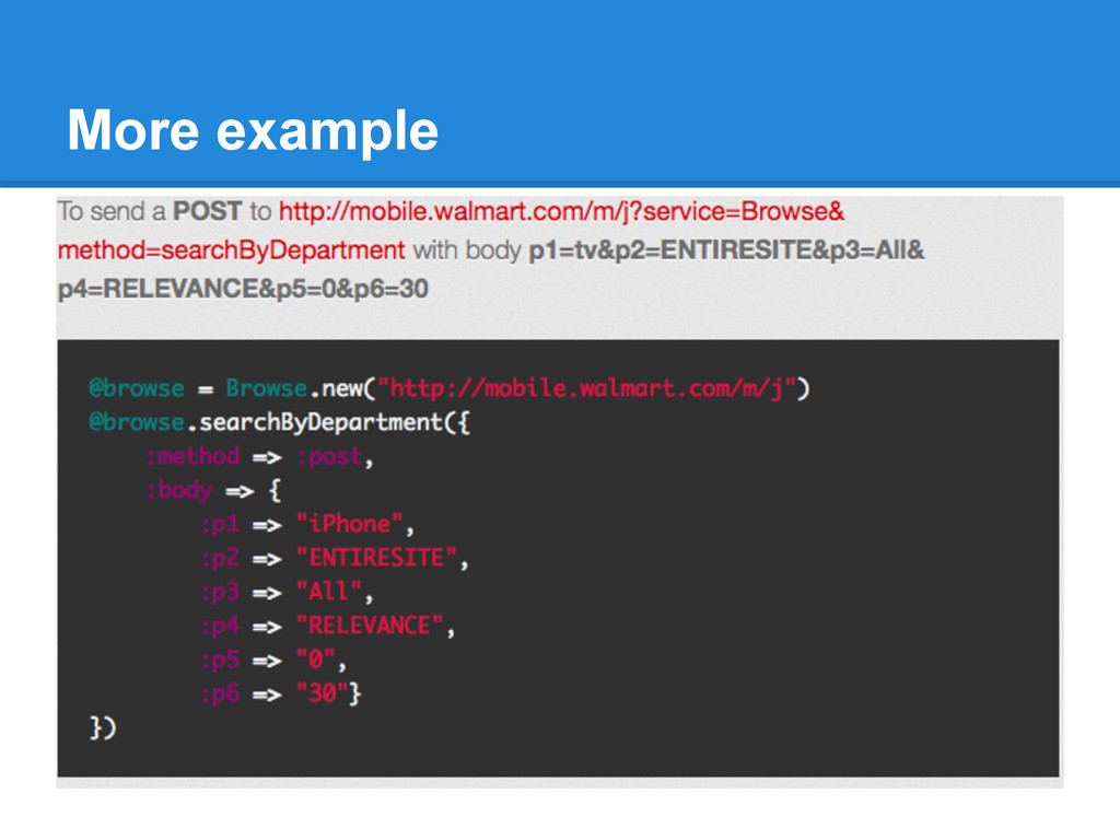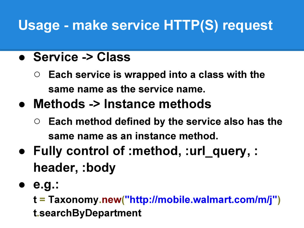 ◦ Each service is wrapped into a class with the same name as the service name. • Methods -> Instance methods ◦ Each method defined by the service also has the same name as an instance method. • Fully control of :method, :url_query, : header, :body • e.g.: t = Taxonomy.new("http://mobile.walmart.com/m/j") t.searchByDepartment