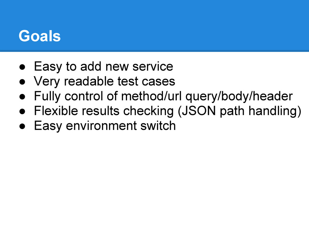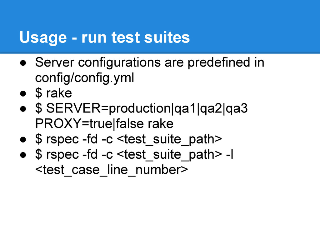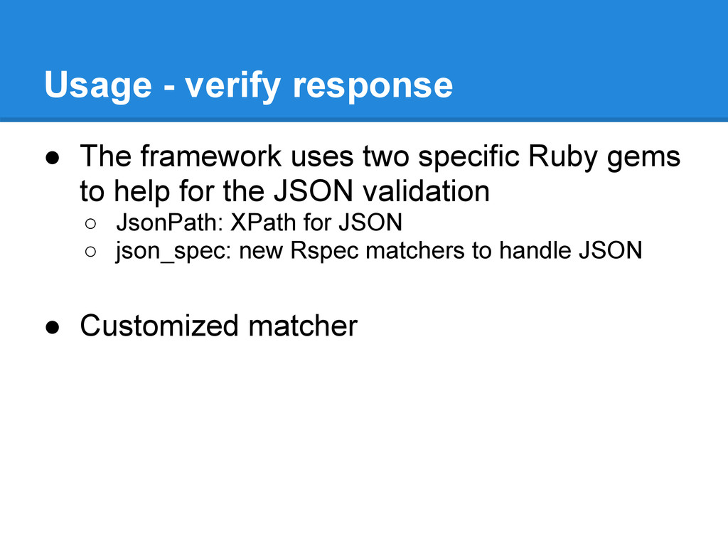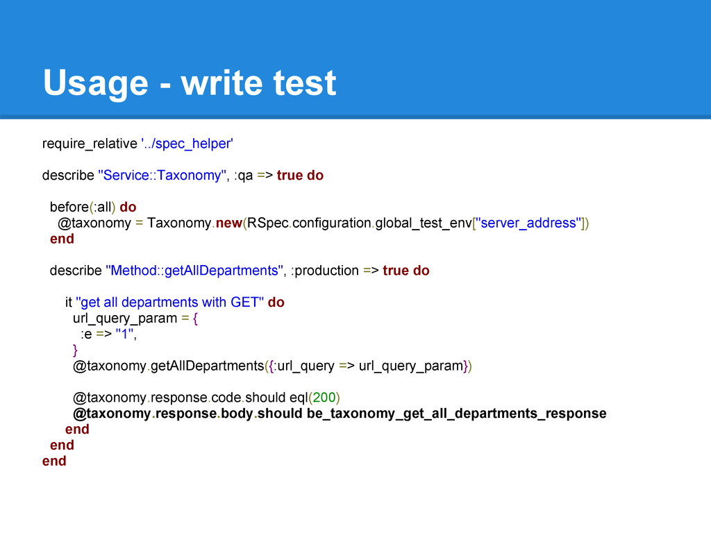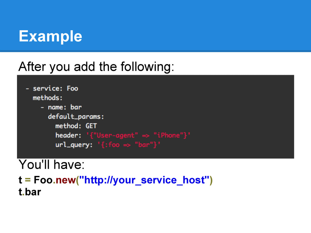 ◦ Each service is wrapped into a class with the same name as the service name. • Methods -> Instance methods ◦ Each method defined by the service also has the same name as an instance method. • Fully control of :method, :url_query, : header, :body • e.g.: t = Taxonomy.new("http://mobile.walmart.com/m/j") t.searchByDepartment
