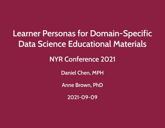 This is a talk intended for data science educators and the education community. We adapted surveys from The Carpentries, “How Learning Works”, and “Teaching Tech Together” to create a learner self-assessment survey to discover learner personas in the biomedical sciences by clustering survey results. These personas and findings were used to create a data science curriculum that is grounded in data literacy topics around spreadsheets and good data practices.