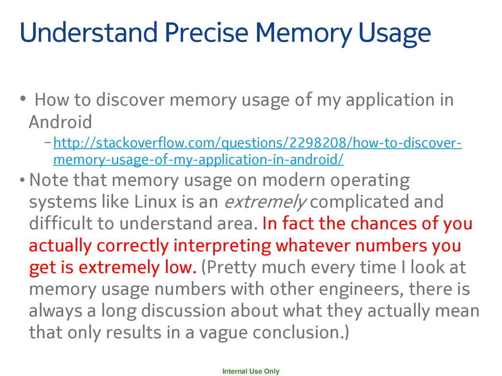 discover memory usage of my application in Android −http://stackoverflow.com/questions/2298208/how-to-discover- memory-usage-of-my-application-in-android/ • Note that memory usage on modern operating systems like Linux is an extremely complicated and difficult to understand area. In fact the chances of you actually correctly interpreting whatever numbers you get is extremely low. (Pretty much every time I look at memory usage numbers with other engineers, there is always a long discussion about what they actually mean that only results in a vague conclusion.)
