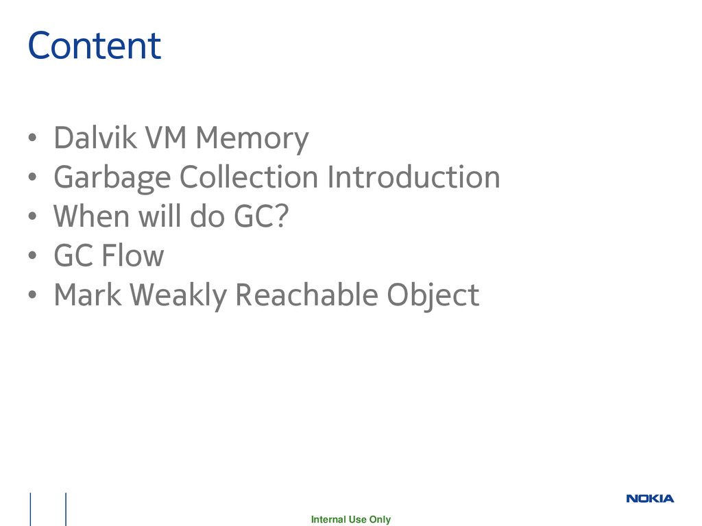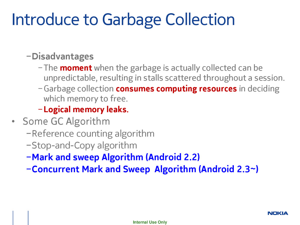 when the garbage is actually collected can be unpredictable, resulting in stalls scattered throughout a session. −Garbage collection consumes computing resources in deciding which memory to free. −Logical memory leaks. • Some GC Algorithm −Reference counting algorithm −Stop-and-Copy algorithm −Mark and sweep Algorithm (Android 2.2) −Concurrent Mark and Sweep Algorithm (Android 2.3~)