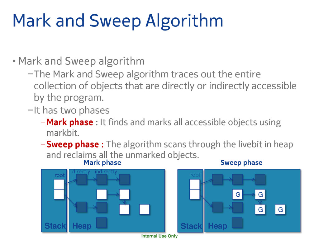 Sweep algorithm −The Mark and Sweep algorithm traces out the entire collection of objects that are directly or indirectly accessible by the program. −It has two phases −Mark phase : It finds and marks all accessible objects using markbit. −Sweep phase : The algorithm scans through the livebit in heap and reclaims all the unmarked objects. Stack Stack Heap Heap G G G G root root directly indirectly Mark phase Sweep phase