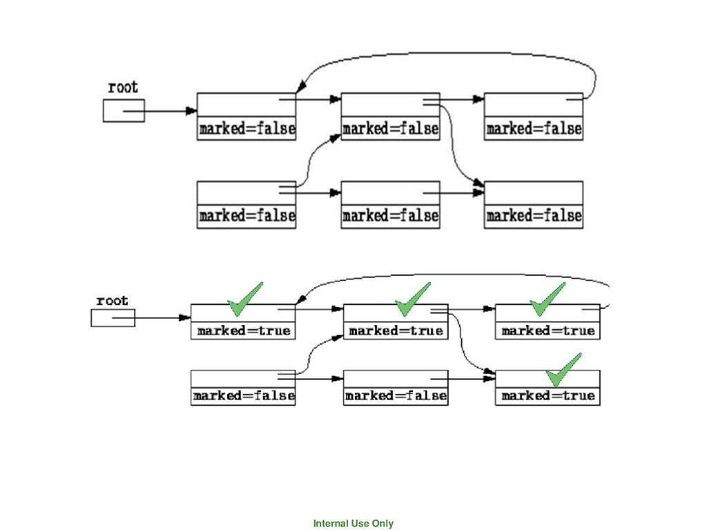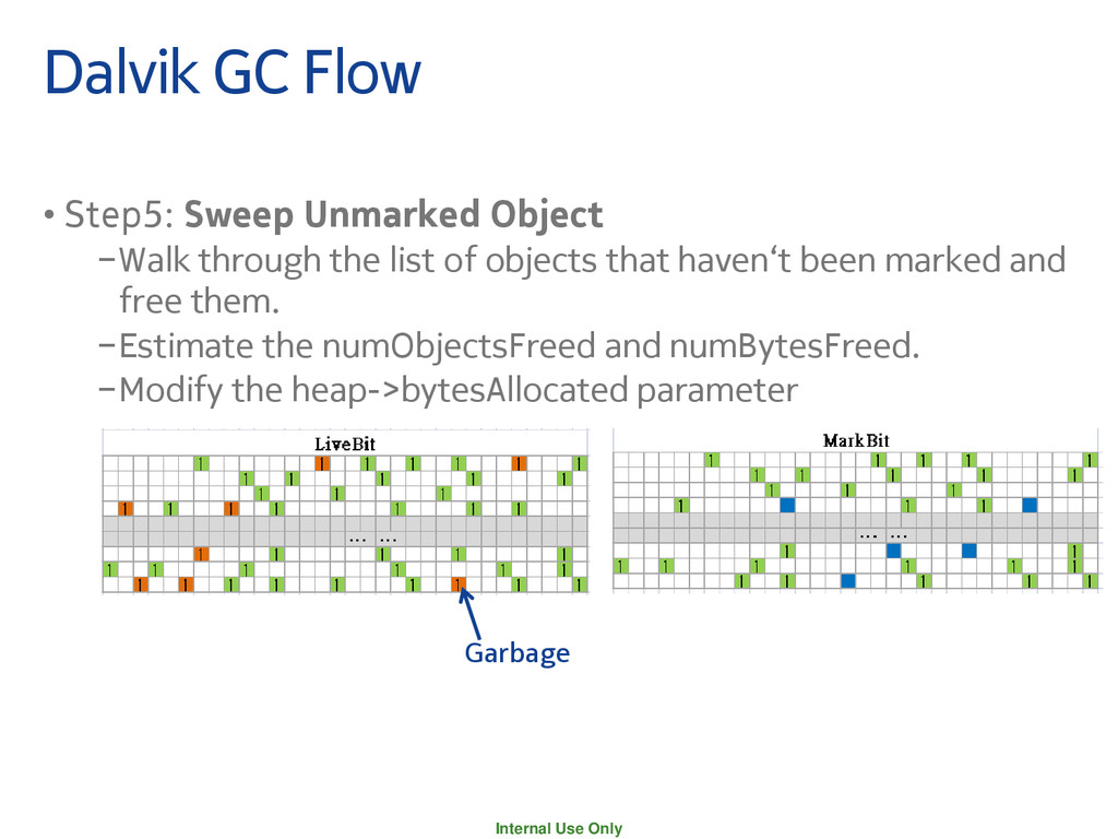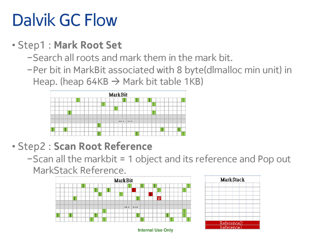 Root Set −Search all roots and mark them in the mark bit. −Per bit in MarkBit associated with 8 byte(dlmalloc min unit) in Heap. (heap 64KB Mark bit table 1KB) • Step2 : Scan Root Reference −Scan all the markbit = 1 object and its reference and Pop out MarkStack Reference.