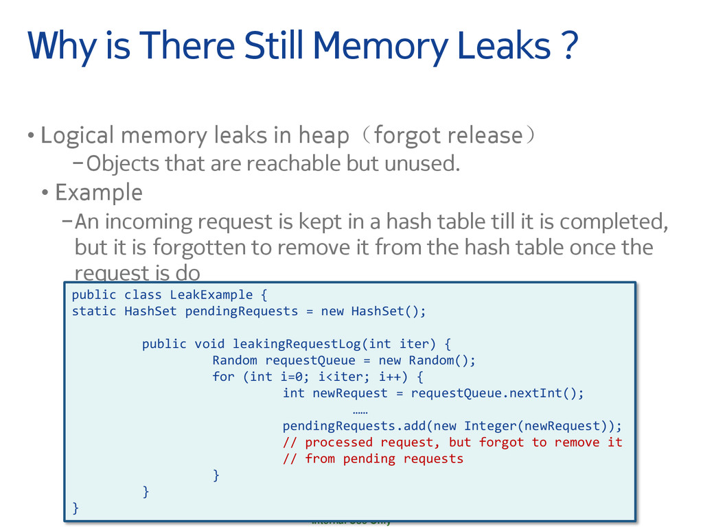 • Logical memory leaks in heap(forgot release) −Objects that are reachable but unused. • Example −An incoming request is kept in a hash table till it is completed, but it is forgotten to remove it from the hash table once the request is do public class LeakExample { static HashSet pendingRequests = new HashSet(); public void leakingRequestLog(int iter) { Random requestQueue = new Random(); for (int i=0; i<iter; i++) { int newRequest = requestQueue.nextInt(); …… pendingRequests.add(new Integer(newRequest)); // processed request, but forgot to remove it // from pending requests } } }