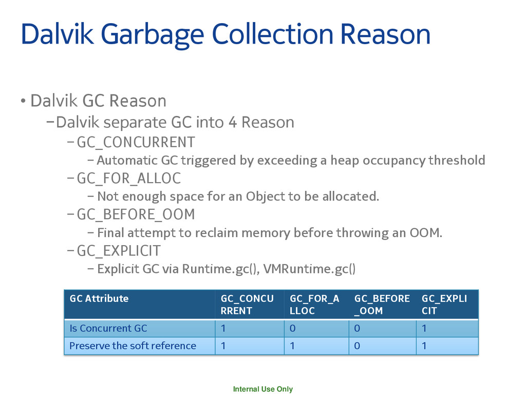 into 4 Reason −GC_CONCURRENT − Automatic GC triggered by exceeding a heap occupancy threshold −GC_FOR_ALLOC − Not enough space for an Object to be allocated. −GC_BEFORE_OOM − Final attempt to reclaim memory before throwing an OOM. −GC_EXPLICIT − Explicit GC via Runtime.gc(), VMRuntime.gc() GC Attribute GC_CONCU RRENT GC_FOR_A LLOC GC_BEFORE _OOM GC_EXPLI CIT Is Concurrent GC 1 0 0 1 Preserve the soft reference 1 1 0 1 Dalvik Garbage Collection Reason