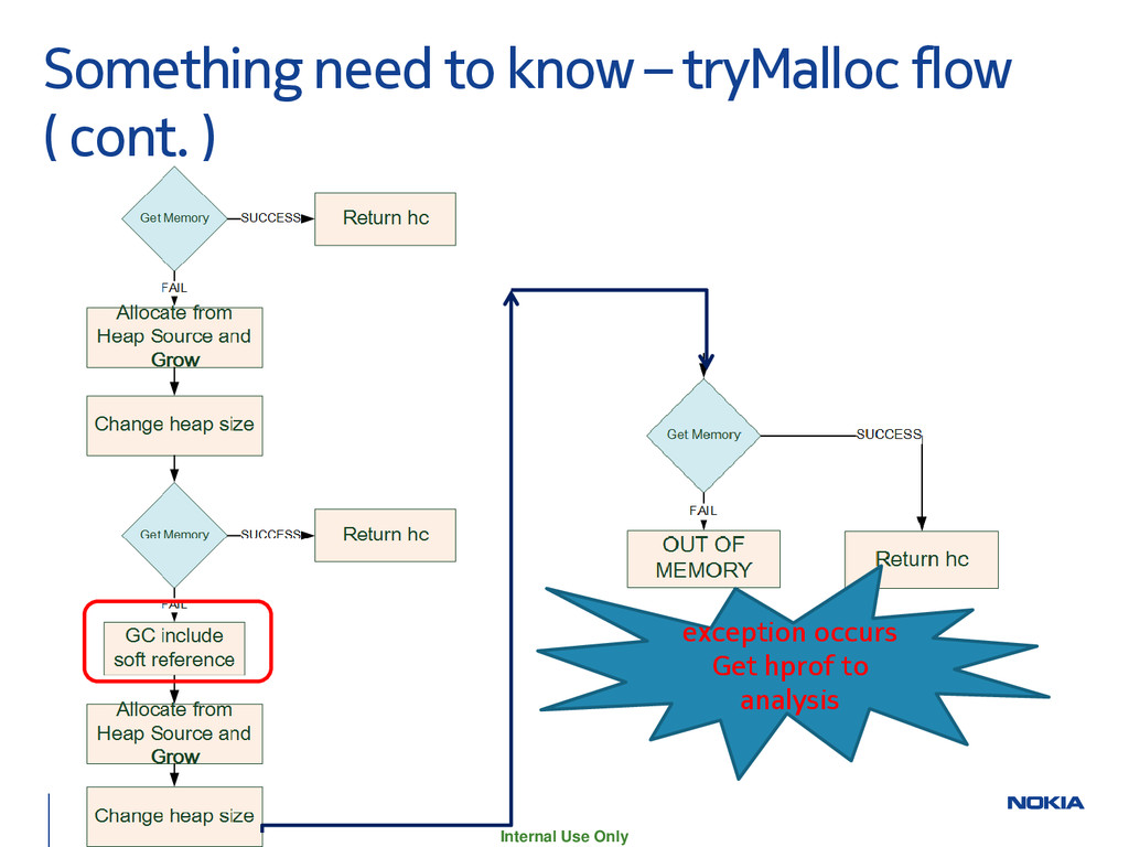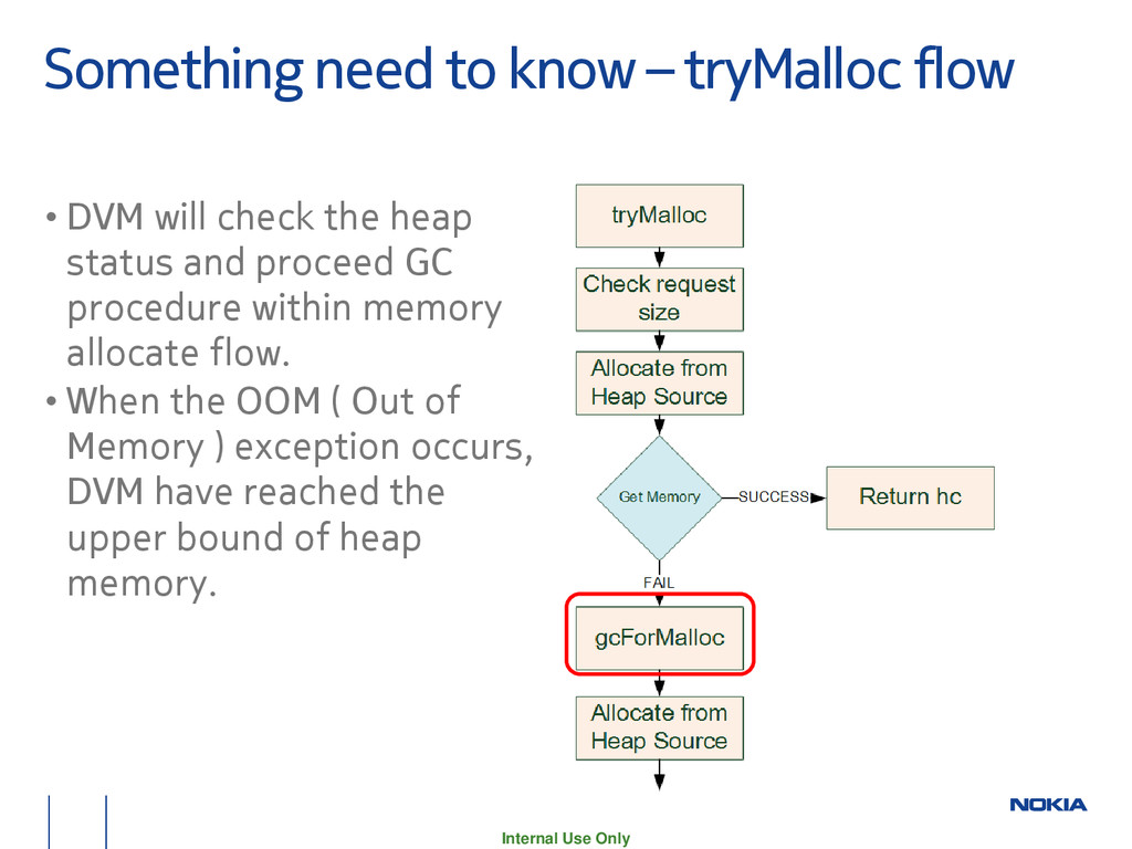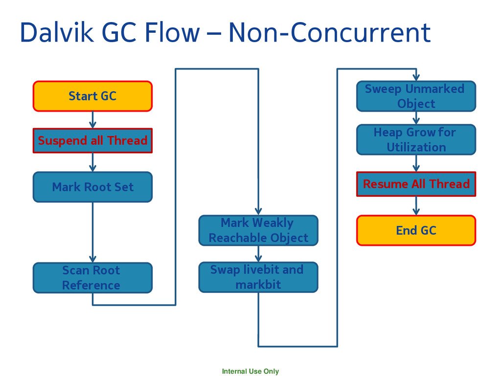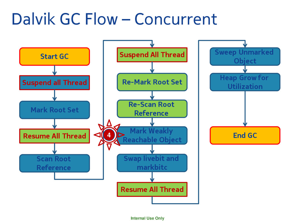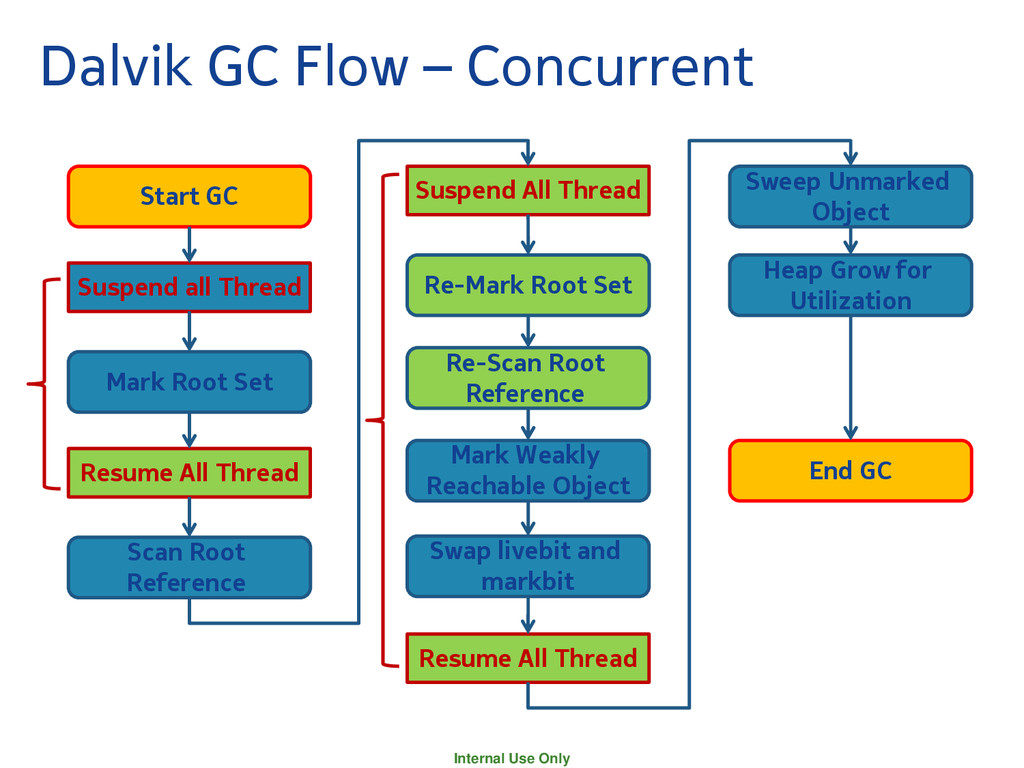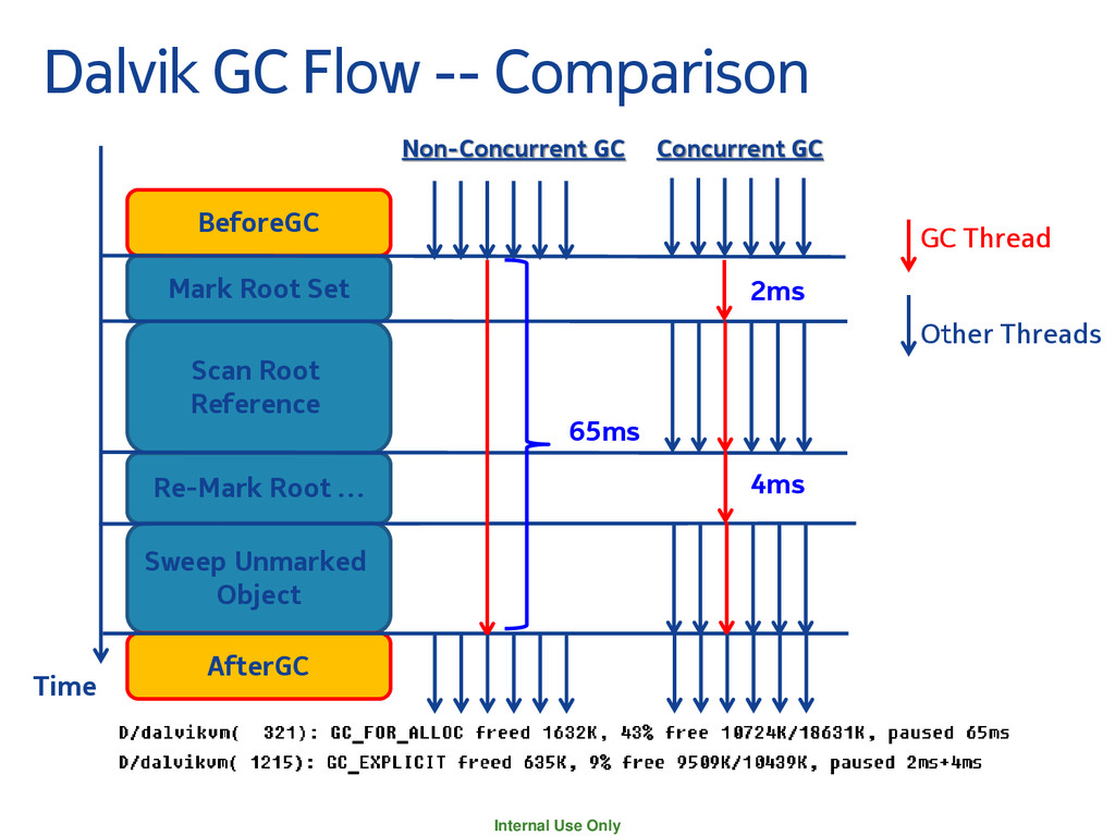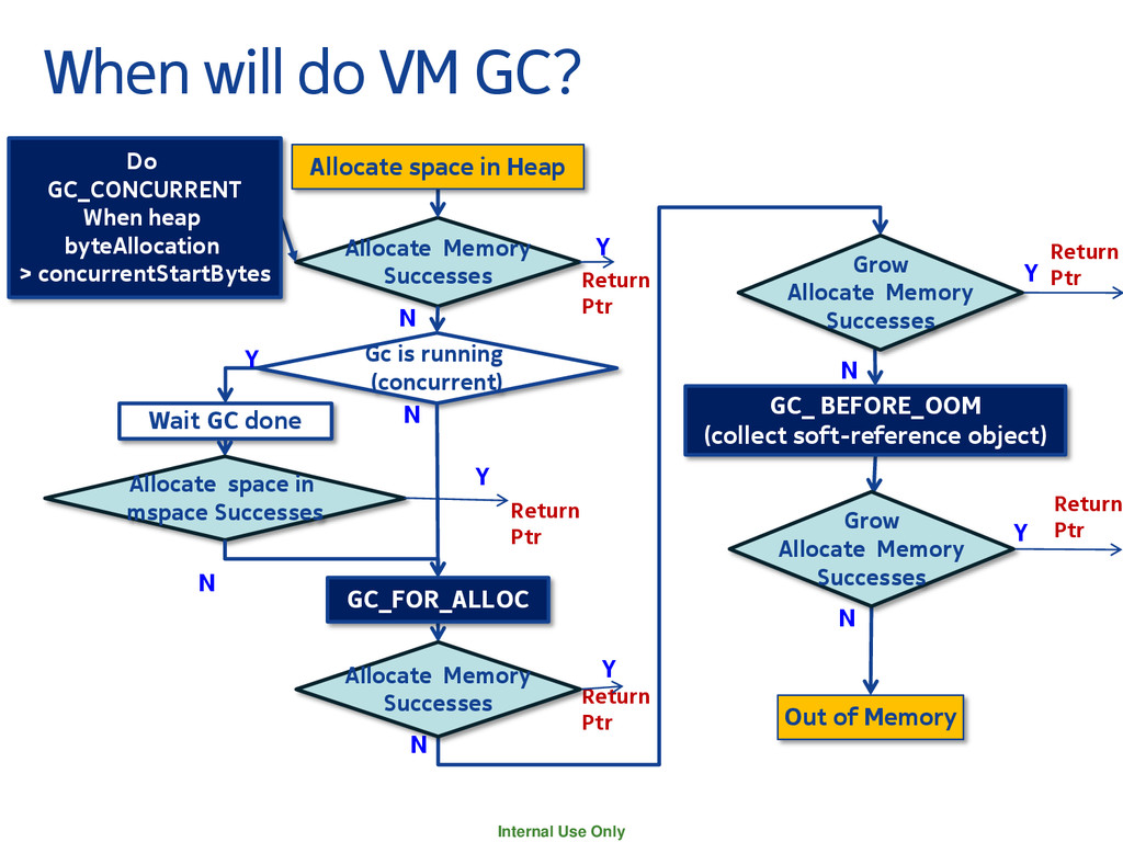 Allocate Memory Successes N Y Gc is running (concurrent) N N N Y N Out of Memory Wait GC done Y N GC_FOR_ALLOC GC_ BEFORE_OOM (collect soft-reference object) Allocate space in Heap Do GC_CONCURRENT When heap byteAllocation > concurrentStartBytes Return Ptr Return Ptr Y Return Ptr Y Y Allocate space in mspace Successes Allocate Memory Successes Grow Allocate Memory Successes Grow Allocate Memory Successes Return Ptr