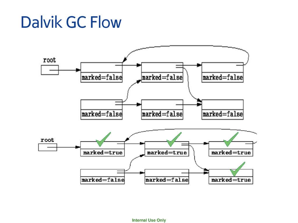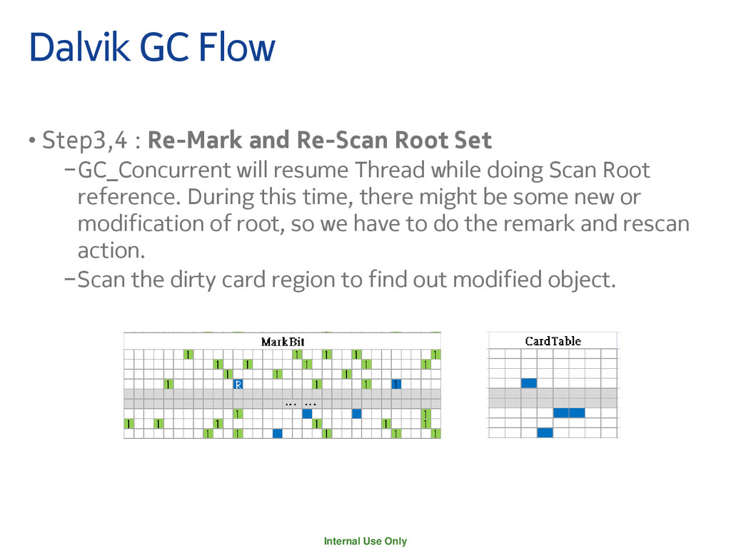 Bits −Android creates some memory bits for recording objects and temporary storage memory for garbage collection. − Live bit : Live bit is set to 1 when allocating object in the related address. − Mark bit, Mark stack, Card table :they are used in the GC flow. (see details below) −JIT Code Cache −Jit compiler are translated java program into machine code instructions; The compiled code is placed into JIT code cache. Linear Allocation Heap class data My object Stacks cat MyObject cat; cat = new Myobject(); Livebit 1 Share among Threads