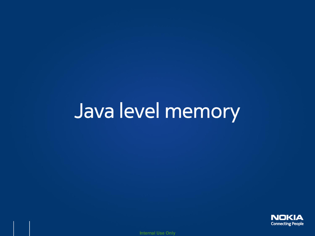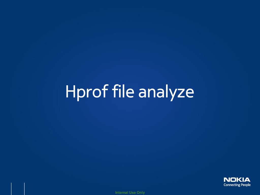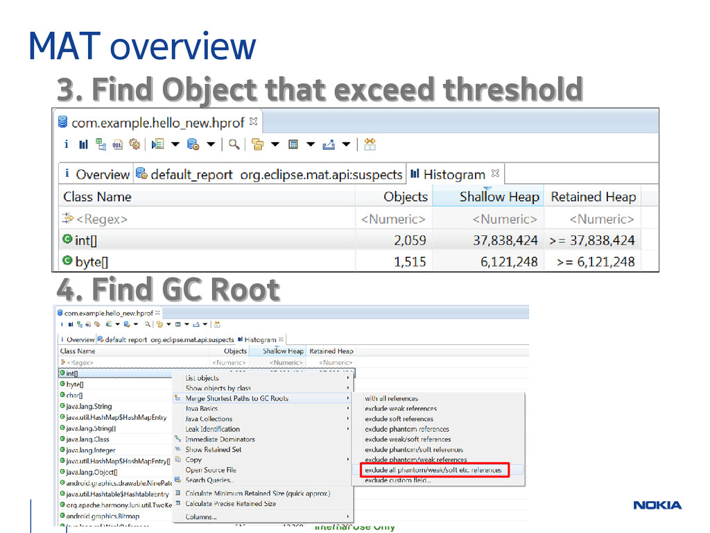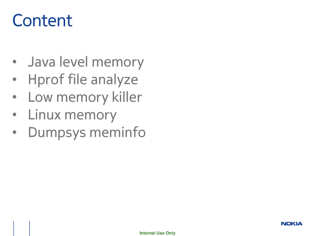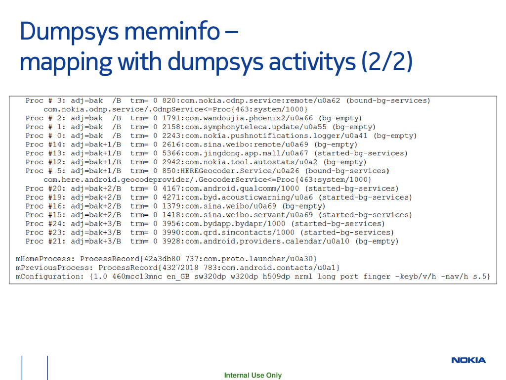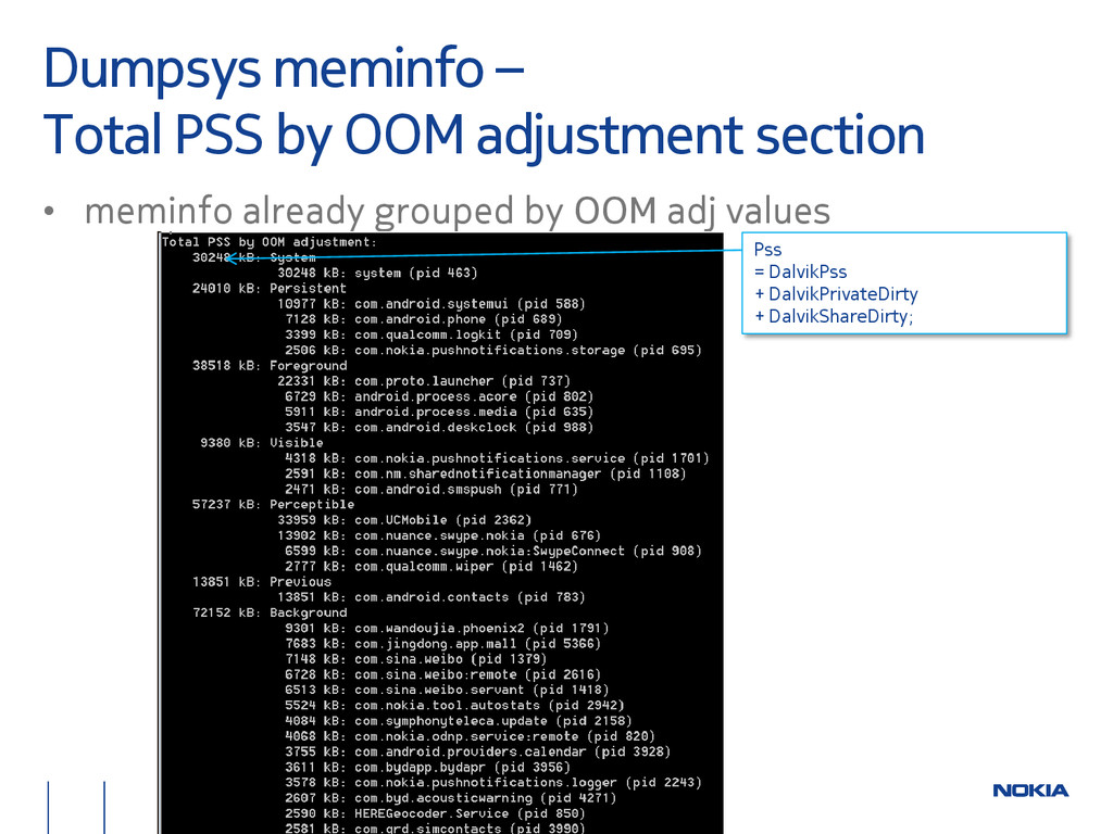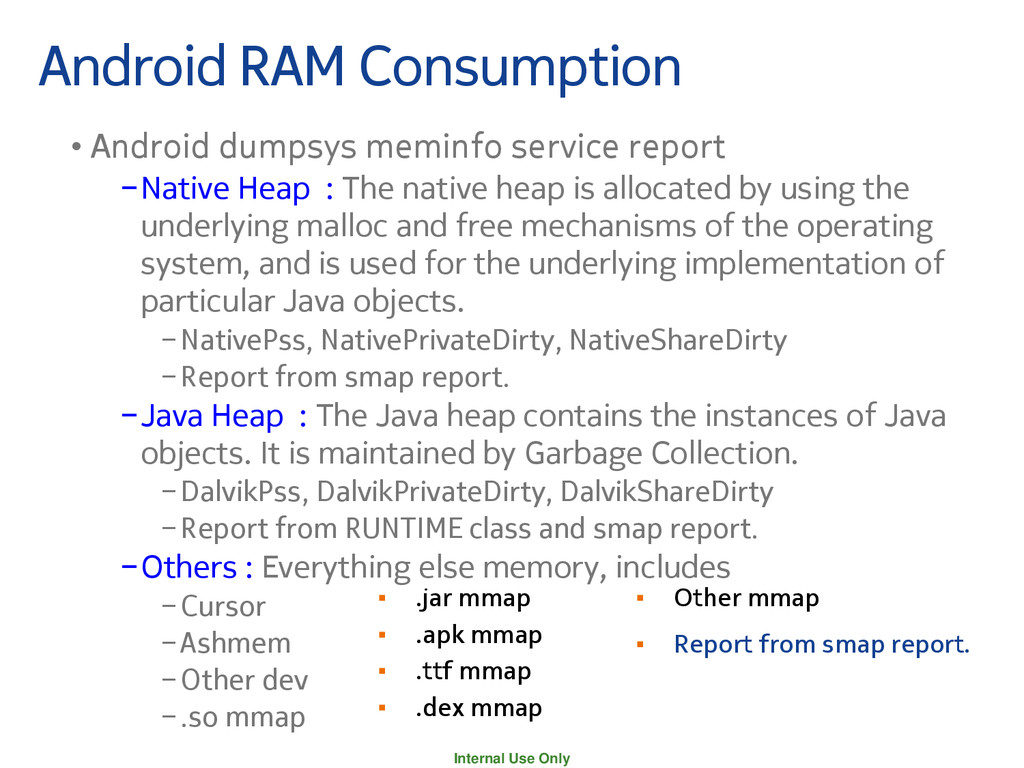 service report −Native Heap : The native heap is allocated by using the underlying malloc and free mechanisms of the operating system, and is used for the underlying implementation of particular Java objects. −NativePss, NativePrivateDirty, NativeShareDirty −Report from smap report. −Java Heap : The Java heap contains the instances of Java objects. It is maintained by Garbage Collection. −DalvikPss, DalvikPrivateDirty, DalvikShareDirty −Report from RUNTIME class and smap report. −Others : Everything else memory, includes −Cursor −Ashmem −Other dev −.so mmap ▪ .jar mmap ▪ .apk mmap ▪ .ttf mmap ▪ .dex mmap ▪ Other mmap ▪ Report from smap report.
