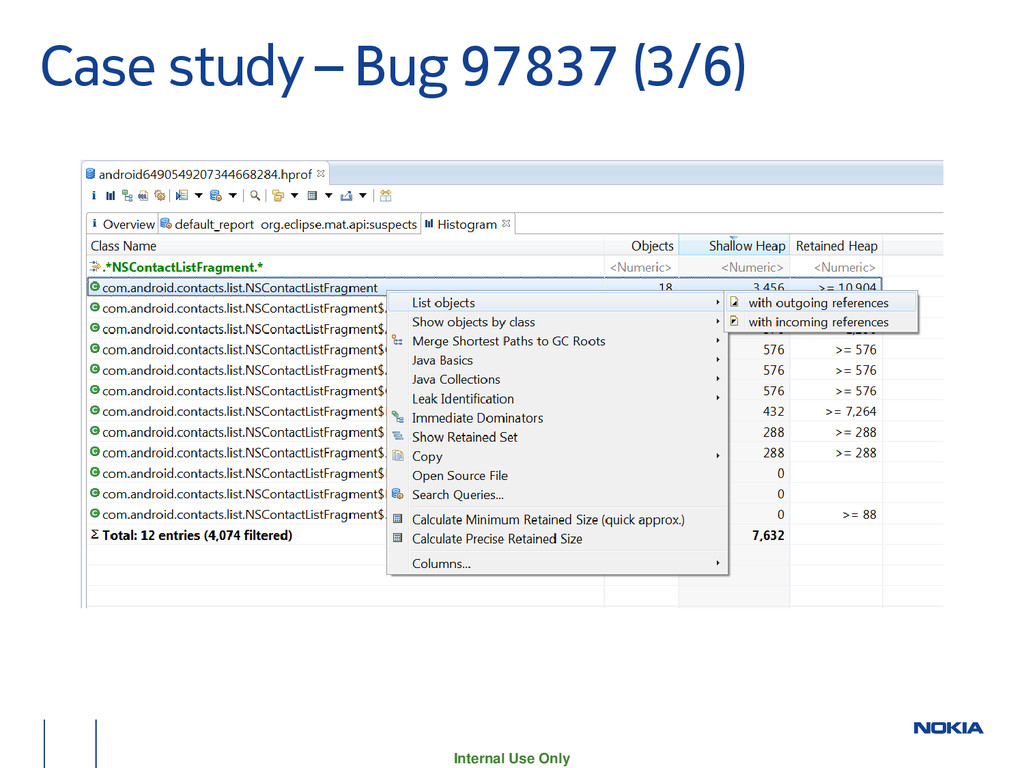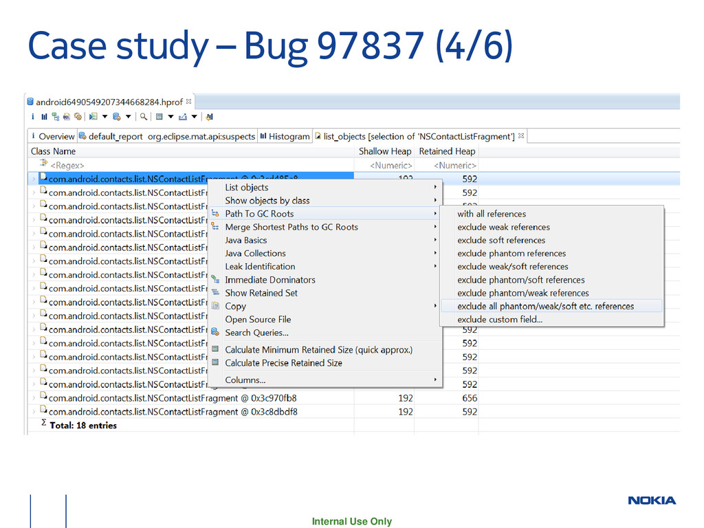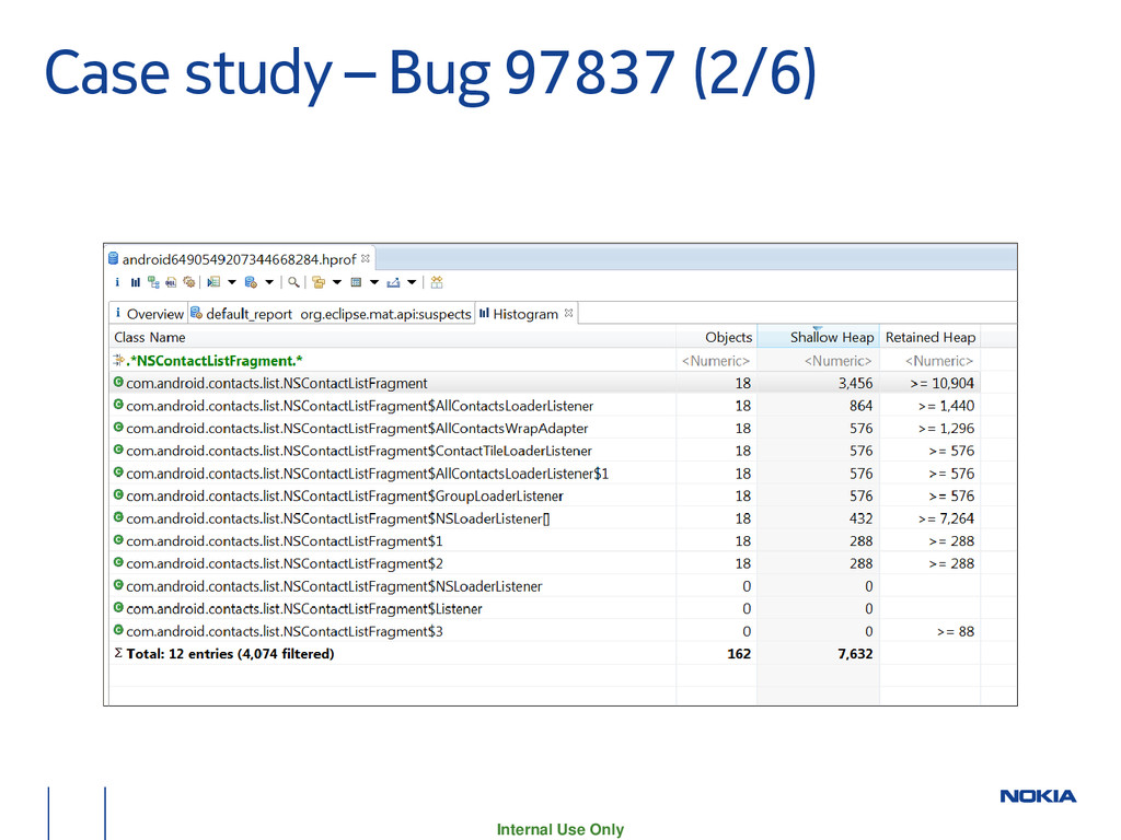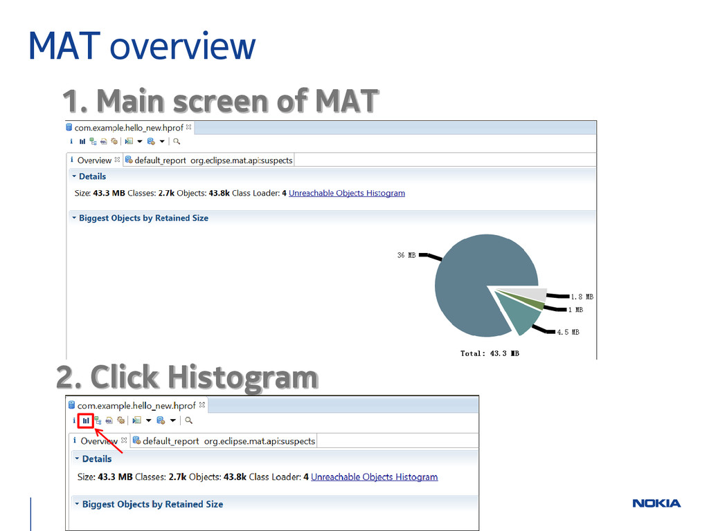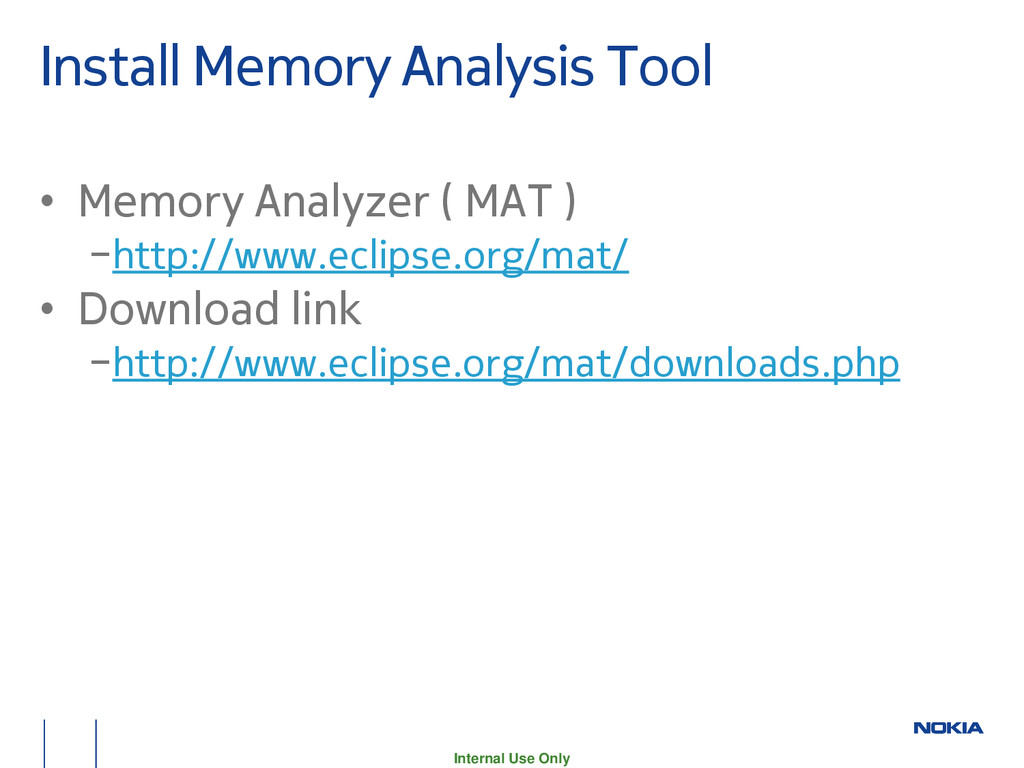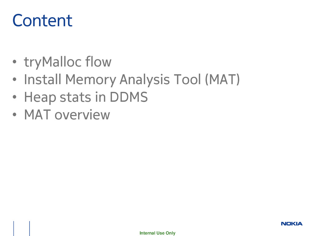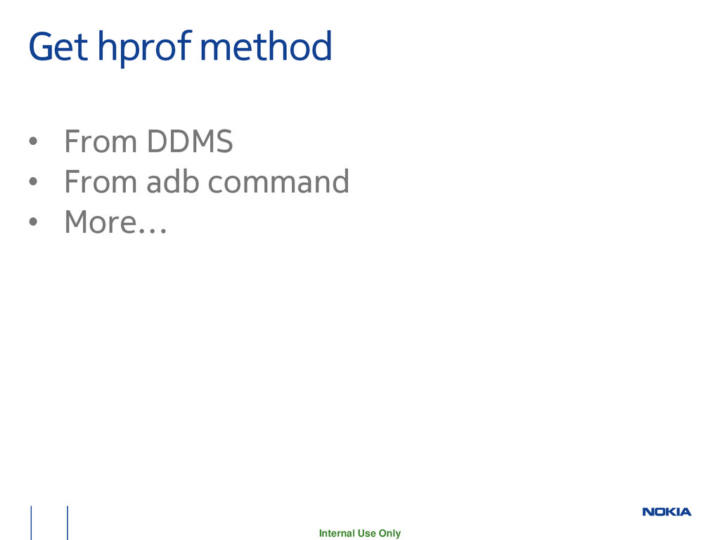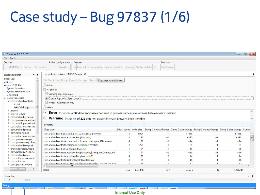 service report −Native Heap : The native heap is allocated by using the underlying malloc and free mechanisms of the operating system, and is used for the underlying implementation of particular Java objects. −NativePss, NativePrivateDirty, NativeShareDirty −Report from smap report. −Java Heap : The Java heap contains the instances of Java objects. It is maintained by Garbage Collection. −DalvikPss, DalvikPrivateDirty, DalvikShareDirty −Report from RUNTIME class and smap report. −Others : Everything else memory, includes −Cursor −Ashmem −Other dev −.so mmap ▪ .jar mmap ▪ .apk mmap ▪ .ttf mmap ▪ .dex mmap ▪ Other mmap ▪ Report from smap report.