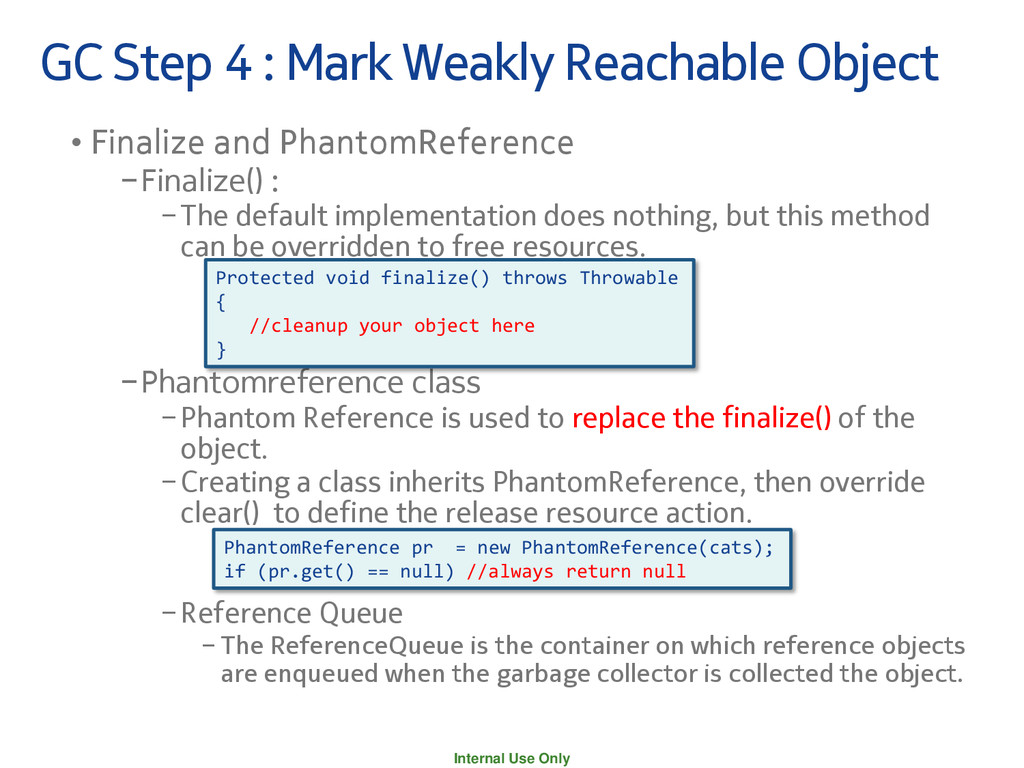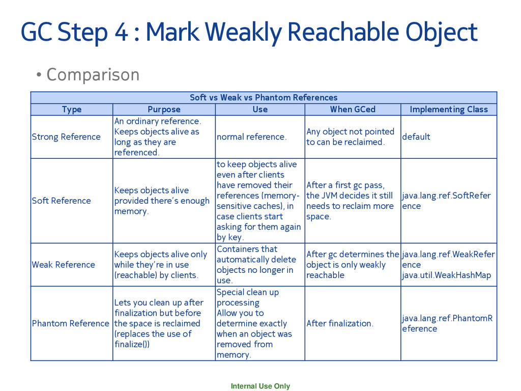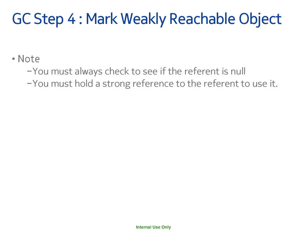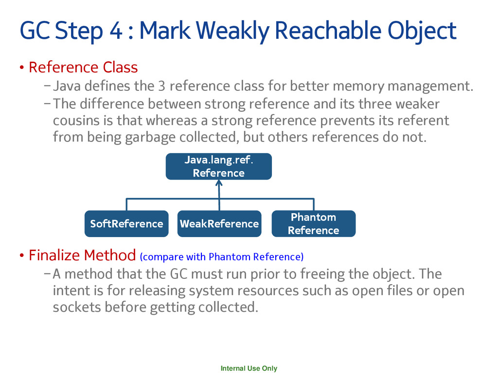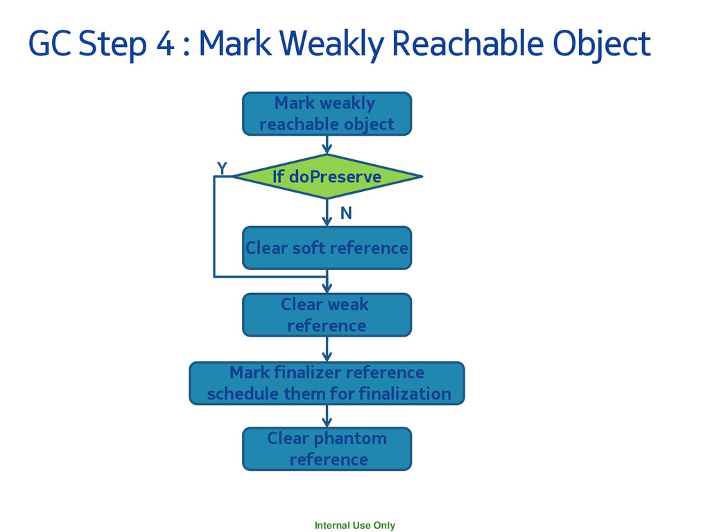 Object Mark weakly reachable object If doPreserve Clear soft reference Clear weak reference Mark finalizer reference schedule them for finalization Clear phantom reference Y N