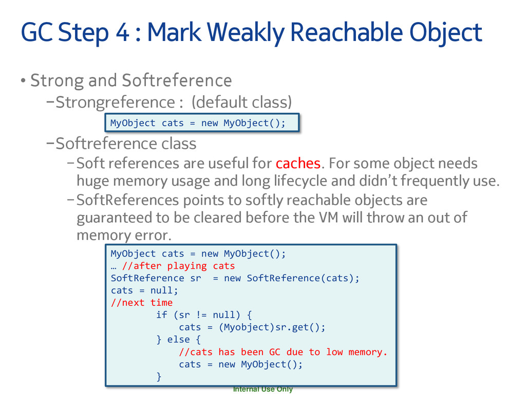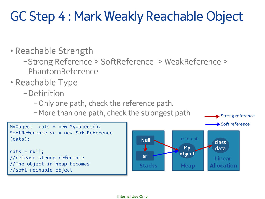 Object • Reachable Strength −Strong Reference > SoftReference > WeakReference > PhantomReference • Reachable Type −Definition −Only one path, check the reference path. −More than one path, check the strongest path Linear Allocation Heap class data My object Stacks cats Strong reference sr Soft reference referent MyObject cats = new Myobject(); SoftReference sr = new SoftReference (cats); cats = null; //release strong reference //The object in heap becomes //soft-rechable object Null