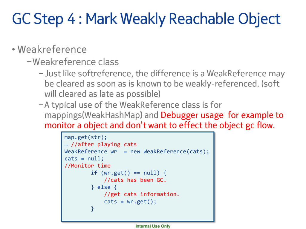 Object • Weakreference −Weakreference class −Just like softreference, the difference is a WeakReference may be cleared as soon as is known to be weakly-referenced. (soft will cleared as late as possible) −A typical use of the WeakReference class is for mappings(WeakHashMap) and Debugger usage for example to monitor a object and don’t want to effect the object gc flow. map.get(str); … //after playing cats WeakReference wr = new WeakReference(cats); cats = null; //Monitor time if (wr.get() == null) { //cats has been GC. } else { //get cats information. cats = wr.get(); }