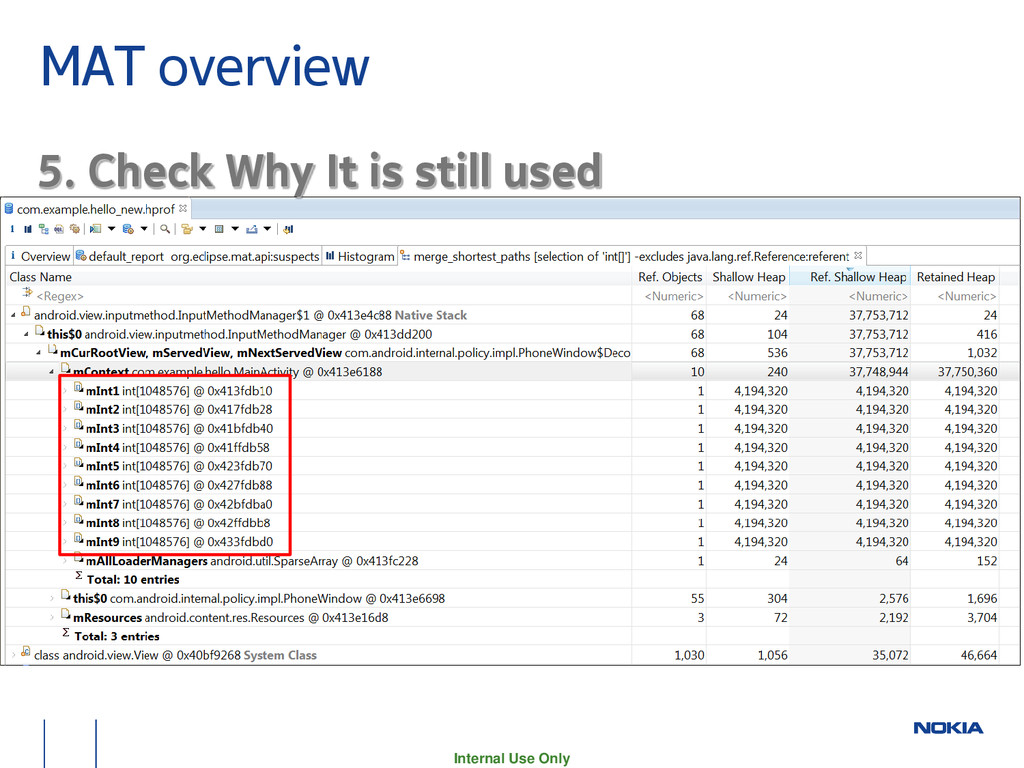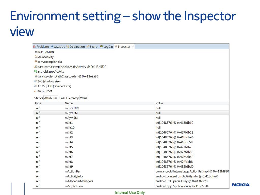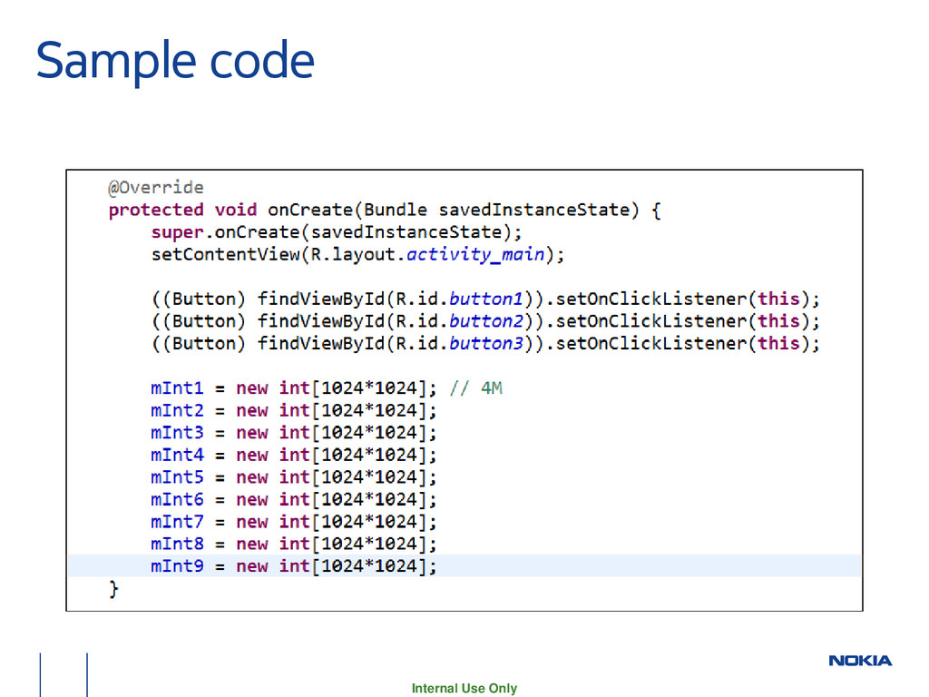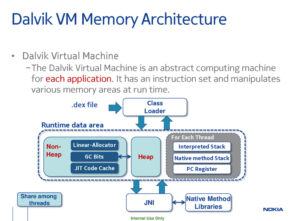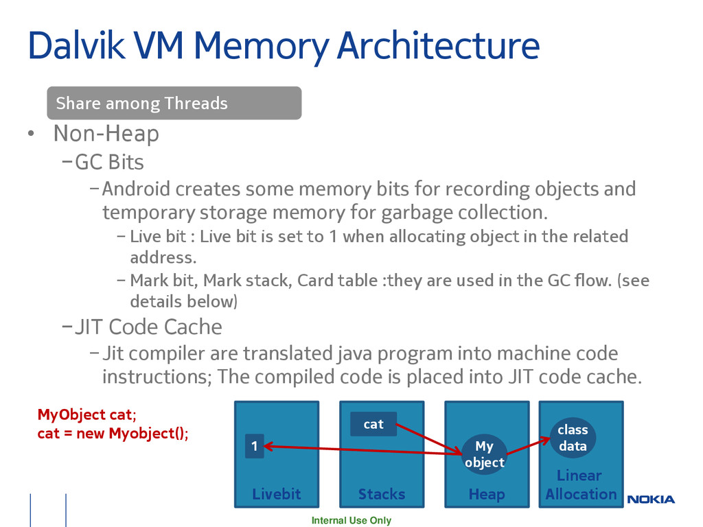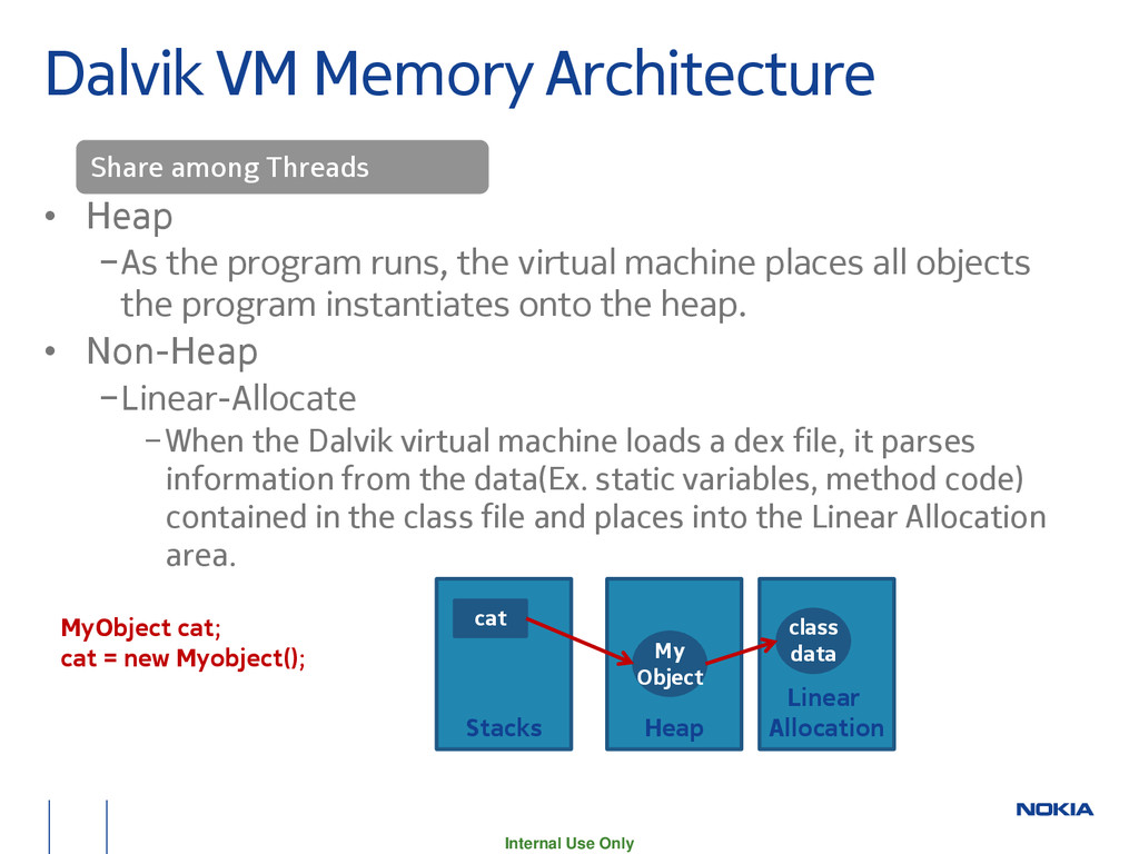 the program runs, the virtual machine places all objects the program instantiates onto the heap. • Non-Heap −Linear-Allocate −When the Dalvik virtual machine loads a dex file, it parses information from the data(Ex. static variables, method code) contained in the class file and places into the Linear Allocation area. Linear Allocation Heap class data My Object Stacks cat MyObject cat; cat = new Myobject(); Share among Threads