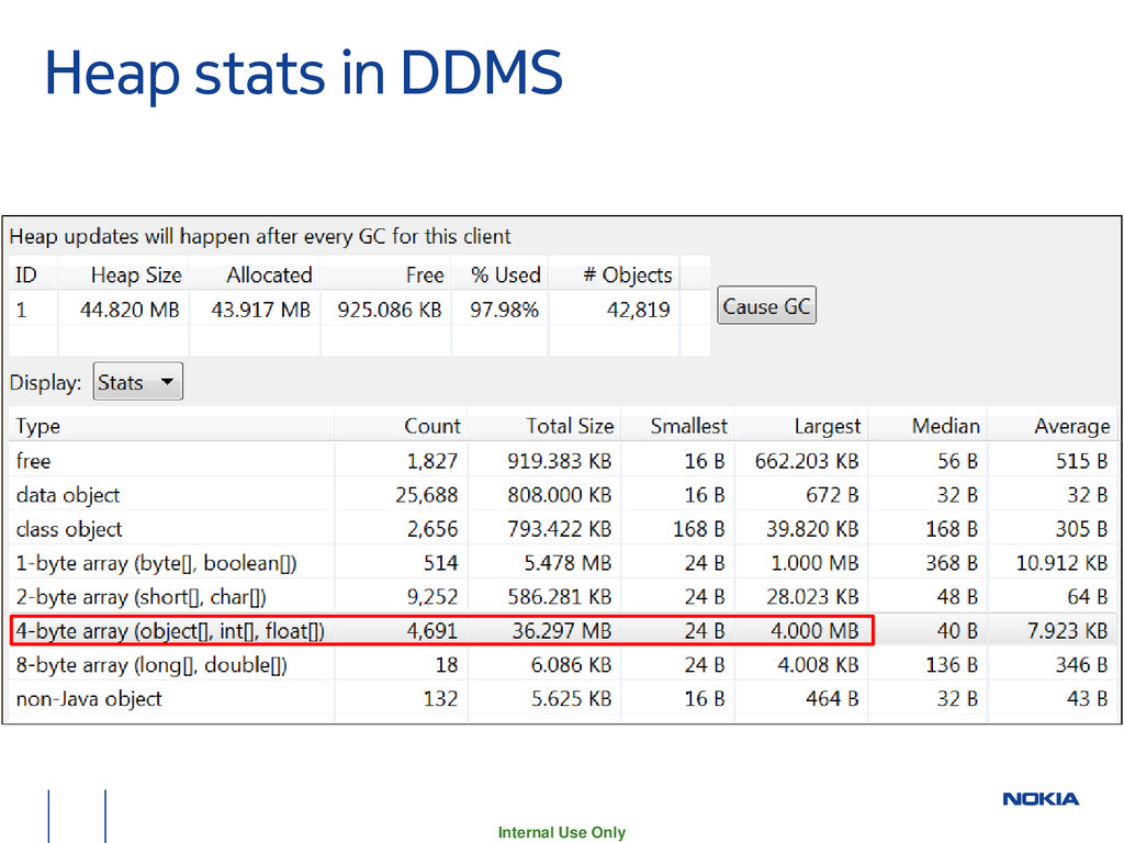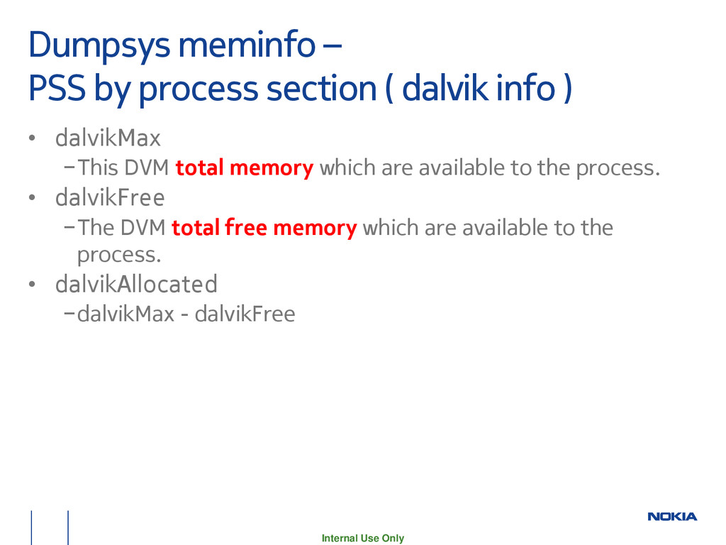 ( dalvik info ) • dalvikMax −This DVM total memory which are available to the process. • dalvikFree −The DVM total free memory which are available to the process. • dalvikAllocated −dalvikMax - dalvikFree