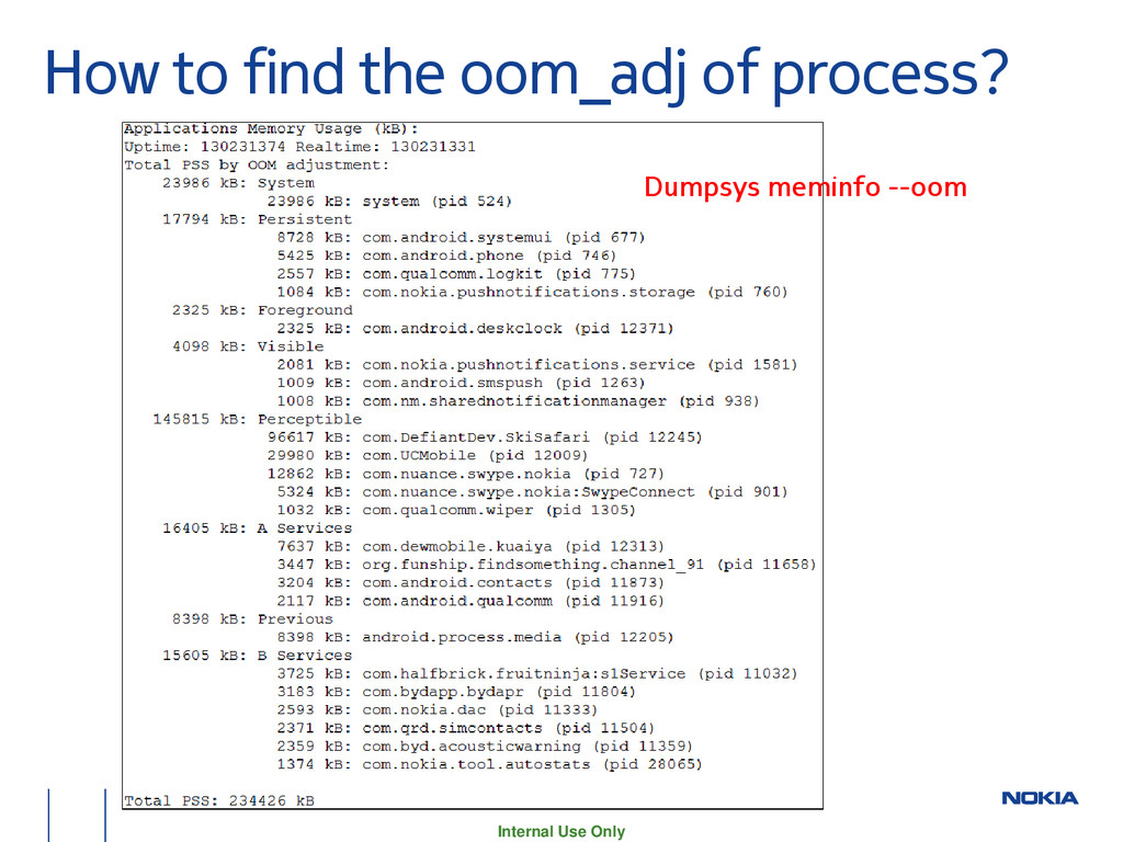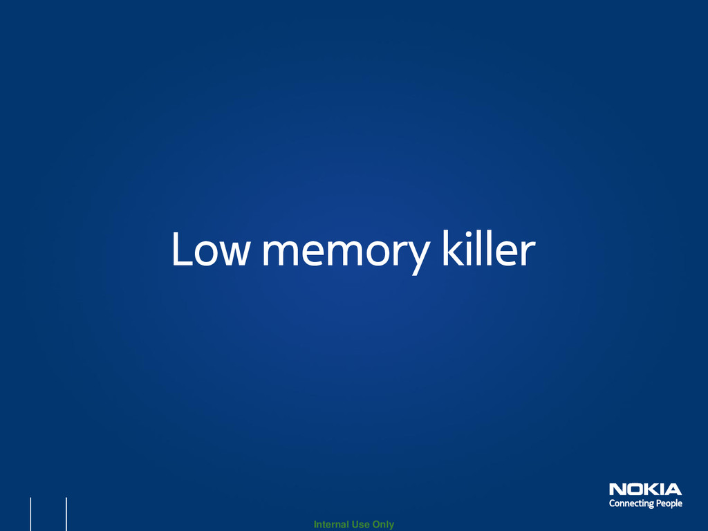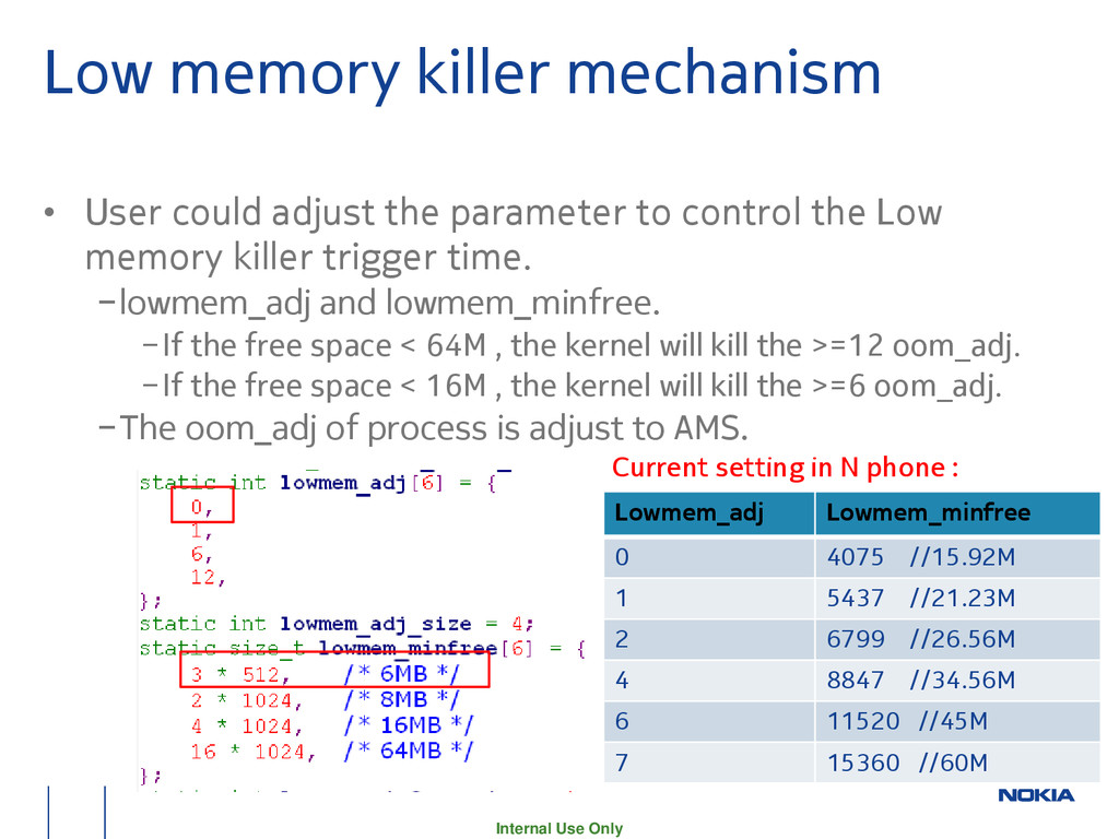 adjust the parameter to control the Low memory killer trigger time. −lowmem_adj and lowmem_minfree. −If the free space < 64M , the kernel will kill the >=12 oom_adj. −If the free space < 16M , the kernel will kill the >=6 oom_adj. −The oom_adj of process is adjust to AMS. Current setting in N phone : Lowmem_adj Lowmem_minfree 0 4075 //15.92M 1 5437 //21.23M 2 6799 //26.56M 4 8847 //34.56M 6 11520 //45M 7 15360 //60M