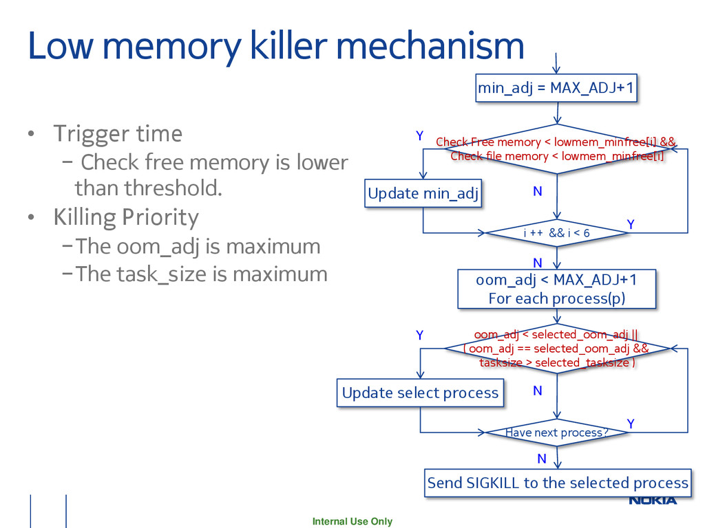 − Check free memory is lower than threshold. • Killing Priority −The oom_adj is maximum −The task_size is maximum Check Free memory < lowmem_minfree[i] && Check file memory < lowmem_minfree[i] N Y Update min_adj min_adj = MAX_ADJ+1 i ++ && i < 6 Y N oom_adj < MAX_ADJ+1 For each process(p) oom_adj < selected_oom_adj || ( oom_adj == selected_oom_adj && tasksize > selected_tasksize ) N Y Update select process Have next process? Y N Send SIGKILL to the selected process