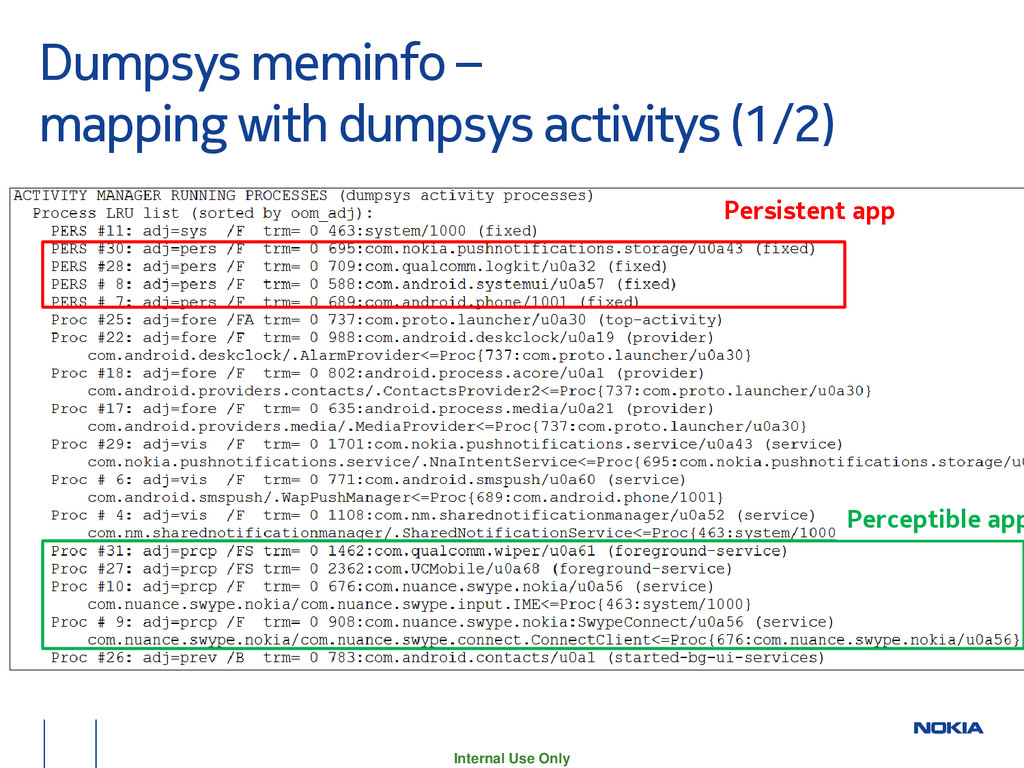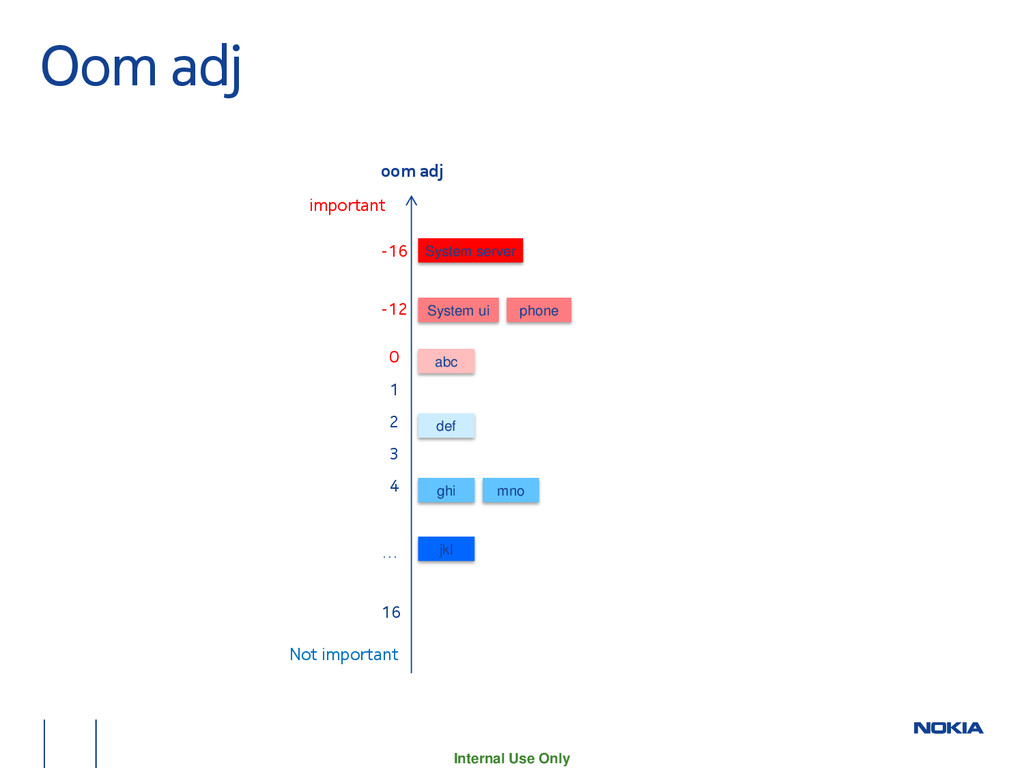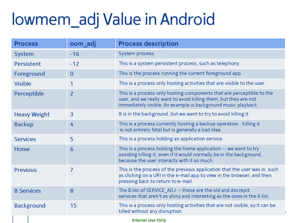 description System -16 System process Persistent -12 This is a system persistent process, such as telephony. Foreground 0 This is the process running the current foreground app. Visible 1 This is a process only hosting activities that are visible to the user. Perceptible 2 This is a process only hosting components that are perceptible to the user, and we really want to avoid killing them, but they are not immediately visible. An example is background music playback. Heavy Weight 3 It is in the background, but we want to try to avoid killing it. Backup 4 This is a process currently hosting a backup operation. Killing it is not entirely fatal but is generally a bad idea. Services 5 This is a process holding an application service. Home 6 This is a process holding the home application -- we want to try avoiding killing it, even if it would normally be in the background, because the user interacts with it so much. Previous 7 This is the process of the previous application that the user was in. such as clicking on a URI in the e-mail app to view in the browser, and then pressing back to return to e-mail. B Services 8 The B list of SERVICE_ADJ -- these are the old and decrepit services that aren't as shiny and interesting as the ones in the A list. Background 15 This is a process only hosting activities that are not visible, so it can be killed without any disruption.