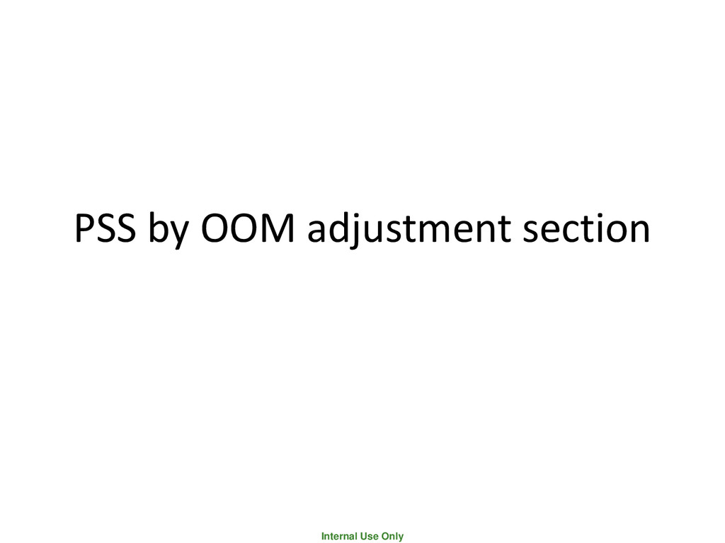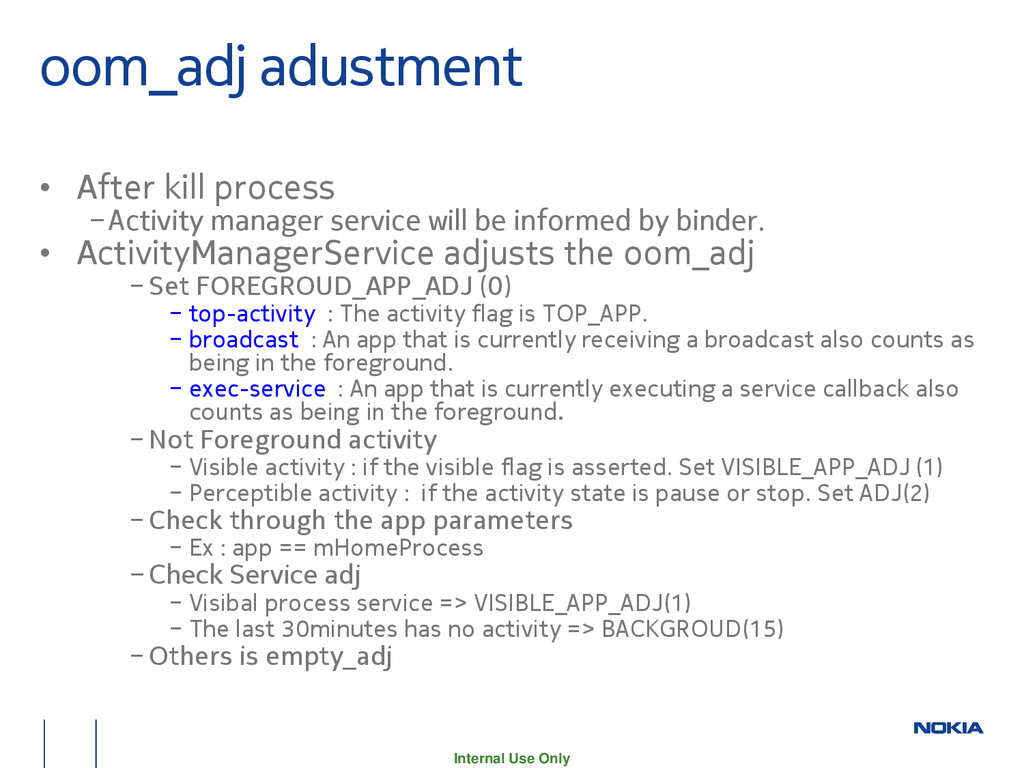 manager service will be informed by binder. • ActivityManagerService adjusts the oom_adj − Set FOREGROUD_APP_ADJ (0) − top-activity : The activity flag is TOP_APP. − broadcast : An app that is currently receiving a broadcast also counts as being in the foreground. − exec-service : An app that is currently executing a service callback also counts as being in the foreground. − Not Foreground activity − Visible activity : if the visible flag is asserted. Set VISIBLE_APP_ADJ (1) − Perceptible activity : if the activity state is pause or stop. Set ADJ(2) − Check through the app parameters − Ex : app == mHomeProcess − Check Service adj − Visibal process service => VISIBLE_APP_ADJ(1) − The last 30minutes has no activity => BACKGROUD(15) − Others is empty_adj