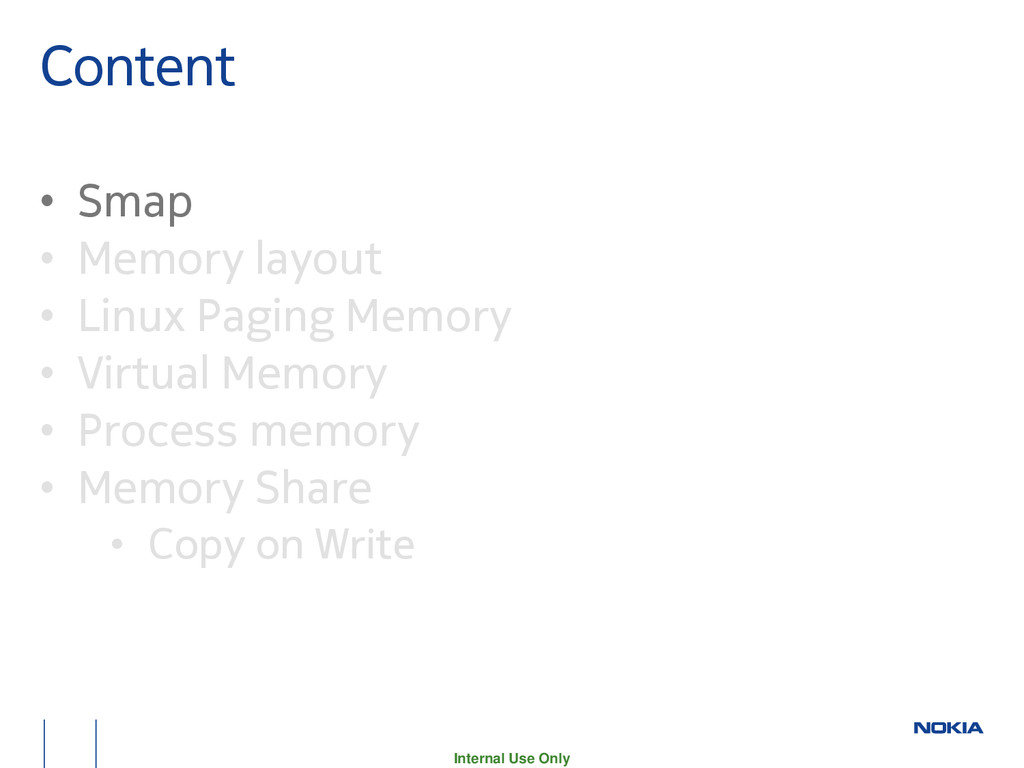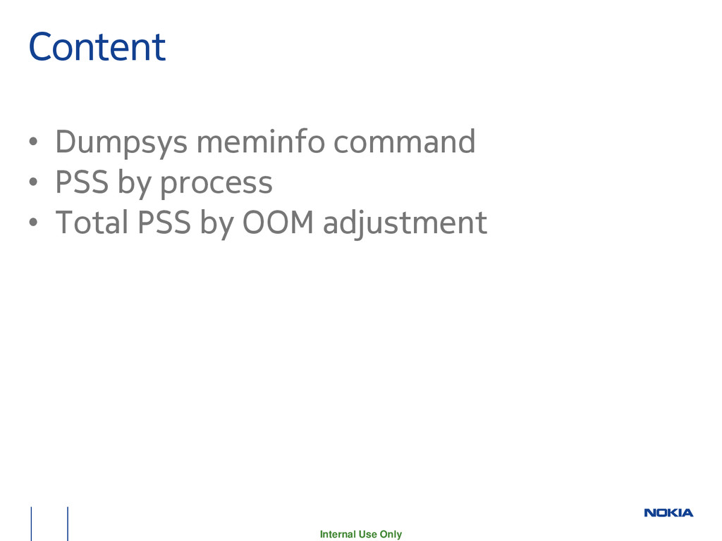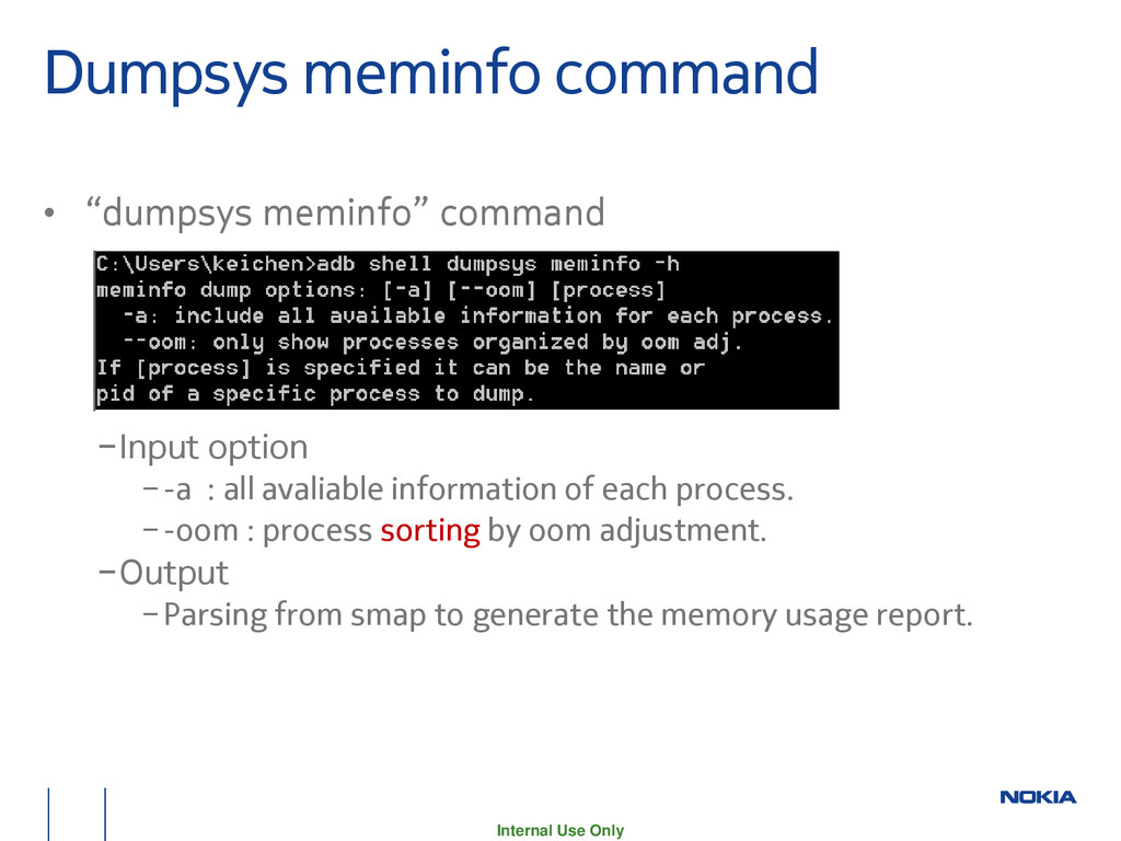 −Input option −-a : all avaliable information of each process. −-oom : process sorting by oom adjustment. −Output −Parsing from smap to generate the memory usage report.