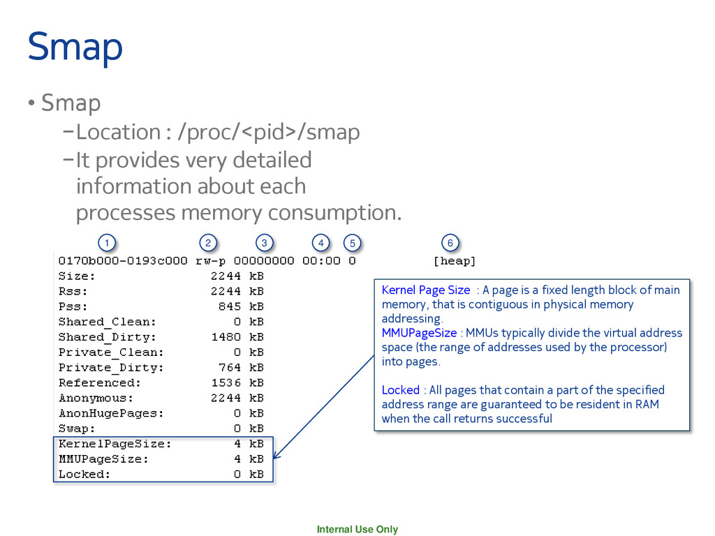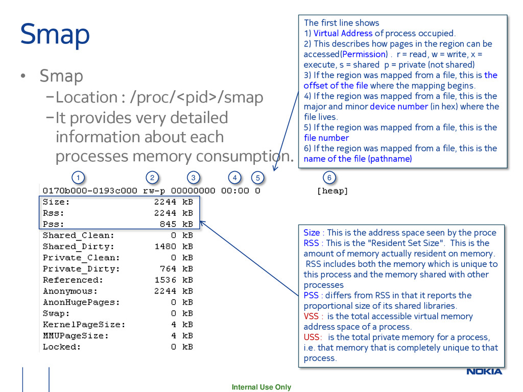 provides very detailed information about each processes memory consumption. Size : This is the address space seen by the proce RSS : This is the "Resident Set Size". This is the amount of memory actually resident on memory. RSS includes both the memory which is unique to this process and the memory shared with other processes PSS : differs from RSS in that it reports the proportional size of its shared libraries. VSS : is the total accessible virtual memory address space of a process. USS: is the total private memory for a process, i.e. that memory that is completely unique to that process. The first line shows 1) Virtual Address of process occupied. 2) This describes how pages in the region can be accessed(Permission) . r = read, w = write, x = execute, s = shared p = private (not shared) 3) If the region was mapped from a file, this is the offset of the file where the mapping begins. 4) If the region was mapped from a file, this is the major and minor device number (in hex) where the file lives. 5) If the region was mapped from a file, this is the file number 6) If the region was mapped from a file, this is the name of the file (pathname) 1 2 3 4 5 6