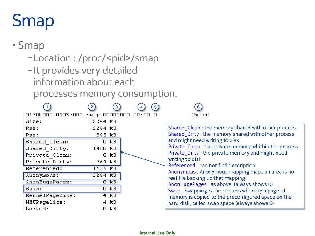 provides very detailed information about each processes memory consumption. Shared_Clean : the memory shared with other process. Shared_Dirty : the memory shared with other process and might need writing to disk. Private_Clean : the private memory whithin the process. Private_Dirty : the private memory and might need writing to disk. Referenced : can not find description. Anonymous : Anonymous mapping maps an area is no real file backing up that mapping. AnonHugePages : as above. (always shows 0) Swap : Swapping is the process whereby a page of memory is copied to the preconfigured space on the hard disk, called swap space (always shows 0) 1 2 3 4 5 6