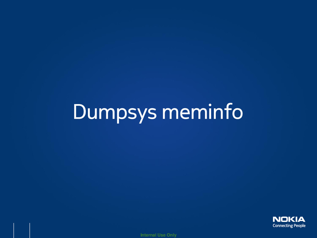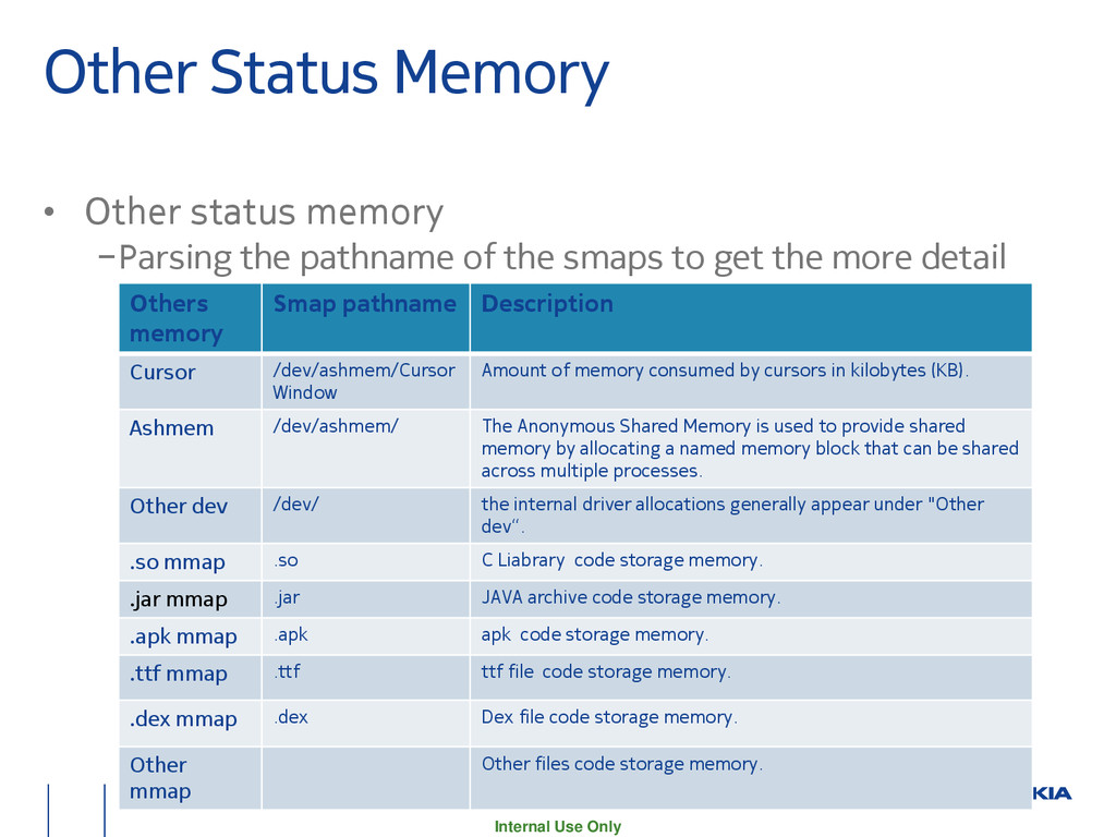 −Parsing the pathname of the smaps to get the more detail memory allocation information. Others memory Smap pathname Description Cursor /dev/ashmem/Cursor Window Amount of memory consumed by cursors in kilobytes (KB). Ashmem /dev/ashmem/ The Anonymous Shared Memory is used to provide shared memory by allocating a named memory block that can be shared across multiple processes. Other dev /dev/ the internal driver allocations generally appear under "Other dev“. .so mmap .so C Liabrary code storage memory. .jar mmap .jar JAVA archive code storage memory. .apk mmap .apk apk code storage memory. .ttf mmap .ttf ttf file code storage memory. .dex mmap .dex Dex file code storage memory. Other mmap Other files code storage memory.