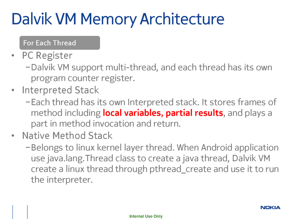 −Dalvik VM support multi-thread, and each thread has its own program counter register. • Interpreted Stack −Each thread has its own Interpreted stack. It stores frames of method including local variables, partial results, and plays a part in method invocation and return. • Native Method Stack −Belongs to linux kernel layer thread. When Android application use java.lang.Thread class to create a java thread, Dalvik VM create a linux thread through pthread_create and use it to run the interpreter. For Each Thread