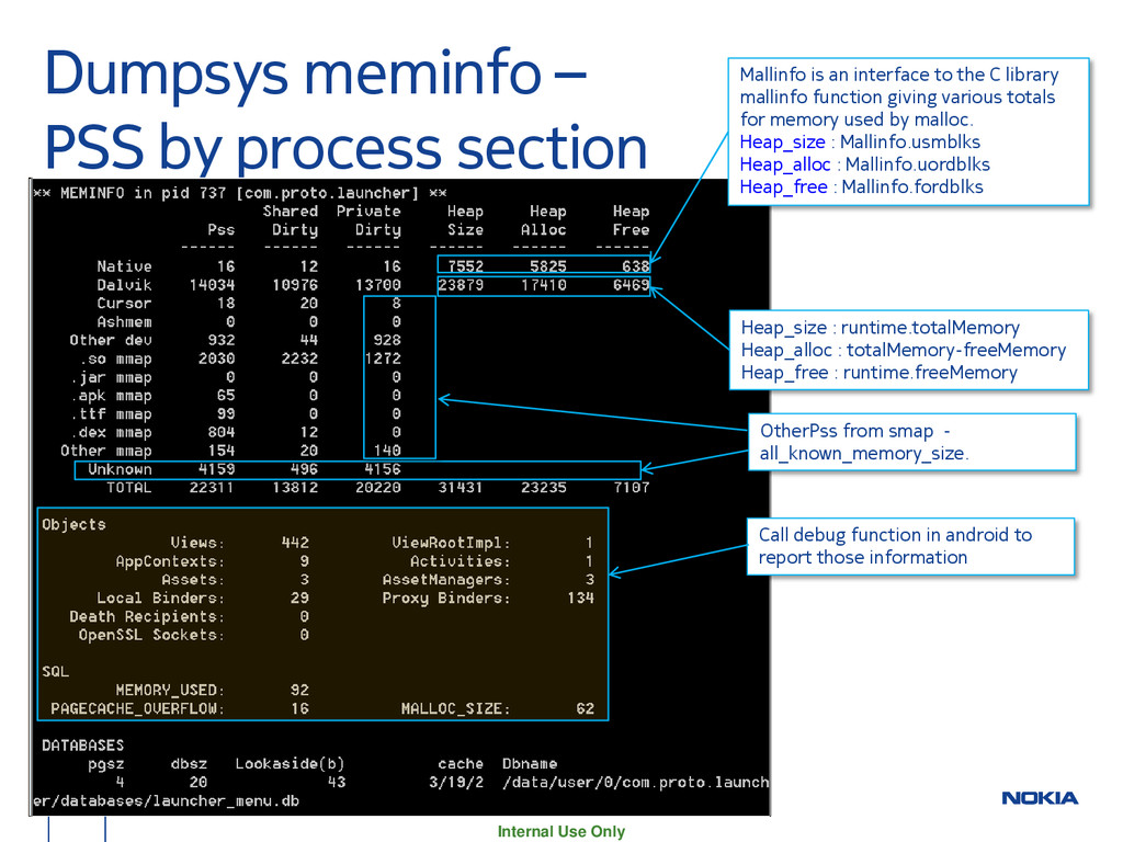 OtherPss from smap - all_known_memory_size. Mallinfo is an interface to the C library mallinfo function giving various totals for memory used by malloc. Heap_size : Mallinfo.usmblks Heap_alloc : Mallinfo.uordblks Heap_free : Mallinfo.fordblks Heap_size : runtime.totalMemory Heap_alloc : totalMemory-freeMemory Heap_free : runtime.freeMemory Call debug function in android to report those information