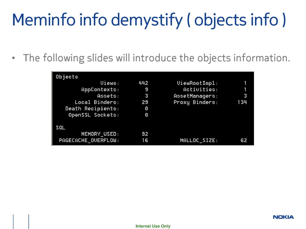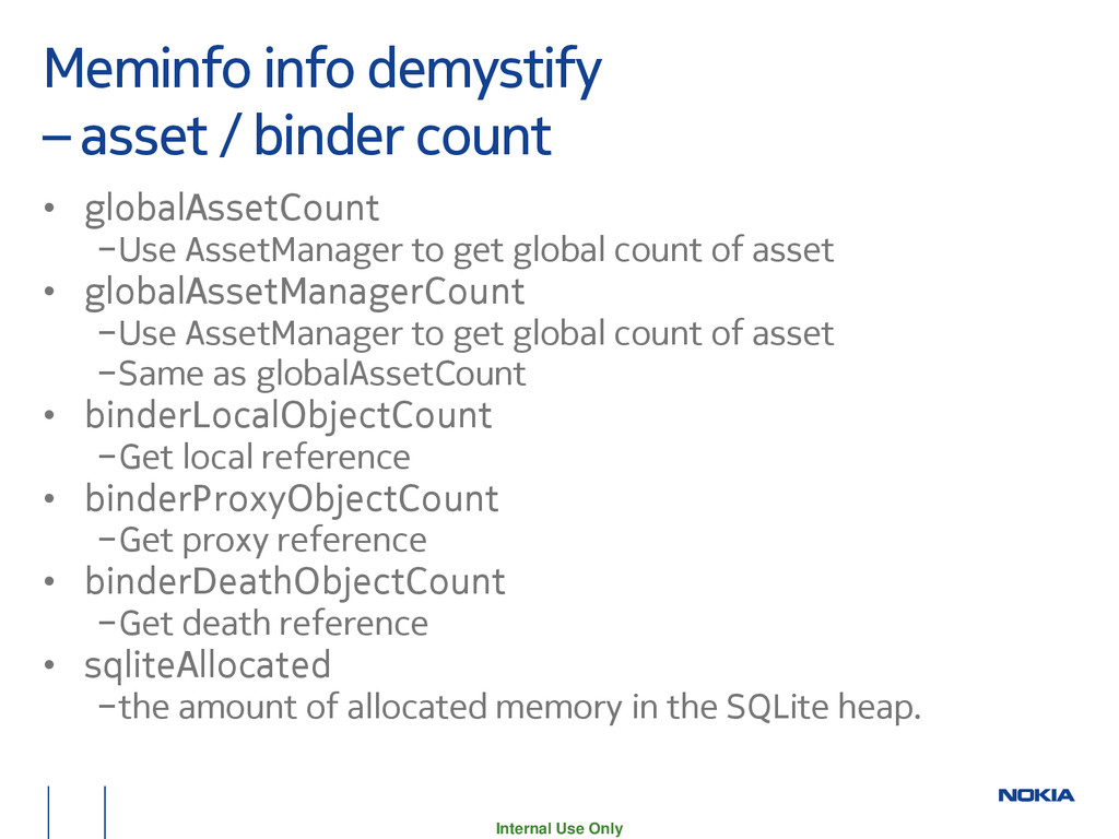 count • globalAssetCount −Use AssetManager to get global count of asset • globalAssetManagerCount −Use AssetManager to get global count of asset −Same as globalAssetCount • binderLocalObjectCount −Get local reference • binderProxyObjectCount −Get proxy reference • binderDeathObjectCount −Get death reference • sqliteAllocated −the amount of allocated memory in the SQLite heap.