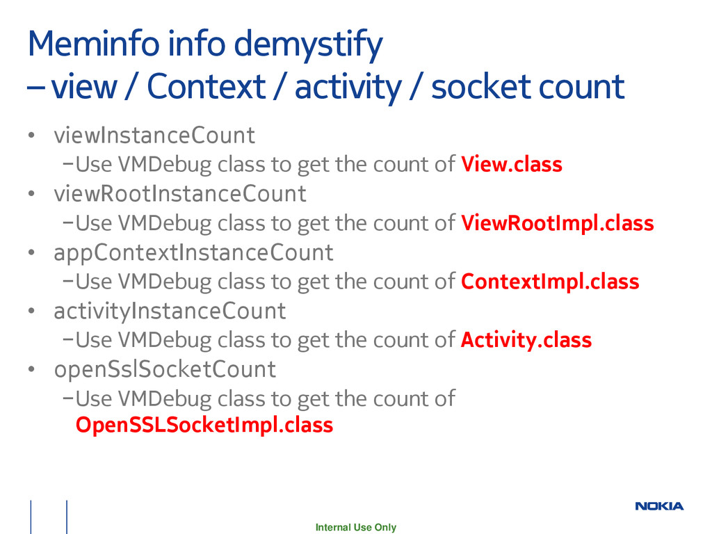 / activity / socket count • viewInstanceCount −Use VMDebug class to get the count of View.class • viewRootInstanceCount −Use VMDebug class to get the count of ViewRootImpl.class • appContextInstanceCount −Use VMDebug class to get the count of ContextImpl.class • activityInstanceCount −Use VMDebug class to get the count of Activity.class • openSslSocketCount −Use VMDebug class to get the count of OpenSSLSocketImpl.class