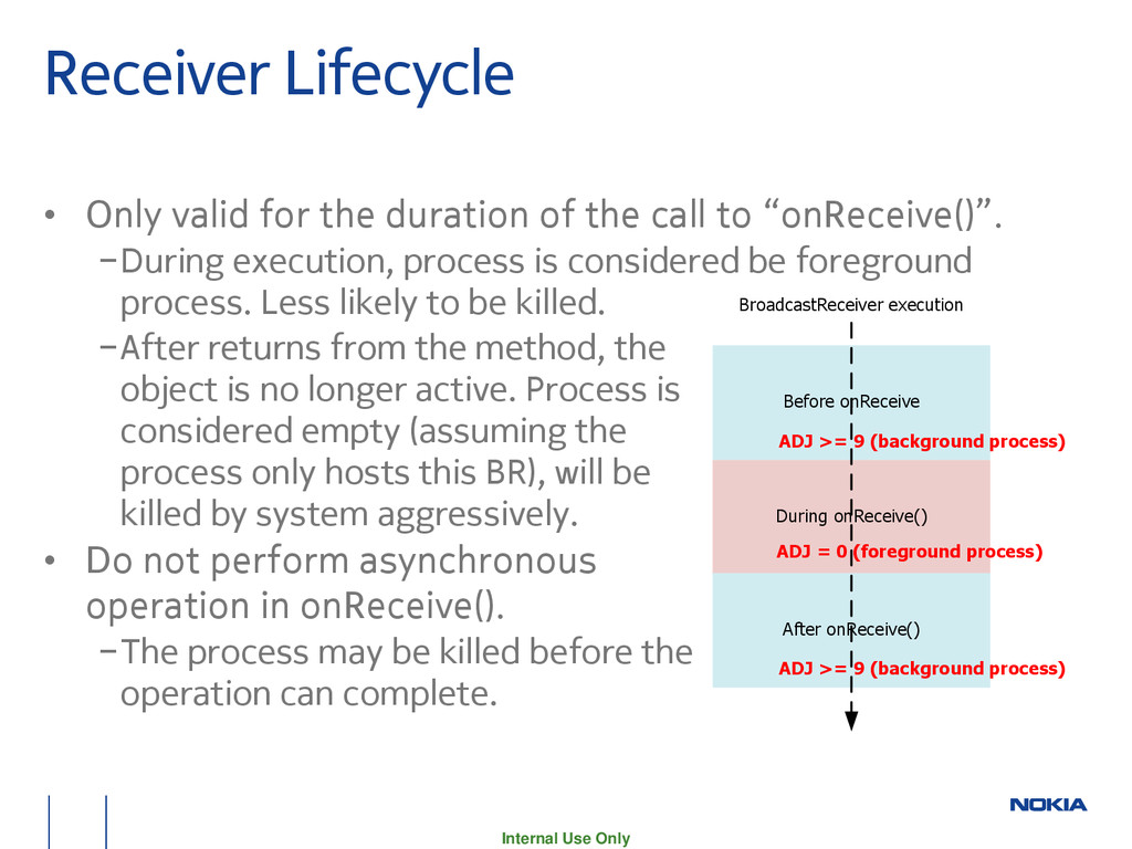 duration of the call to “onReceive()”. −During execution, process is considered be foreground process. Less likely to be killed. −After returns from the method, the object is no longer active. Process is considered empty (assuming the process only hosts this BR), will be killed by system aggressively. • Do not perform asynchronous operation in onReceive(). −The process may be killed before the operation can complete. During onReceive() Before onReceive After onReceive() BroadcastReceiver execution ADJ = 0 (foreground process) ADJ >= 9 (background process) ADJ >= 9 (background process)