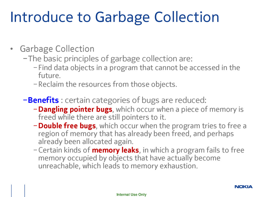 −The basic principles of garbage collection are: −Find data objects in a program that cannot be accessed in the future. −Reclaim the resources from those objects. −Benefits : certain categories of bugs are reduced: −Dangling pointer bugs, which occur when a piece of memory is freed while there are still pointers to it. −Double free bugs, which occur when the program tries to free a region of memory that has already been freed, and perhaps already been allocated again. −Certain kinds of memory leaks, in which a program fails to free memory occupied by objects that have actually become unreachable, which leads to memory exhaustion.