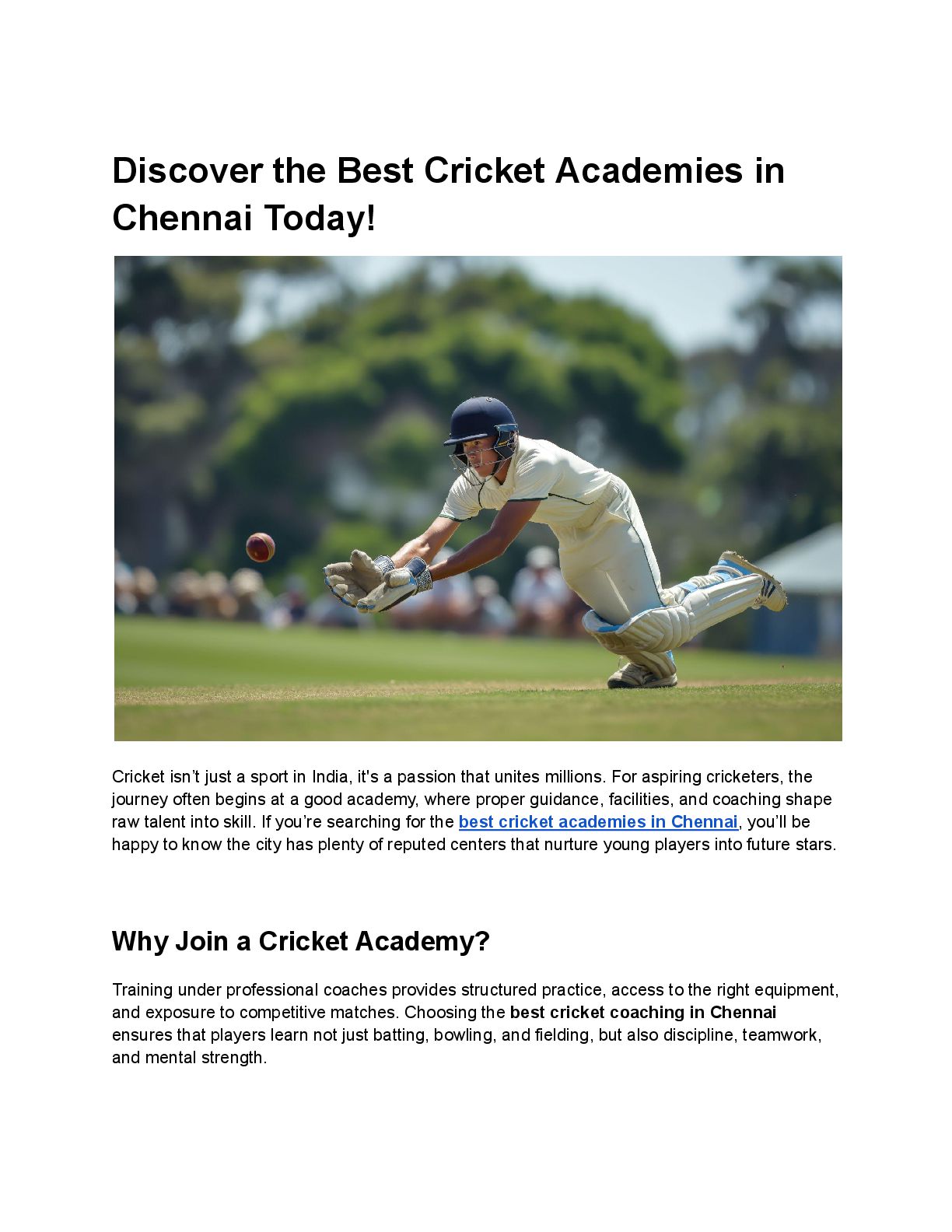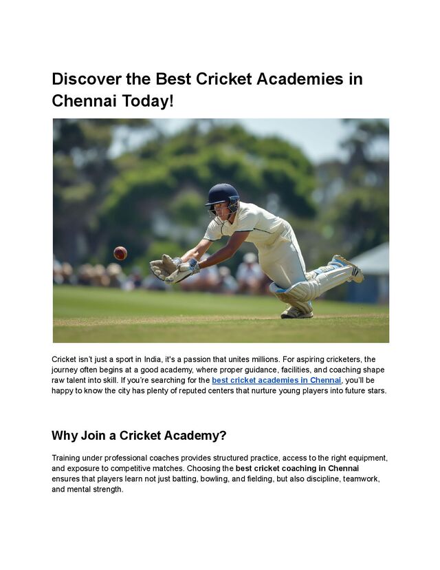 just a sport in India, it's a passion that unites millions. For aspiring cricketers, the journey often begins at a good academy, where proper guidance, facilities, and coaching shape raw talent into skill. If you’re searching for the best cricket academies in Chennai, you’ll be happy to know the city has plenty of reputed centers that nurture young players into future stars. Why Join a Cricket Academy? Training under professional coaches provides structured practice, access to the right equipment, and exposure to competitive matches. Choosing the best cricket coaching in Chennai ensures that players learn not just batting, bowling, and fielding, but also discipline, teamwork, and mental strength.