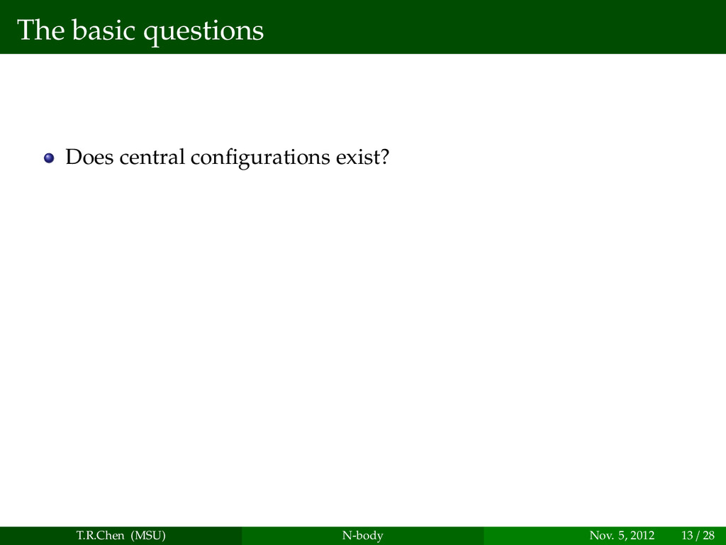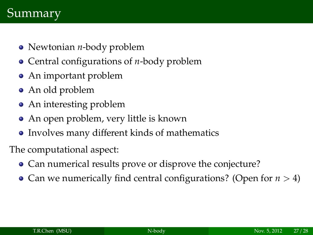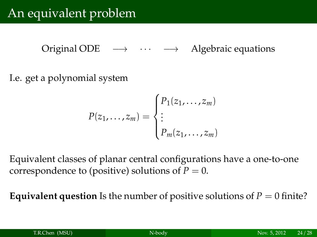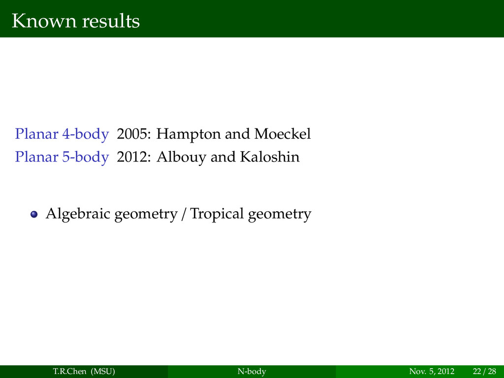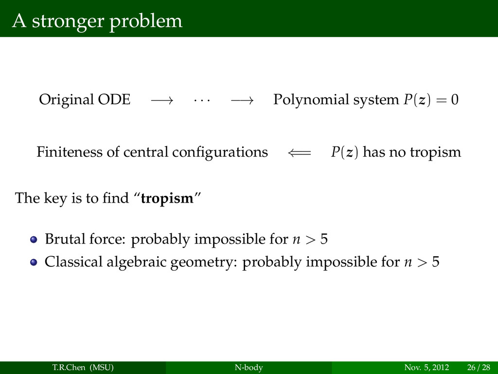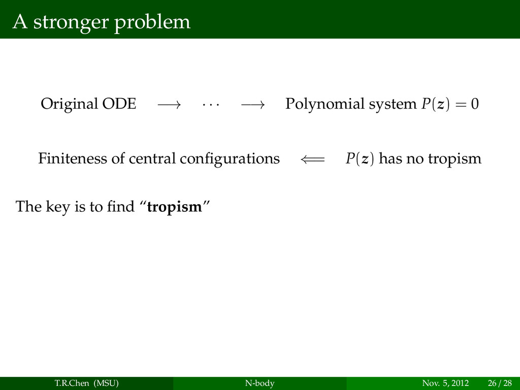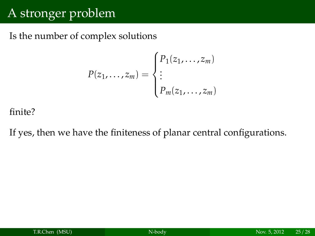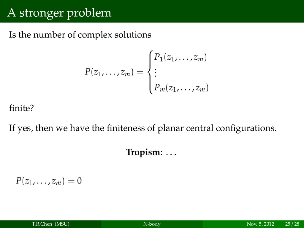. . . , zm) = P1(z1, . . . , zm) . . . Pm(z1, . . . , zm) finite? If yes, then we have the finiteness of planar central configurations. Tropism: . . . P(z1, . . . , zm) = 0 has tropisms no tropisms =⇒ Finite number of solutions T.R.Chen (MSU) N-body Nov. 5, 2012 25 / 28