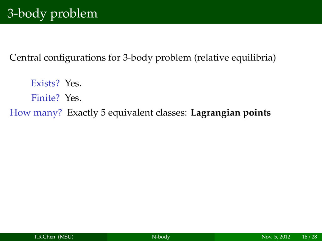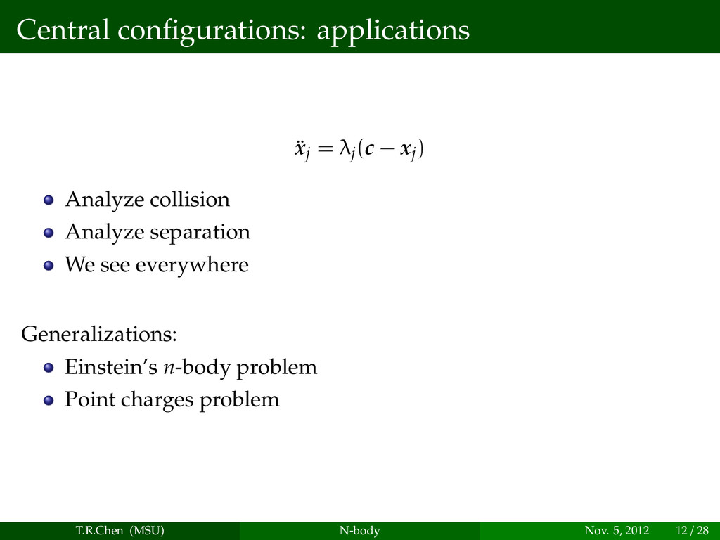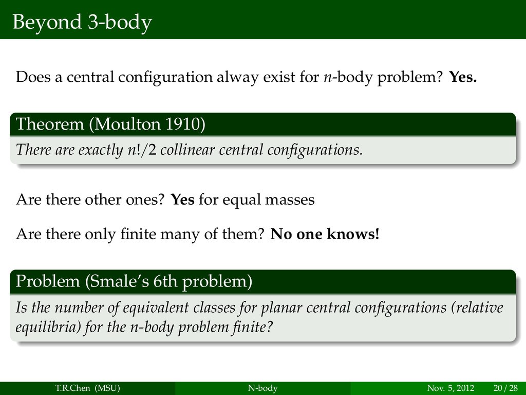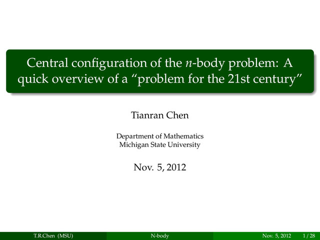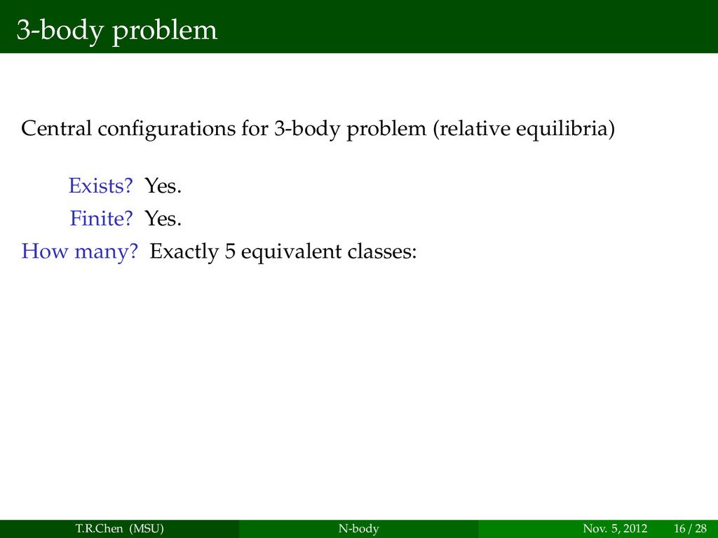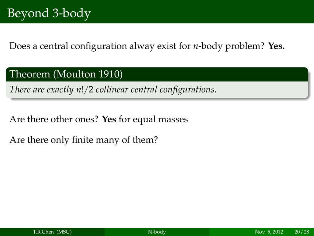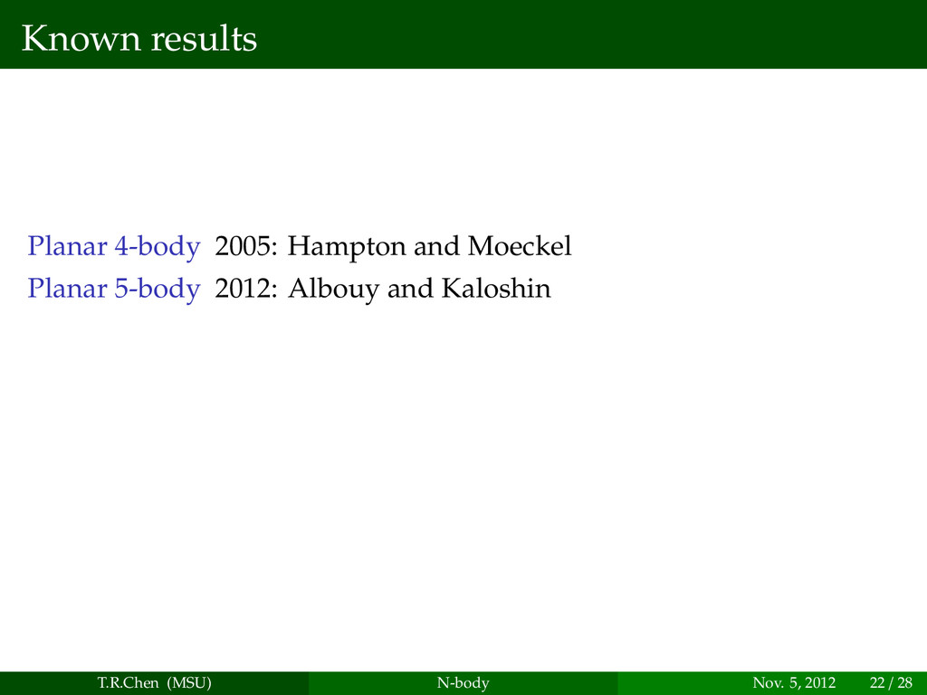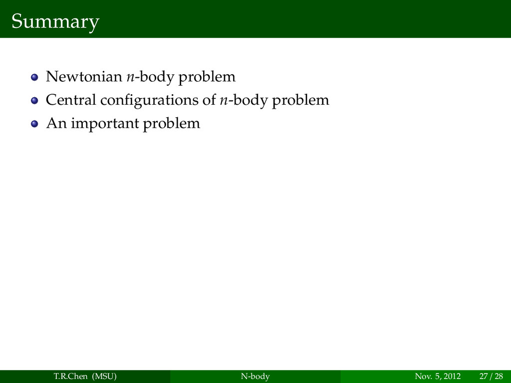 . . . , zm) = P1(z1, . . . , zm) . . . Pm(z1, . . . , zm) finite? If yes, then we have the finiteness of planar central configurations. Tropism: . . . P(z1, . . . , zm) = 0 has tropisms no tropisms =⇒ Finite number of solutions T.R.Chen (MSU) N-body Nov. 5, 2012 25 / 28