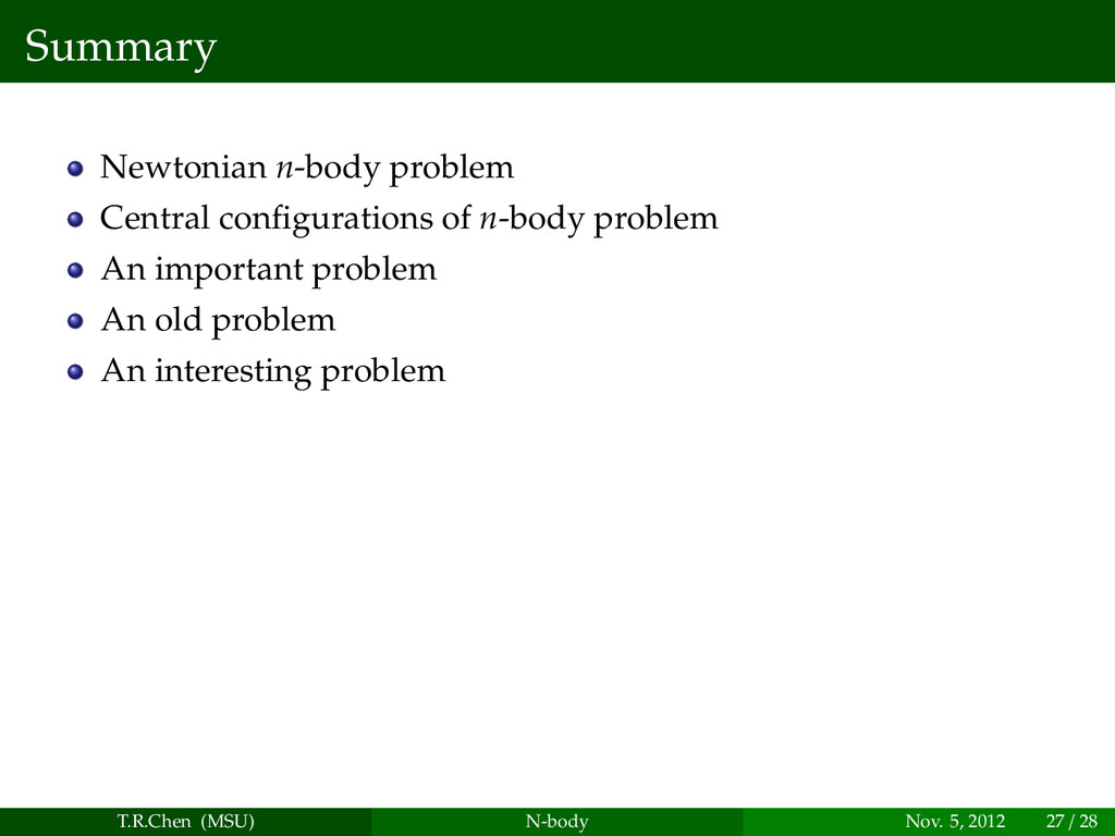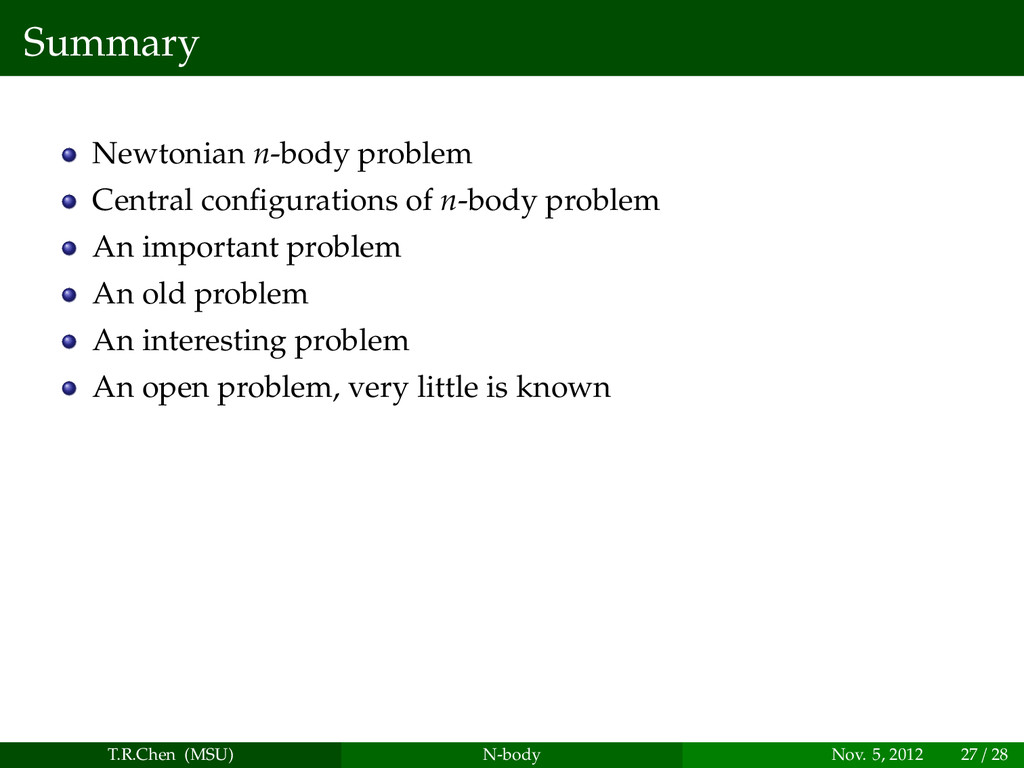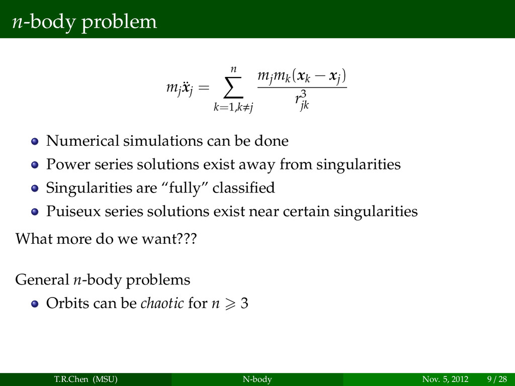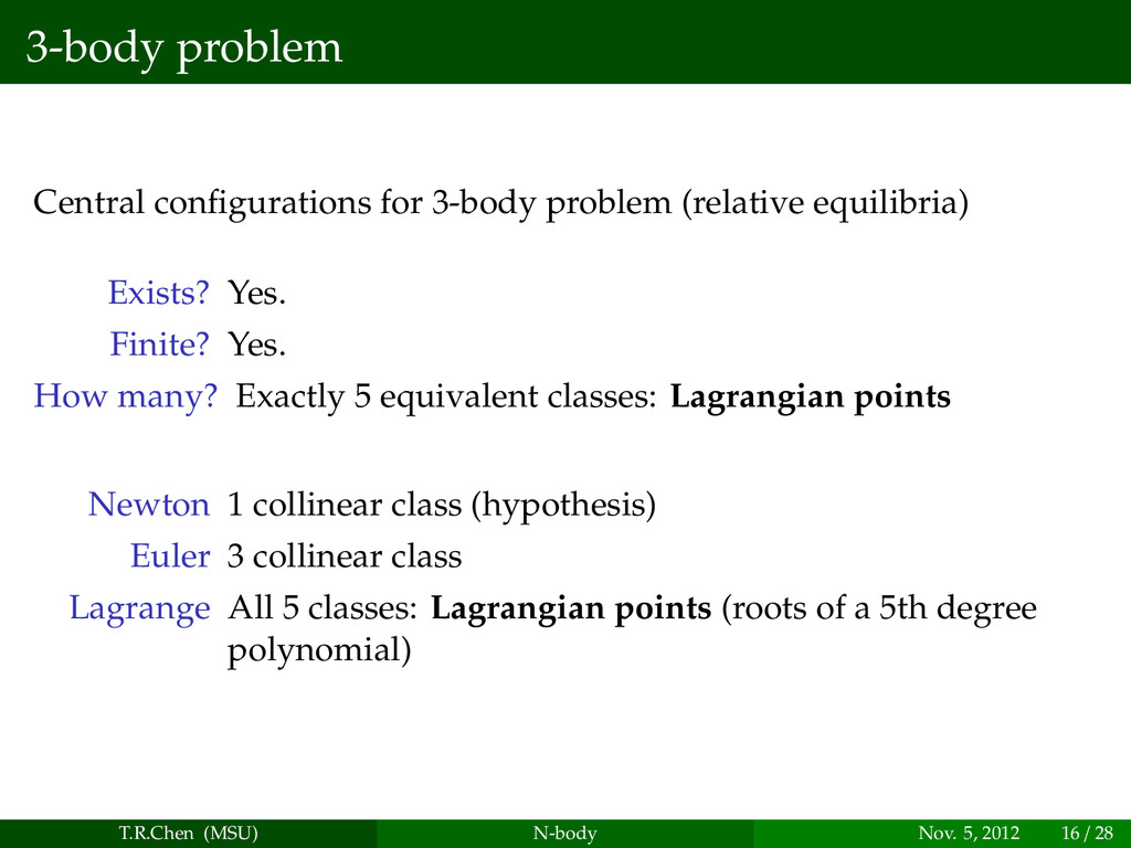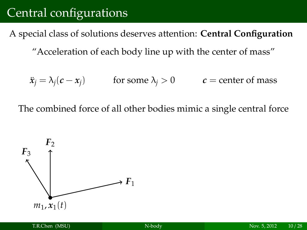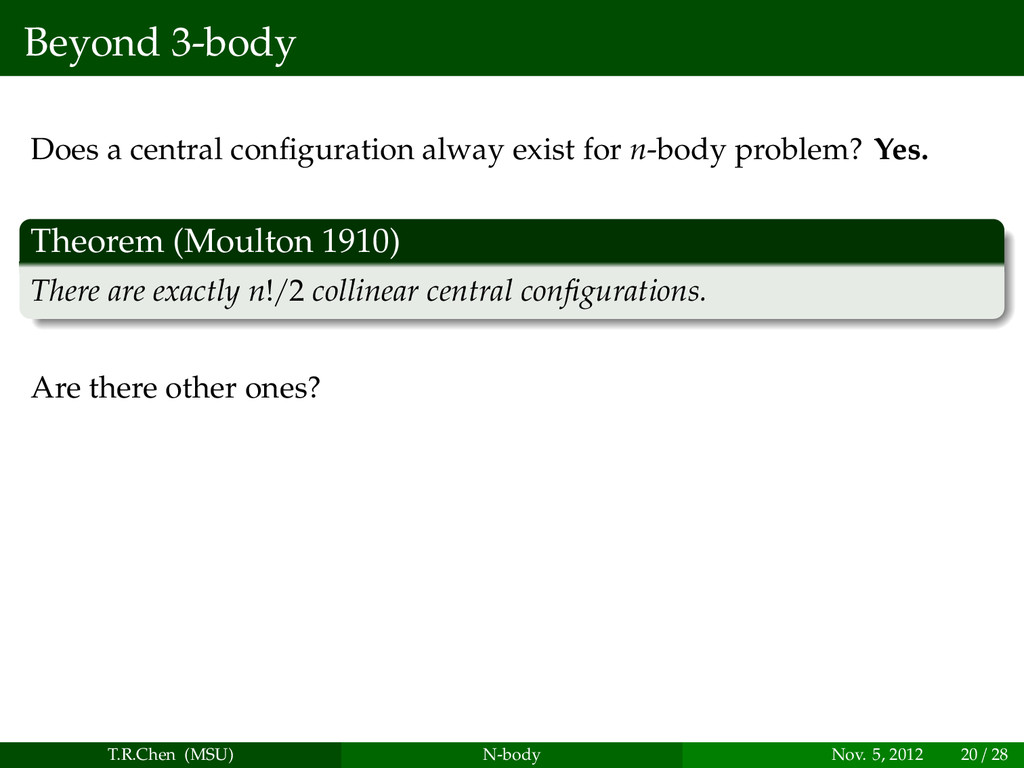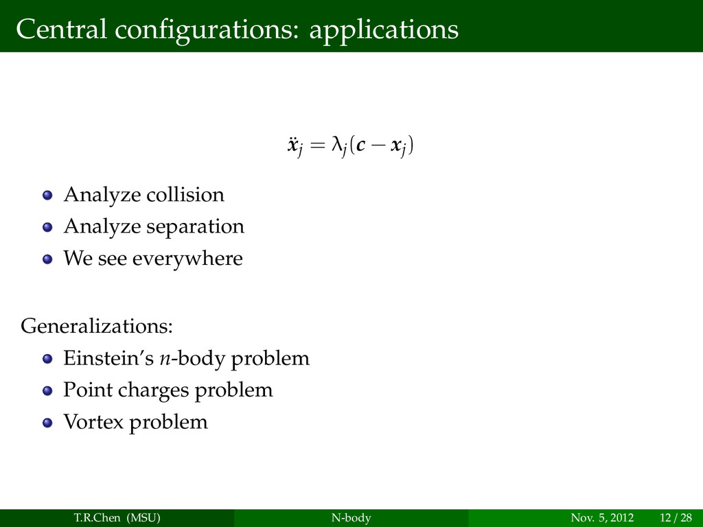 . . . , zm) = P1(z1, . . . , zm) . . . Pm(z1, . . . , zm) finite? If yes, then we have the finiteness of planar central configurations. Tropism: . . . P(z1, . . . , zm) = 0 has tropisms no tropisms =⇒ Finite number of solutions T.R.Chen (MSU) N-body Nov. 5, 2012 25 / 28