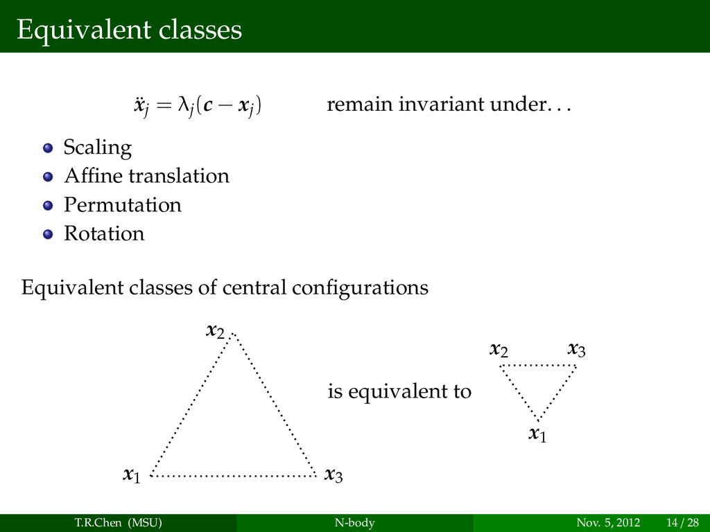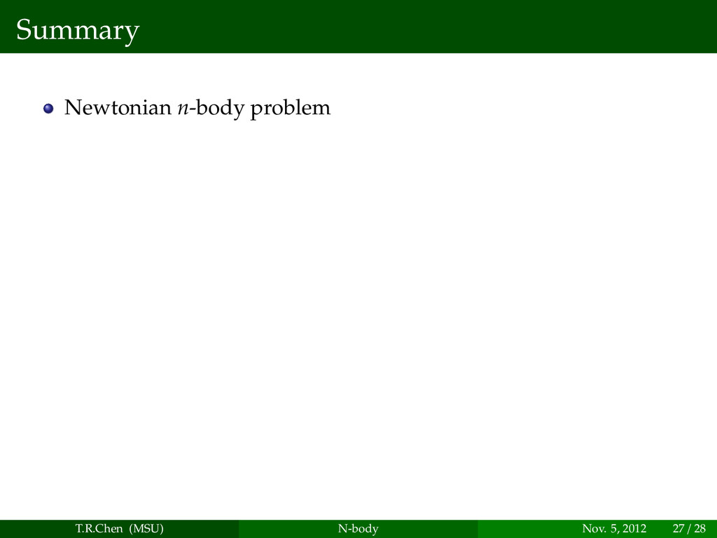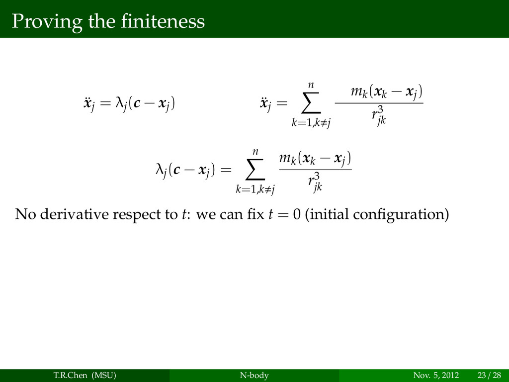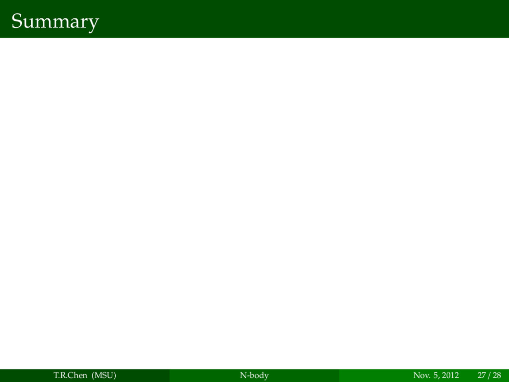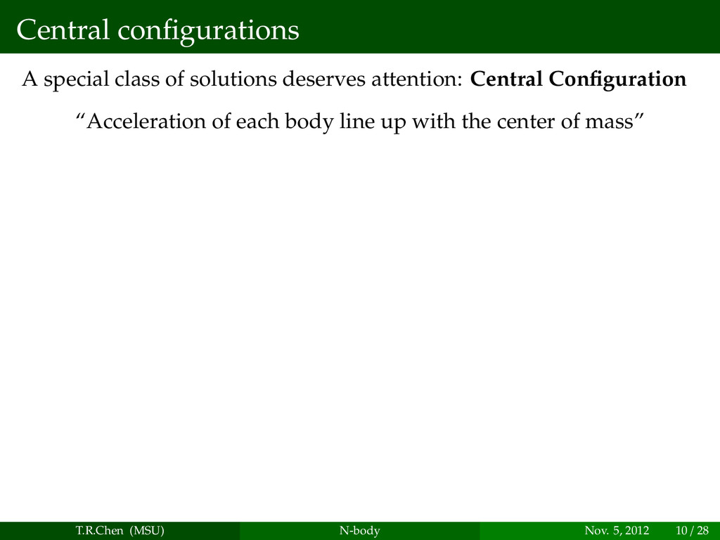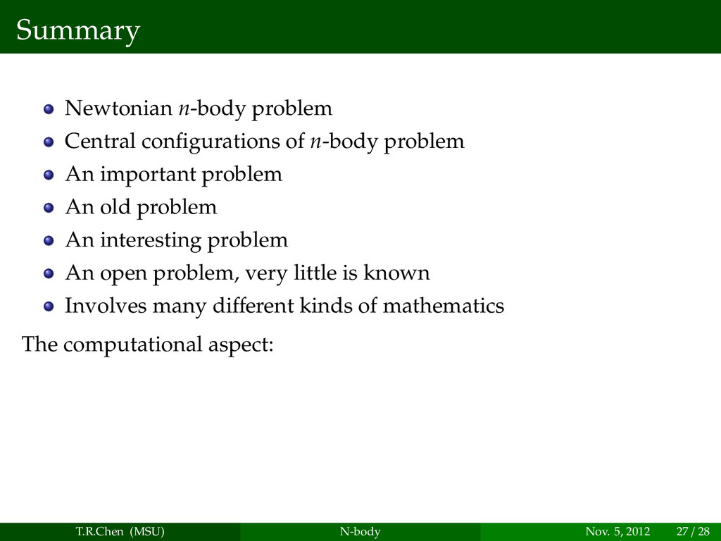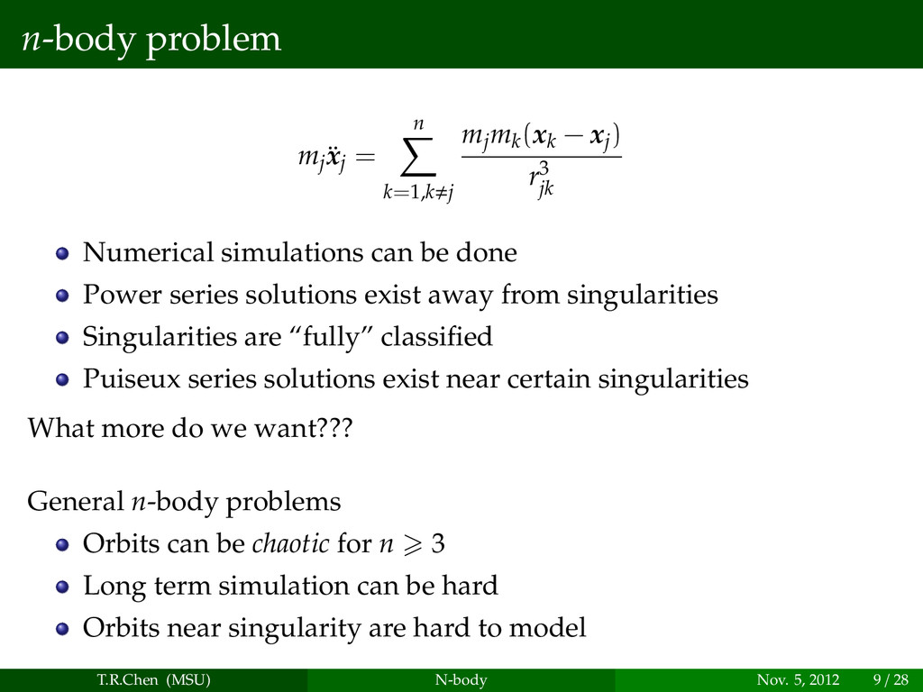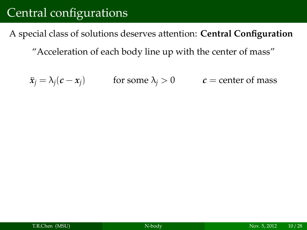. . . , zm) = P1(z1, . . . , zm) . . . Pm(z1, . . . , zm) finite? If yes, then we have the finiteness of planar central configurations. Tropism: . . . P(z1, . . . , zm) = 0 has tropisms no tropisms =⇒ Finite number of solutions T.R.Chen (MSU) N-body Nov. 5, 2012 25 / 28