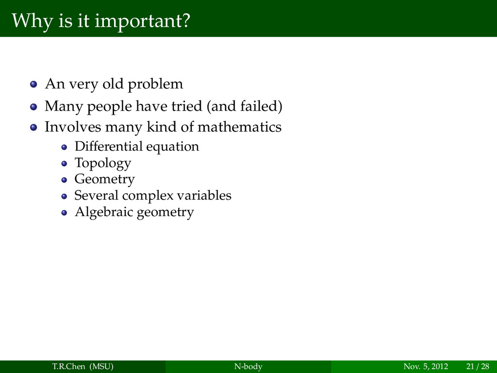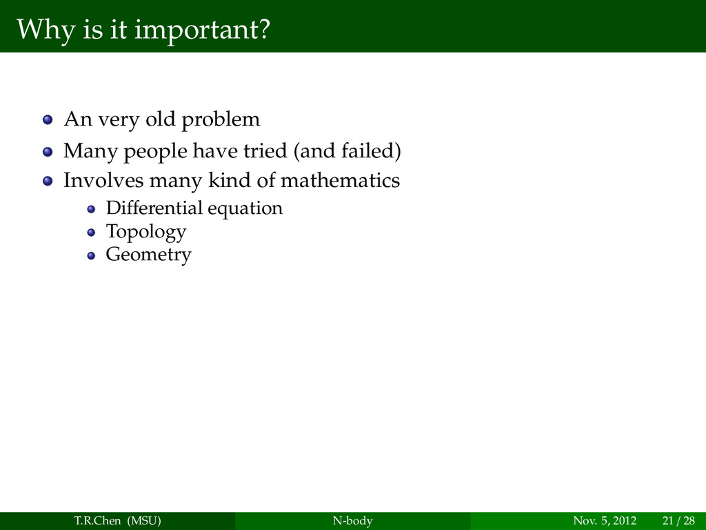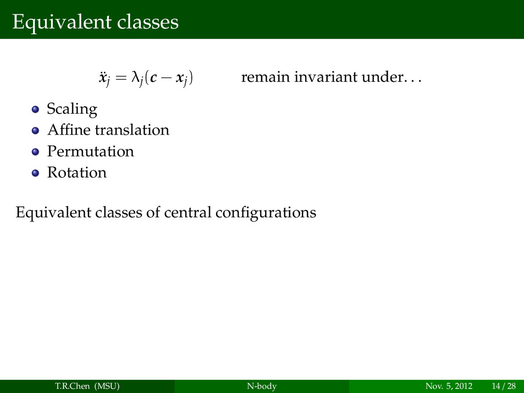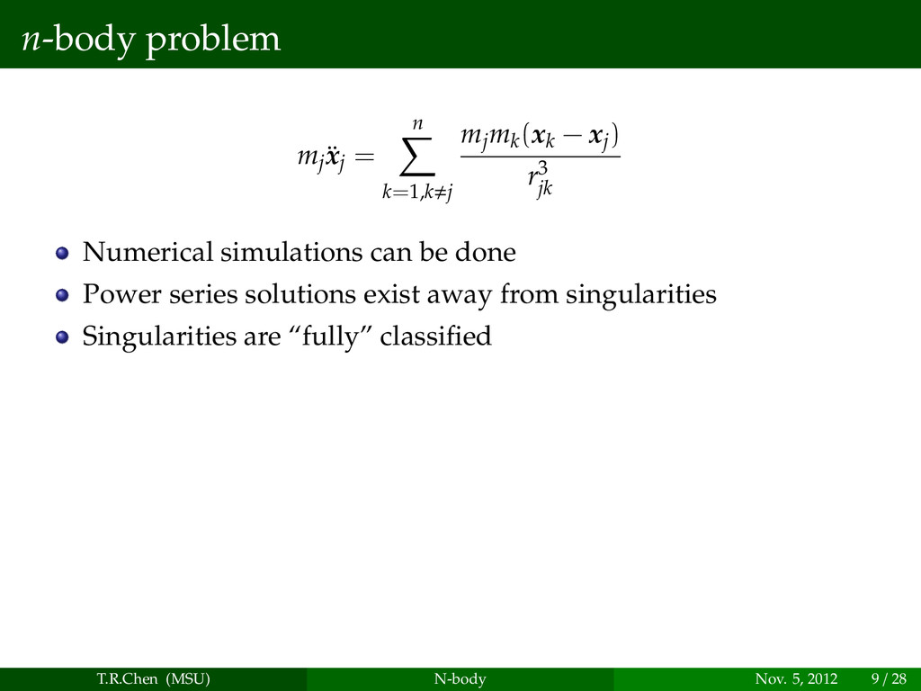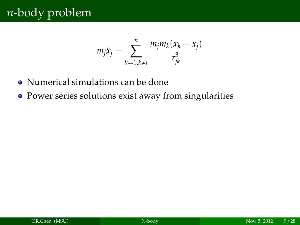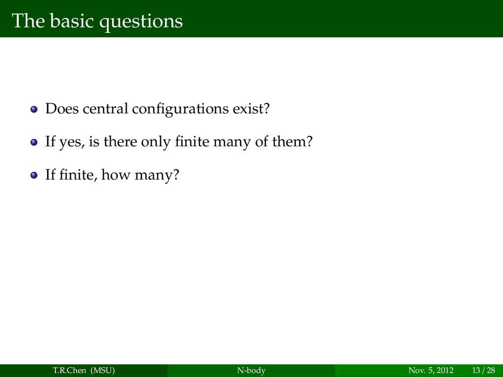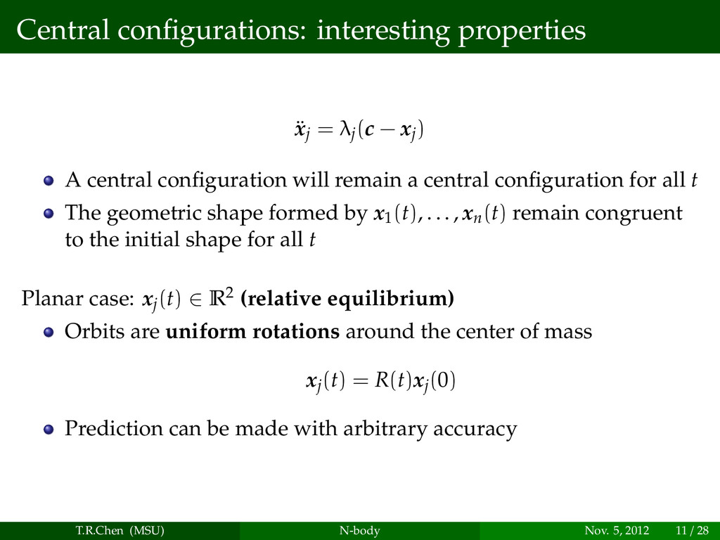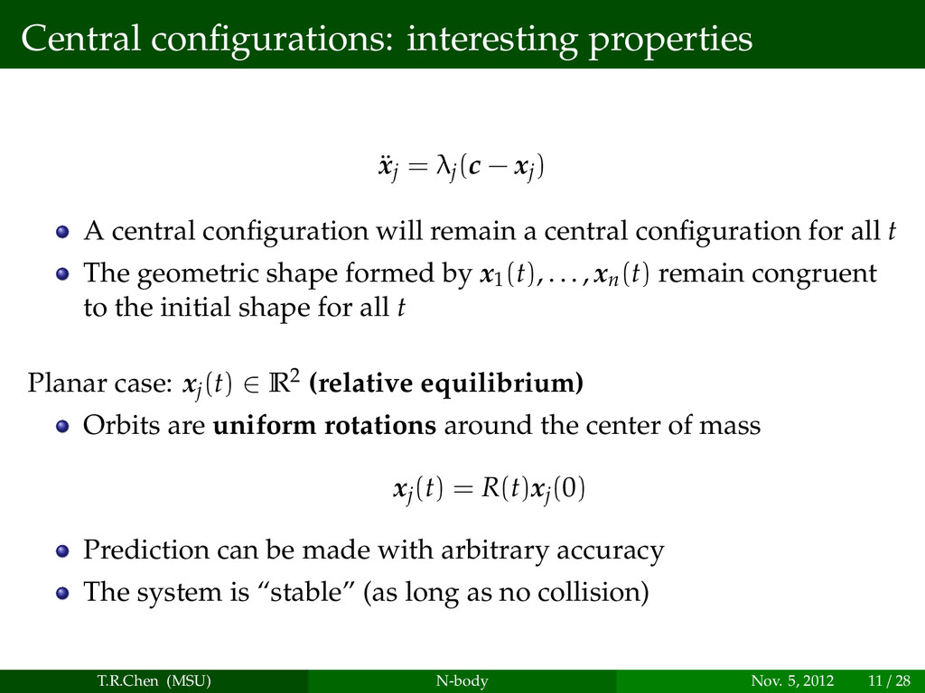 . . . , zm) = P1(z1, . . . , zm) . . . Pm(z1, . . . , zm) finite? If yes, then we have the finiteness of planar central configurations. Tropism: . . . P(z1, . . . , zm) = 0 has tropisms no tropisms =⇒ Finite number of solutions T.R.Chen (MSU) N-body Nov. 5, 2012 25 / 28