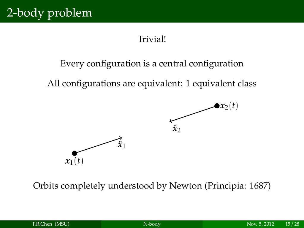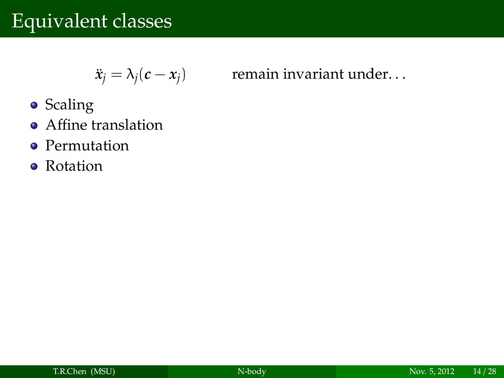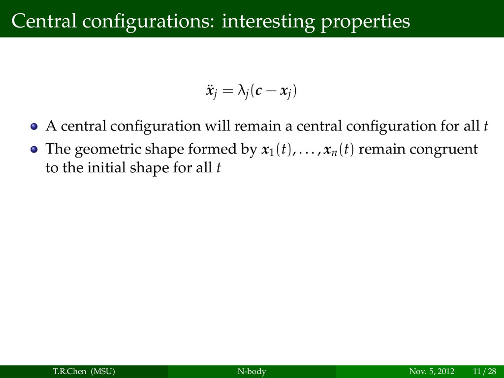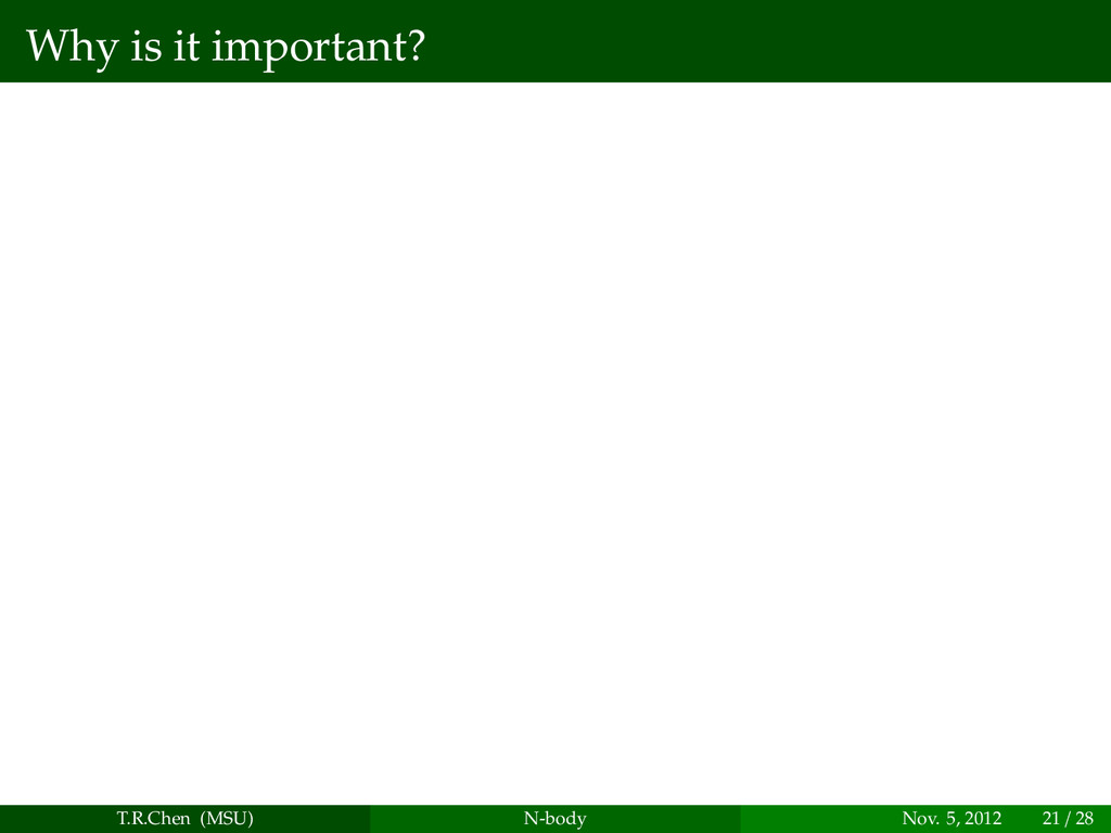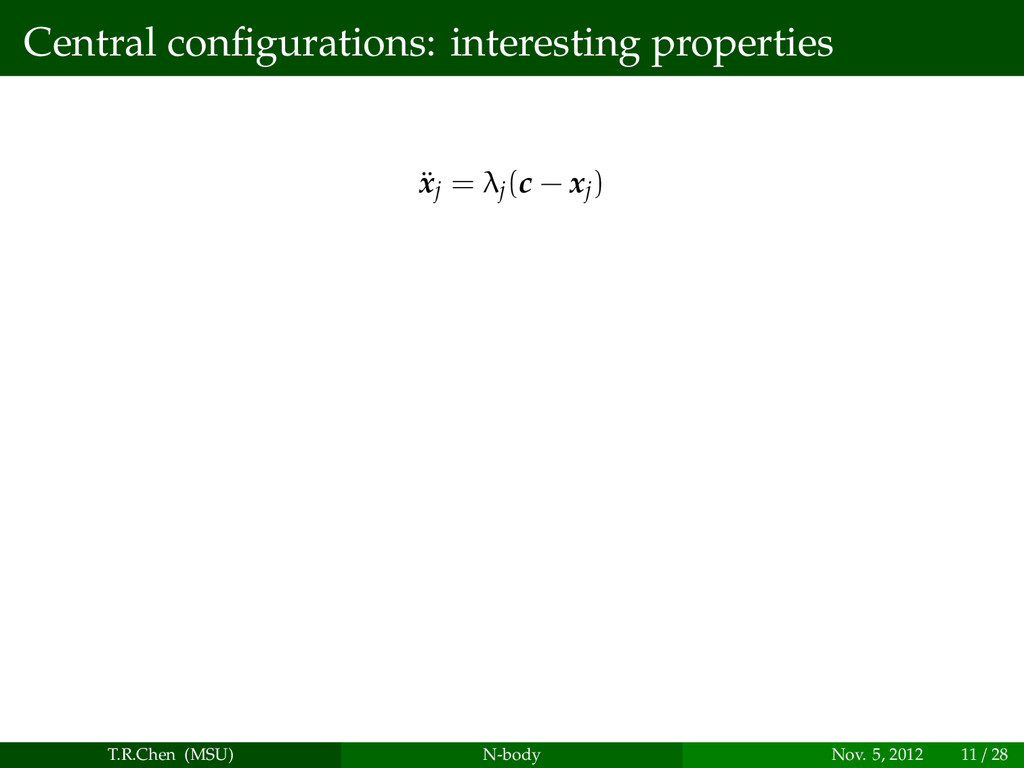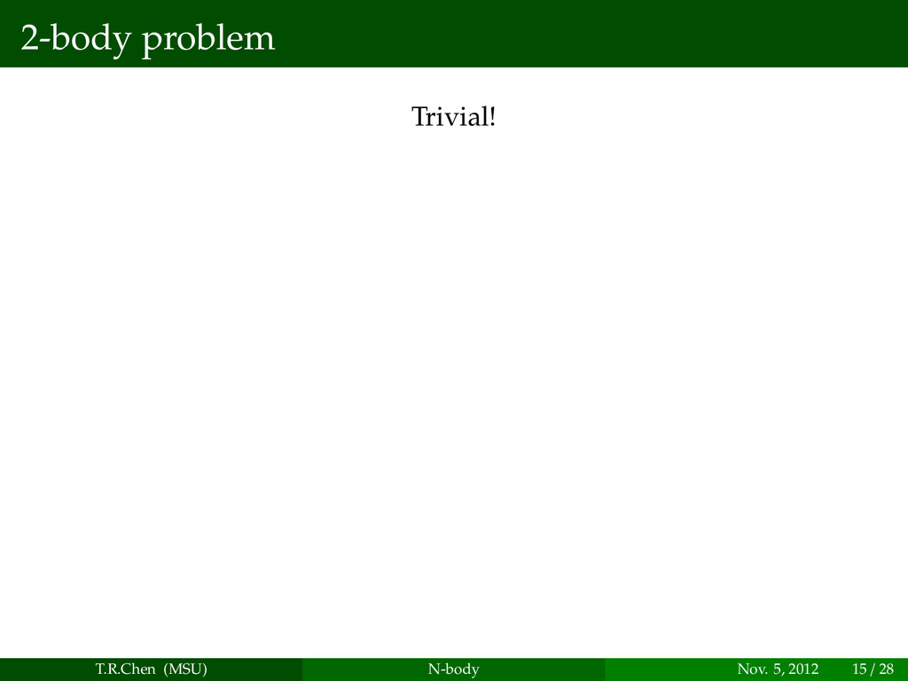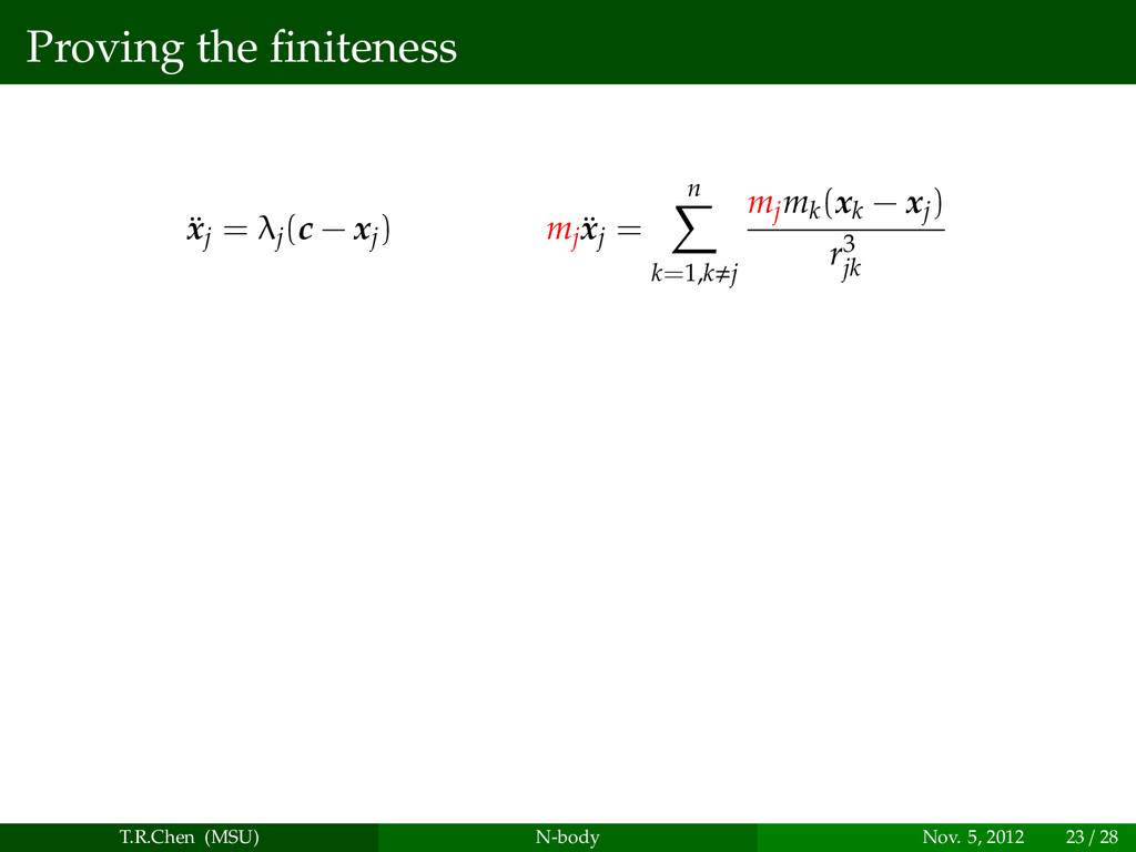 . . . , zm) = P1(z1, . . . , zm) . . . Pm(z1, . . . , zm) finite? If yes, then we have the finiteness of planar central configurations. Tropism: . . . P(z1, . . . , zm) = 0 has tropisms no tropisms =⇒ Finite number of solutions T.R.Chen (MSU) N-body Nov. 5, 2012 25 / 28