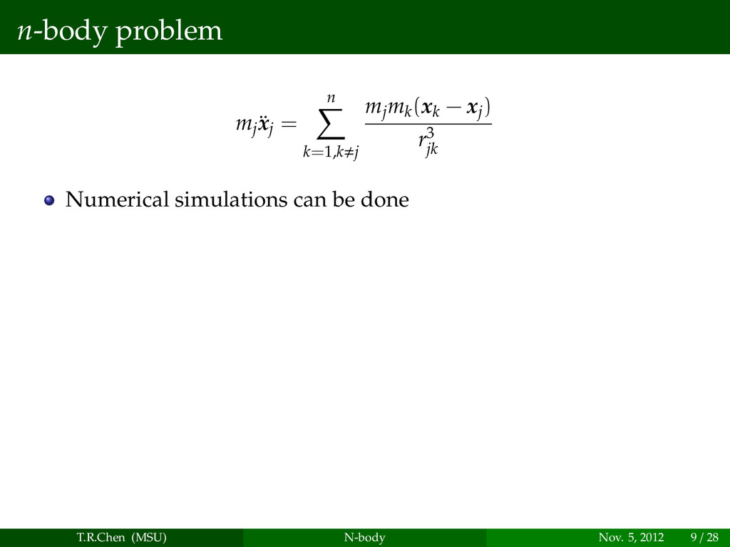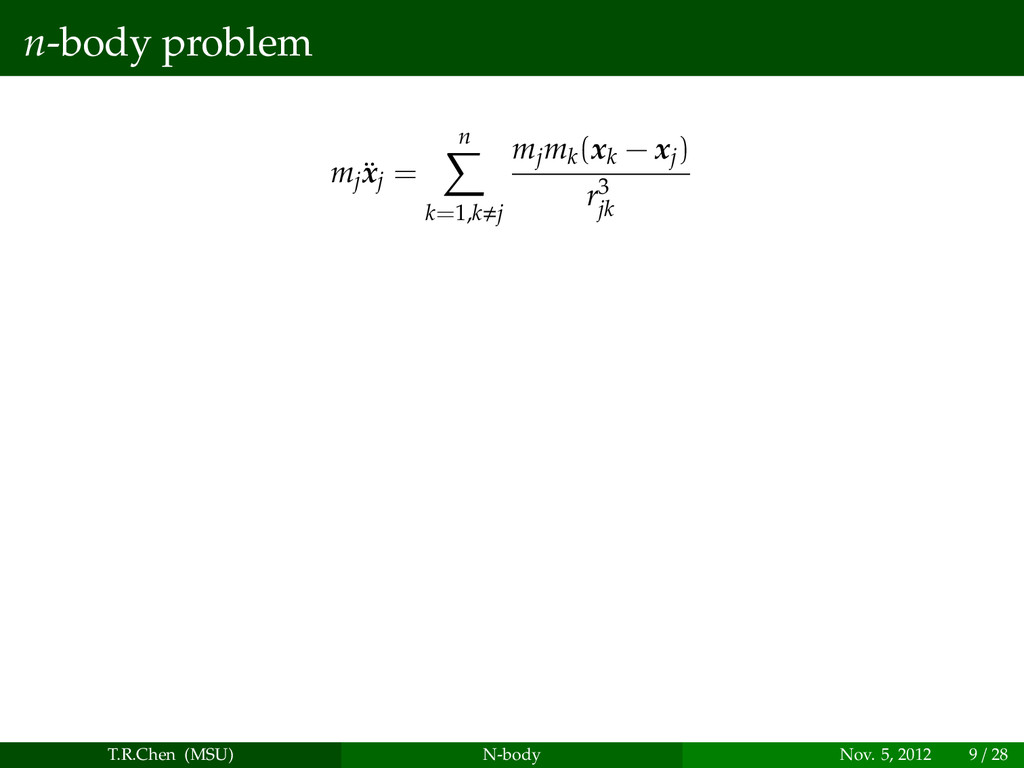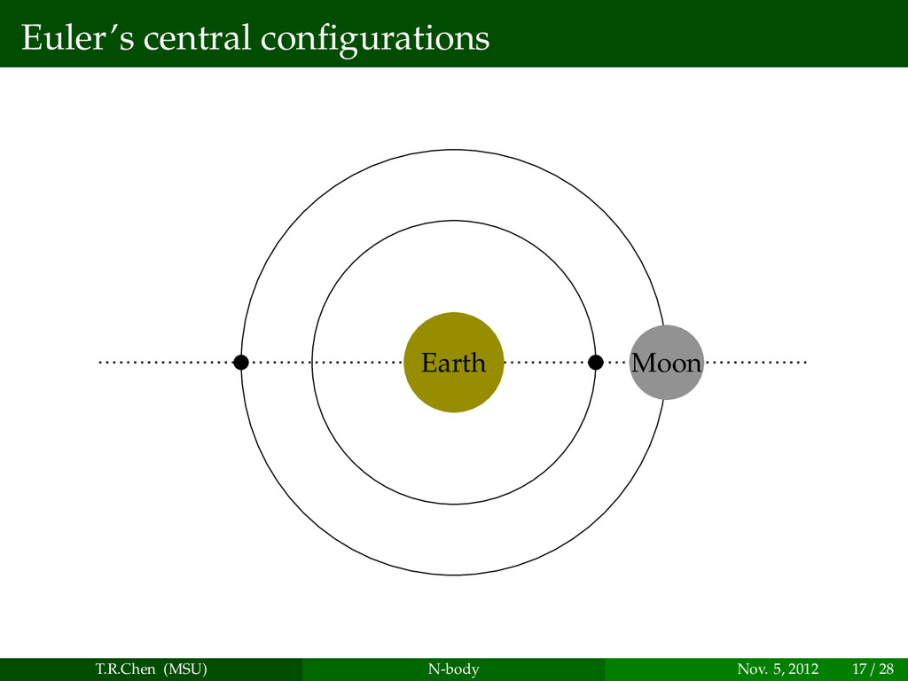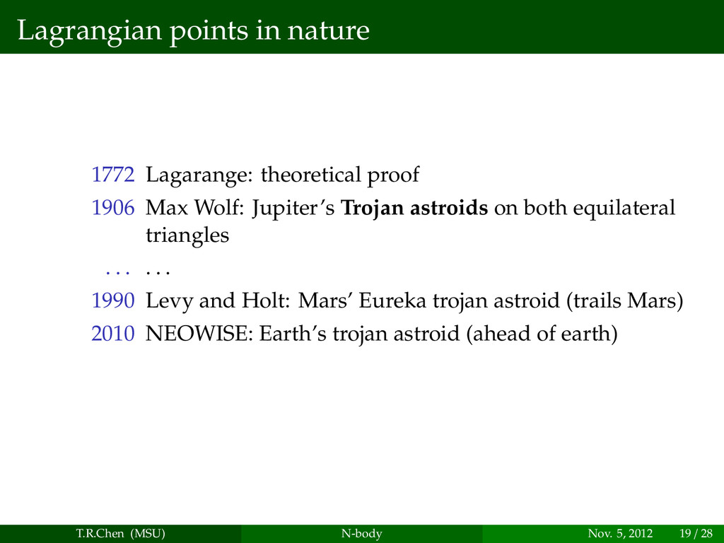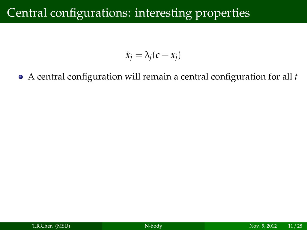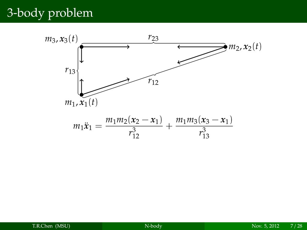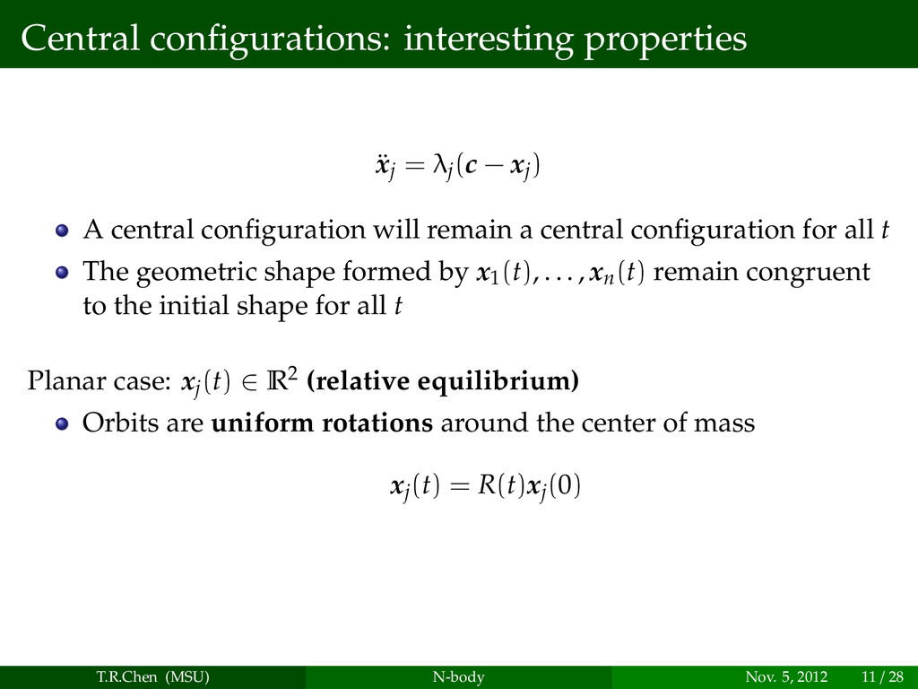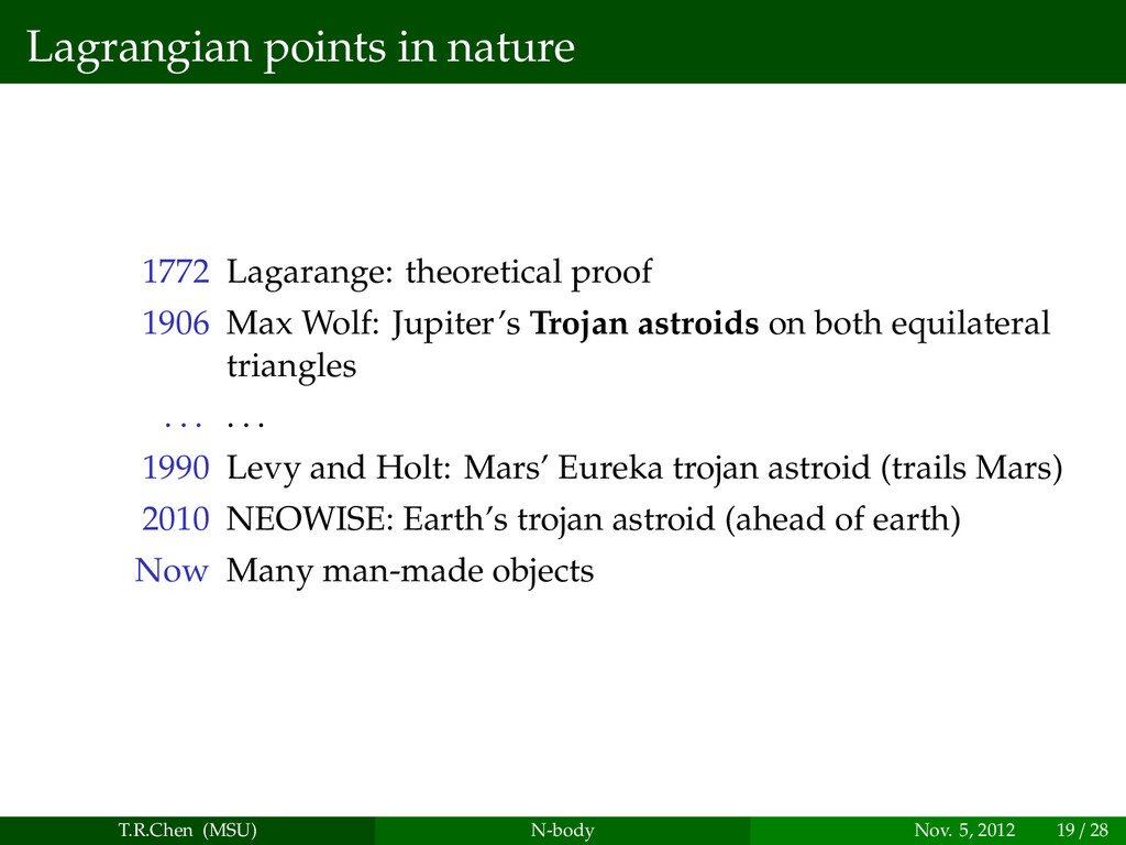 . . . , zm) = P1(z1, . . . , zm) . . . Pm(z1, . . . , zm) finite? If yes, then we have the finiteness of planar central configurations. Tropism: . . . P(z1, . . . , zm) = 0 has tropisms no tropisms =⇒ Finite number of solutions T.R.Chen (MSU) N-body Nov. 5, 2012 25 / 28
