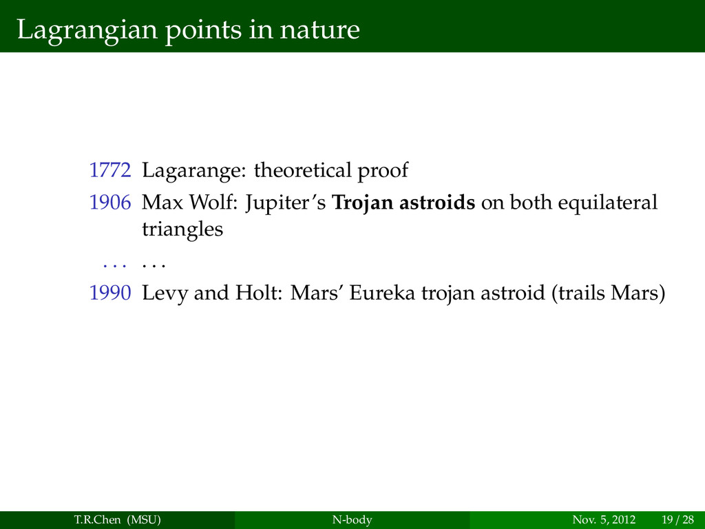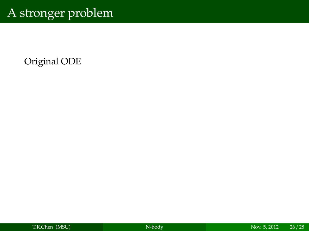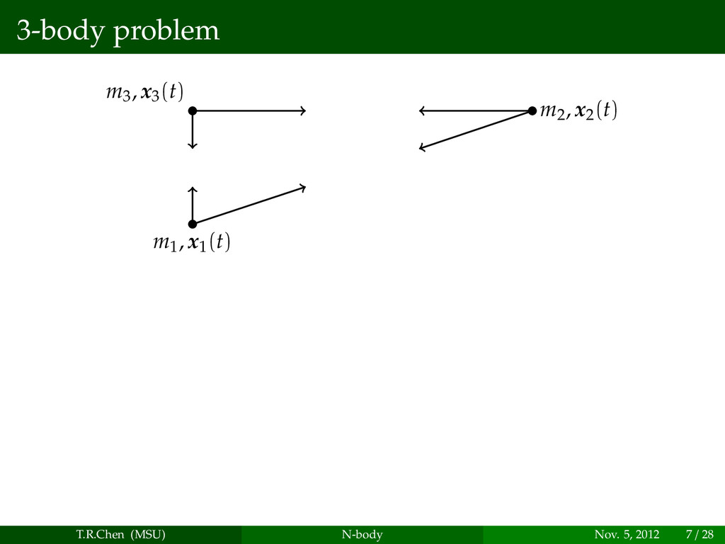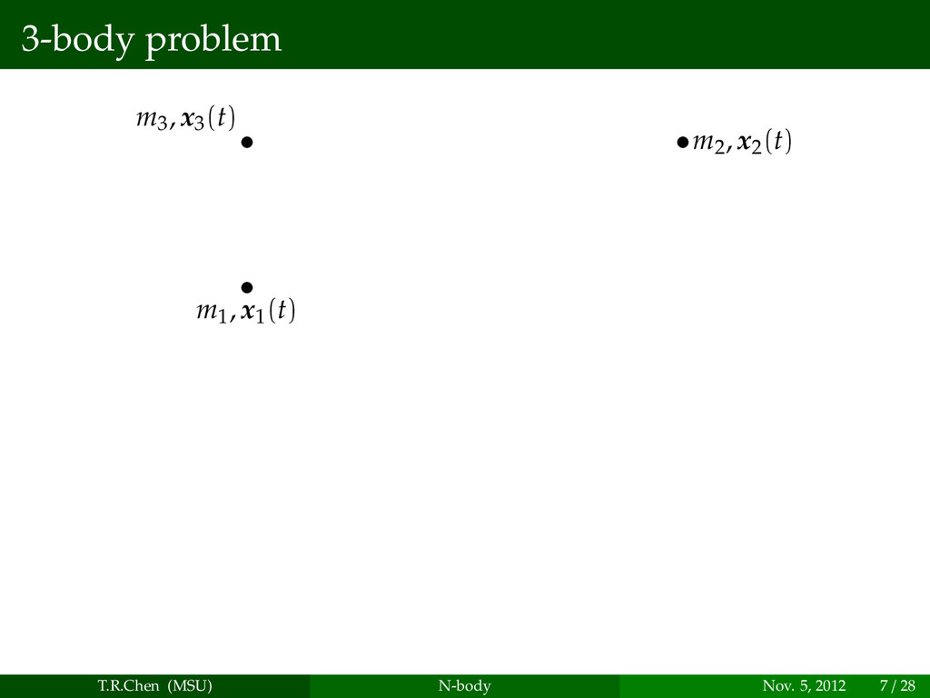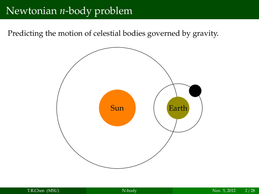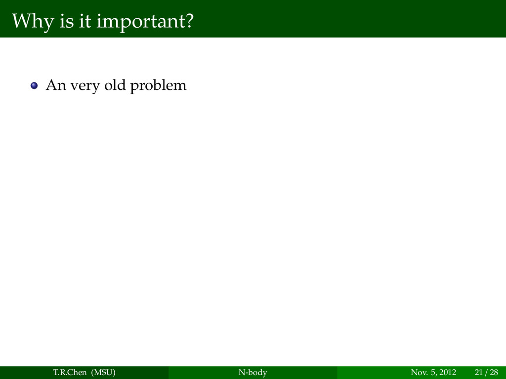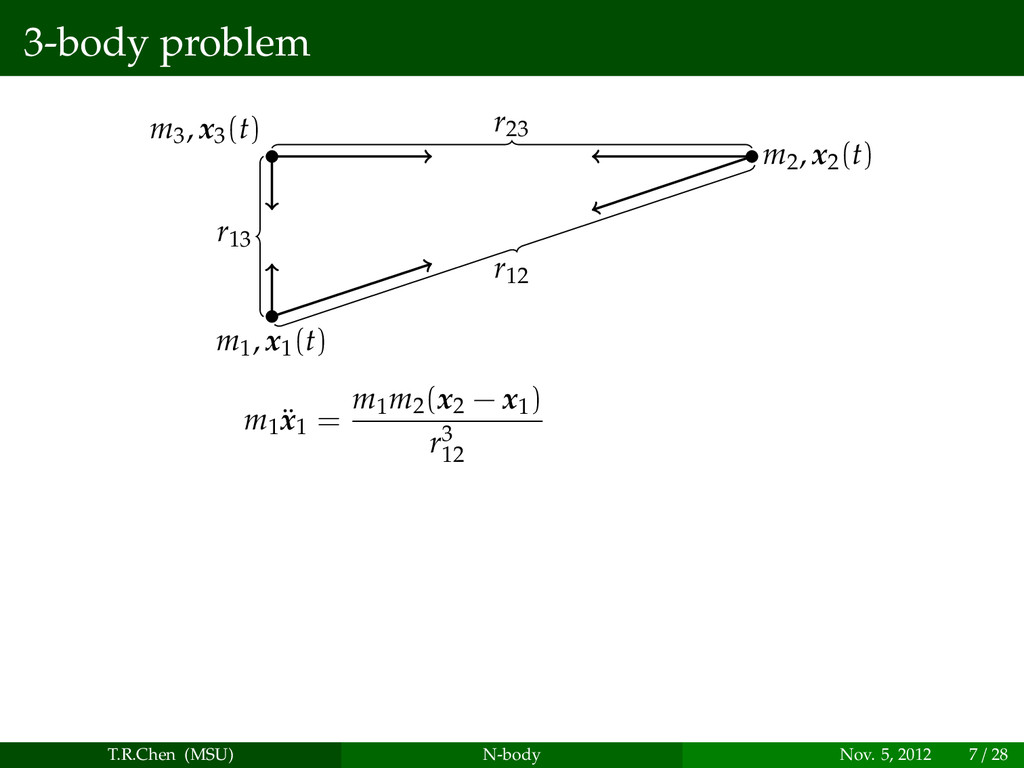 . . . , zm) = P1(z1, . . . , zm) . . . Pm(z1, . . . , zm) finite? If yes, then we have the finiteness of planar central configurations. Tropism: . . . P(z1, . . . , zm) = 0 has tropisms no tropisms =⇒ Finite number of solutions T.R.Chen (MSU) N-body Nov. 5, 2012 25 / 28