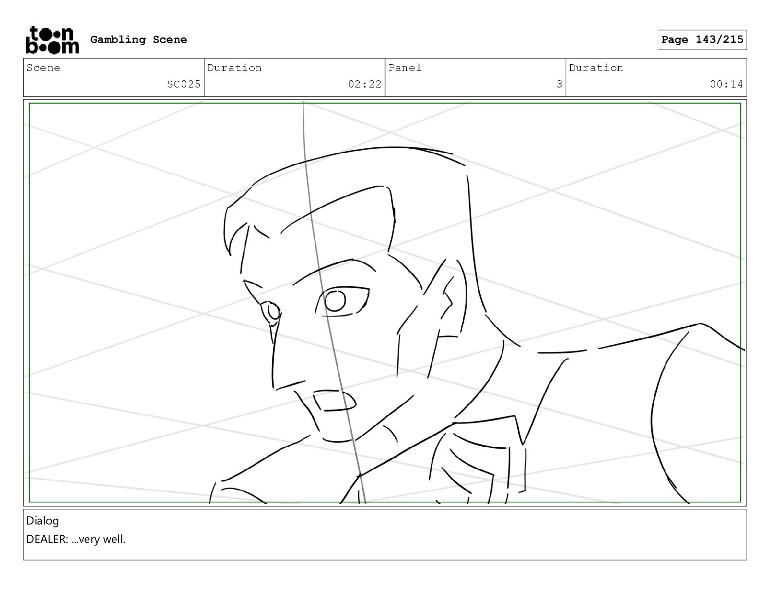 Scene SC025 Duration 02:22 Panel 3 Duration 00:14 Dialog DEALER:
