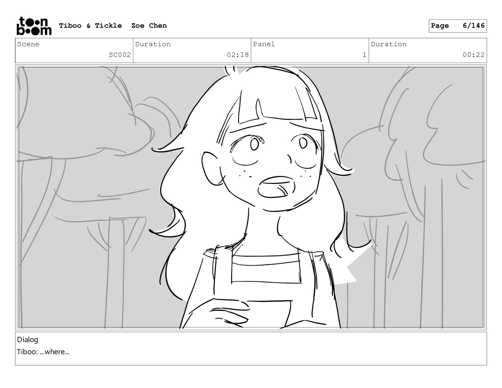 Scene SC002 Duration 02:18 Panel 1 Duration 00:22 Dialog Tiboo: