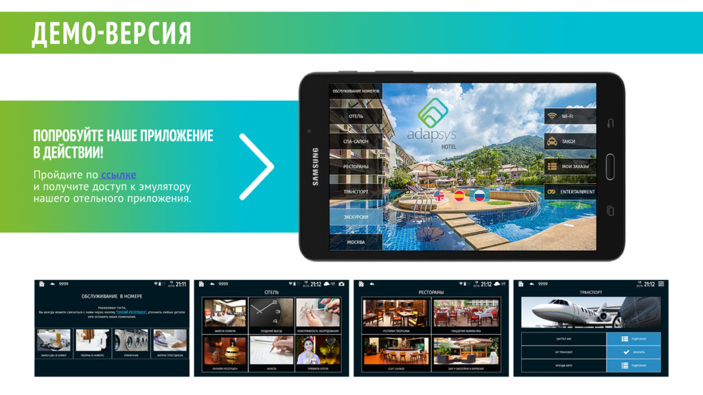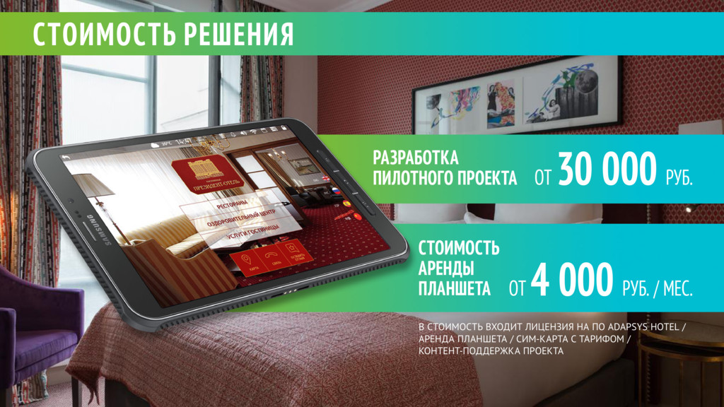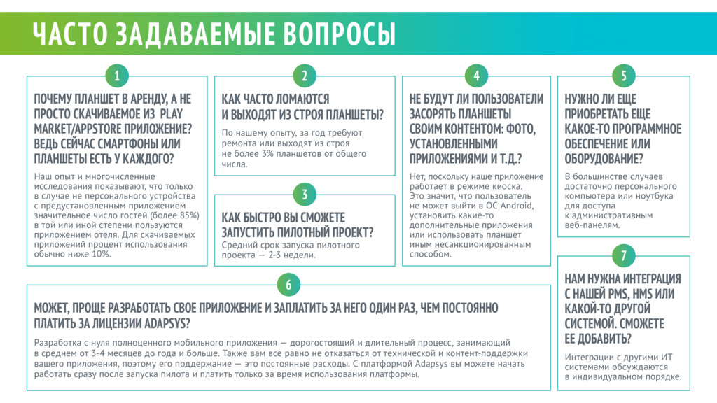 СКАЧИВАЕМОЕ ИЗ PLAY MARKET/APPSTORE ПРИЛОЖЕНИЕ? ВЕДЬ СЕЙЧАС СМАРТФОНЫ ИЛИ ПЛАНШЕТЫ ЕСТЬ У КАЖДОГО? МОЖЕТ, ПРОЩЕ РАЗРАБОТАТЬ СВОЕ ПРИЛОЖЕНИЕ И ЗАПЛАТИТЬ ЗА НЕГО ОДИН РАЗ, ЧЕМ ПОСТОЯННО ПЛАТИТЬ ЗА ЛИЦЕНЗИИ ADAPSYS? НЕ БУДУТ ЛИ ПОЛЬЗОВАТЕЛИ ЗАСОРЯТЬ ПЛАНШЕТЫ СВОИМ КОНТЕНТОМ: ФОТО, УСТАНОВЛЕННЫМИ ПРИЛОЖЕНИЯМИ И Т.Д.? НУЖНО ЛИ ЕЩЕ ПРИОБРЕТАТЬ ЕЩЕ КАКОЕ-ТО ПРОГРАММНОЕ ОБЕСПЕЧЕНИЕ ИЛИ ОБОРУДОВАНИЕ? НАМ НУЖНА ИНТЕГРАЦИЯ С НАШЕЙ PMS, HMS ИЛИ КАКОЙ-ТО ДРУГОЙ СИСТЕМОЙ. СМОЖЕТЕ ЕЕ ДОБАВИТЬ? КАК ЧАСТО ЛОМАЮТСЯ И ВЫХОДЯТ ИЗ СТРОЯ ПЛАНШЕТЫ? КАК БЫСТРО ВЫ СМОЖЕТЕ ЗАПУСТИТЬ ПИЛОТНЫЙ ПРОЕКТ? Наш опыт и многочисленные исследования показывают, что только в случае не персонального устройства с предустановленным приложением значительное число гостей (более 85%) в той или иной степени пользуются приложением отеля. Для скачиваемых приложений процент использования обычно ниже 10%. Разработка с нуля полноценного мобильного приложения — дорогостоящий и длительный процесс, занимающий в среднем от 3-4 месяцев до года и больше. Также вам все равно не отказаться от технической и контент-поддержки вашего приложения, поэтому его поддержание — это постоянные расходы. С платформой Adapsys вы можете начать работать сразу после запуска пилота и платить только за время использования платформы. Нет, поскольку наше приложение работает в режиме киоска. Это значит, что пользователь не может выйти в ОС Android, установить какие-то дополнительные приложения или использовать планшет иным несанкционированным способом. В большинстве случаев достаточно персонального компьютера или ноутбука для доступа к административным веб-панелям. Интеграции с другими ИТ системами обсуждаются в индивидуальном порядке. По нашему опыту, за год требуют ремонта или выходят из строя не более 3% планшетов от общего числа. Средний срок запуска пилотного проекта — 2-3 недели. 1 6 4 5 7 2 3